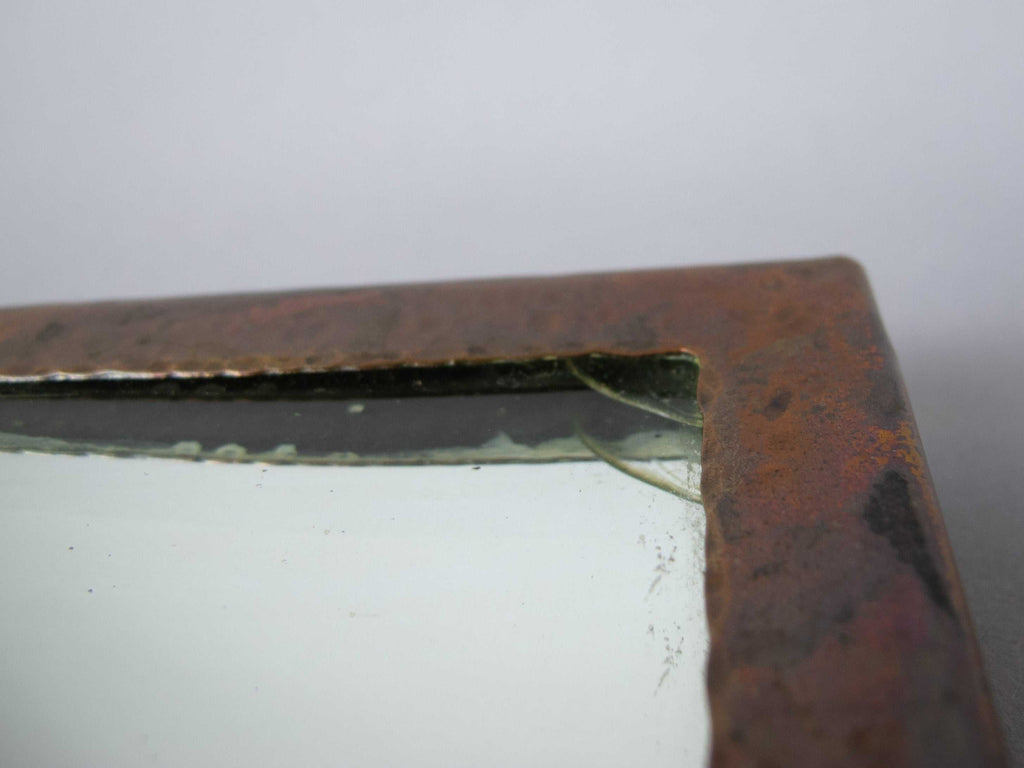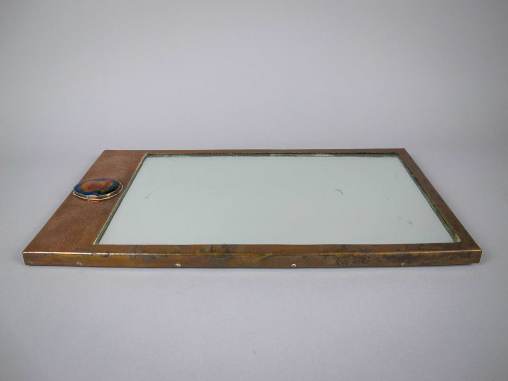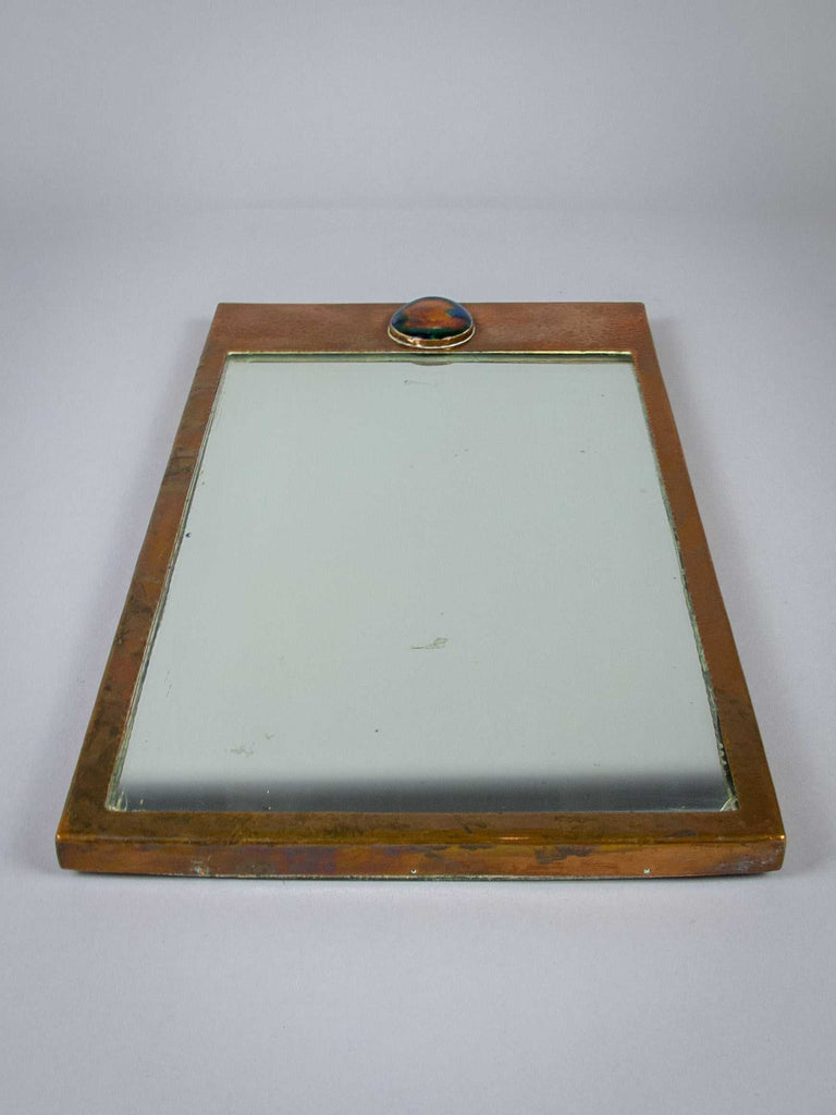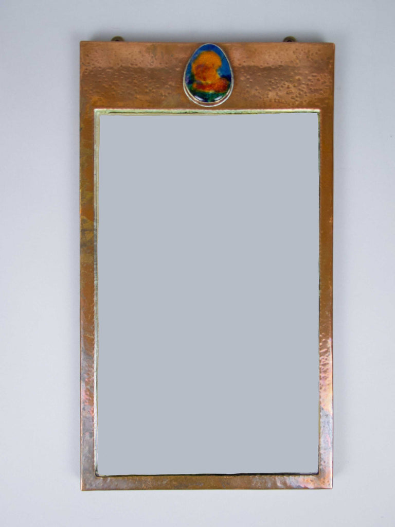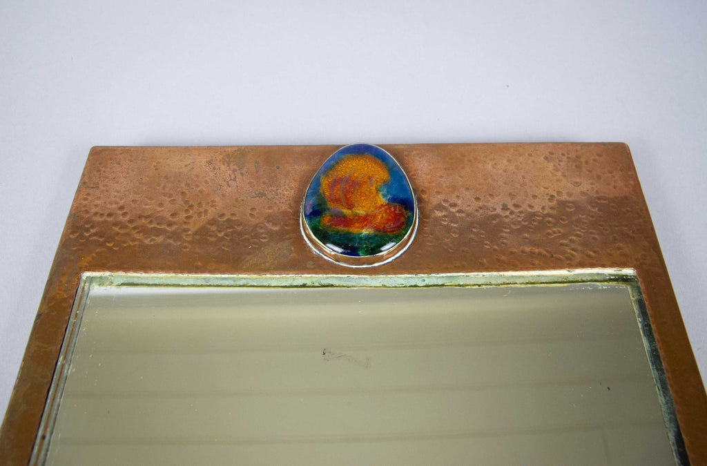 The mirror is an extremely attractive example with a large multi-coloured enamel cabochon to the top, wonderful patina to the copper and original mirror plate and back. The mirror plate shows some small areas of imperfections consistent with age (please see photographs).