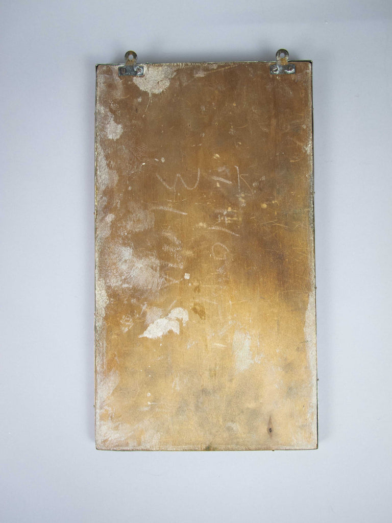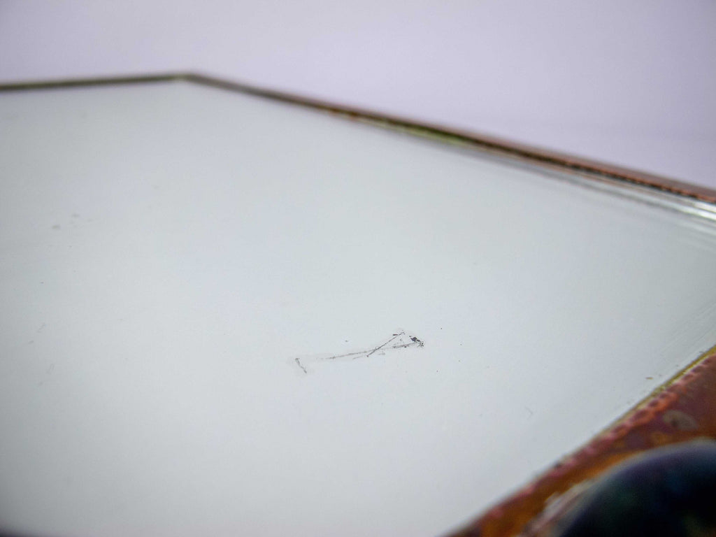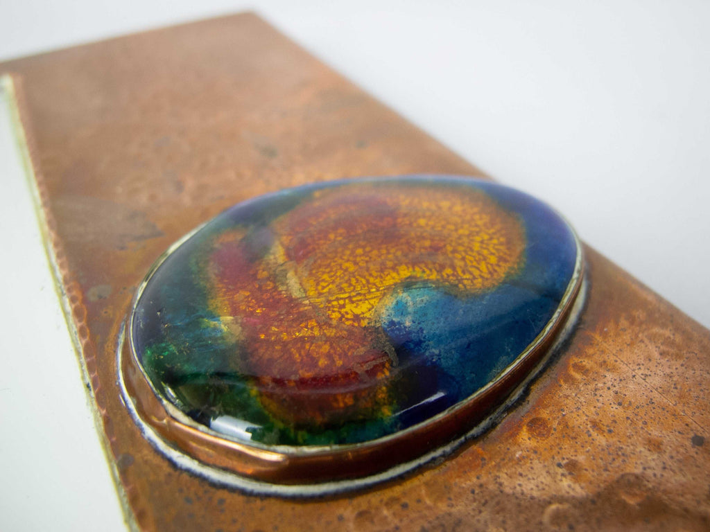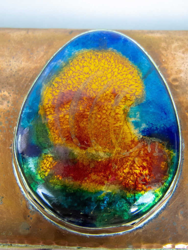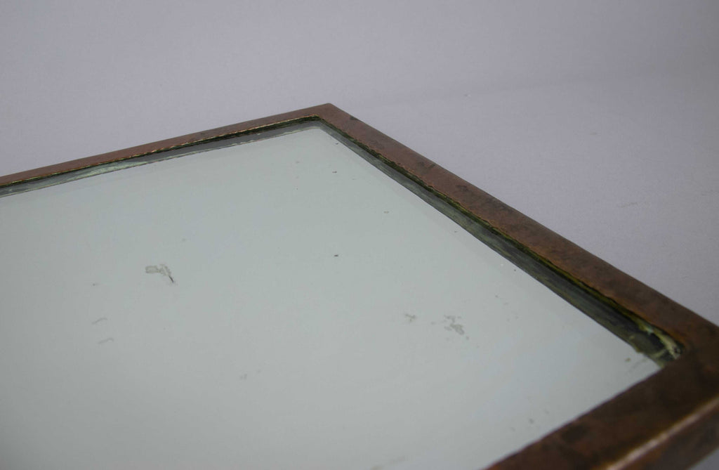 The mirror is an extremely attractive example with a large multi-coloured enamel cabochon to the top, wonderful patina to the copper and original mirror plate and back. The mirror plate shows some small areas of imperfections consistent with age (please see photographs).