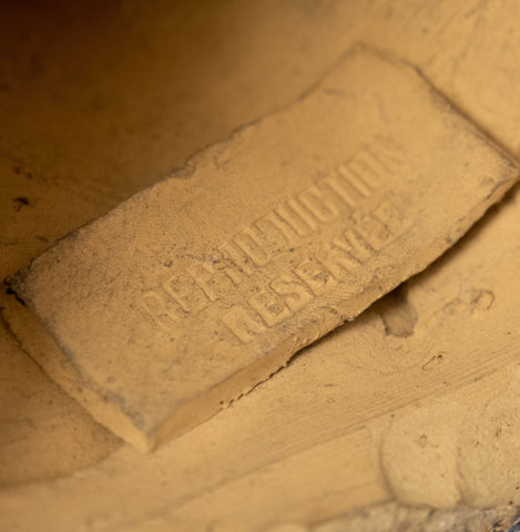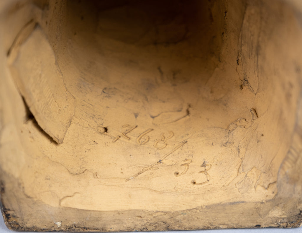 This bust is beautifully proportioned with exceptional detail throughout and a wonderful patina, hinting at its true age. The facial features are both poised and expressive. There is a chip to the left of the robe (please see photographs) but this does not distract from the beauty of the piece. All associated stamps and marks are present, namely the 'Goldscheider' plaque to the rear, model number '768/33' to the inside and the 'Reproduction Reservee' label.