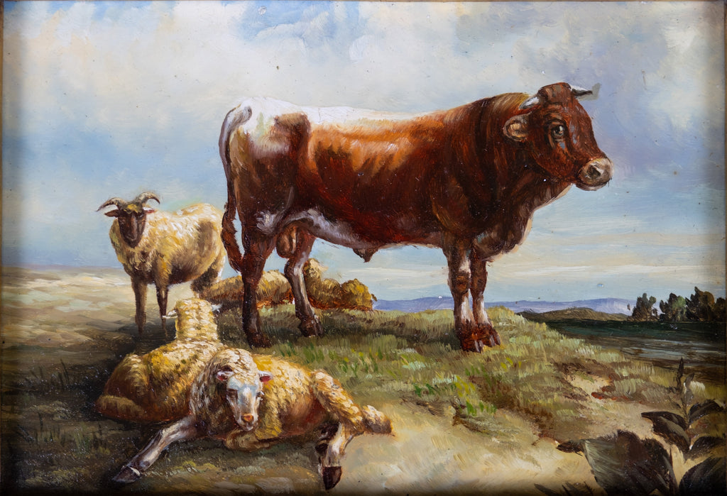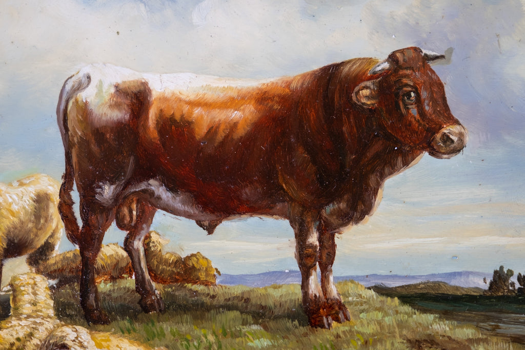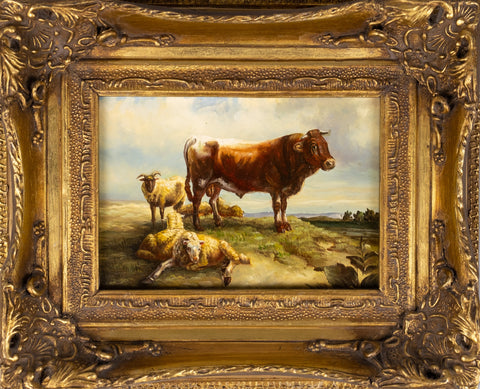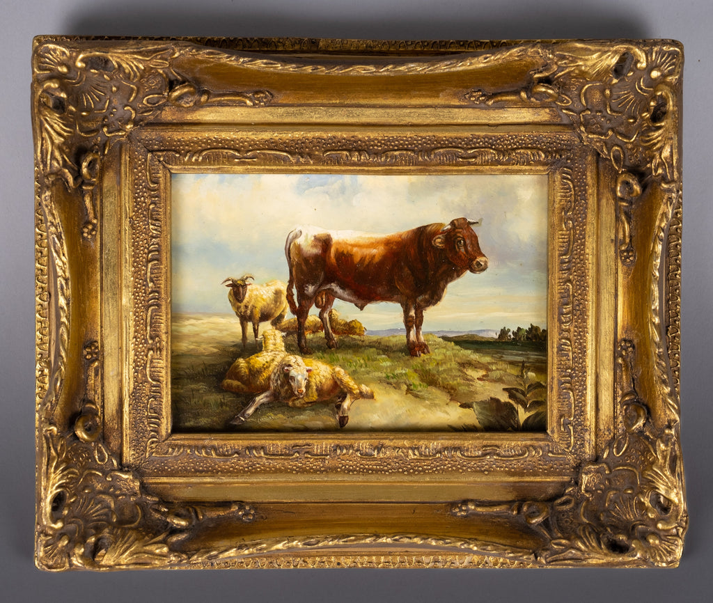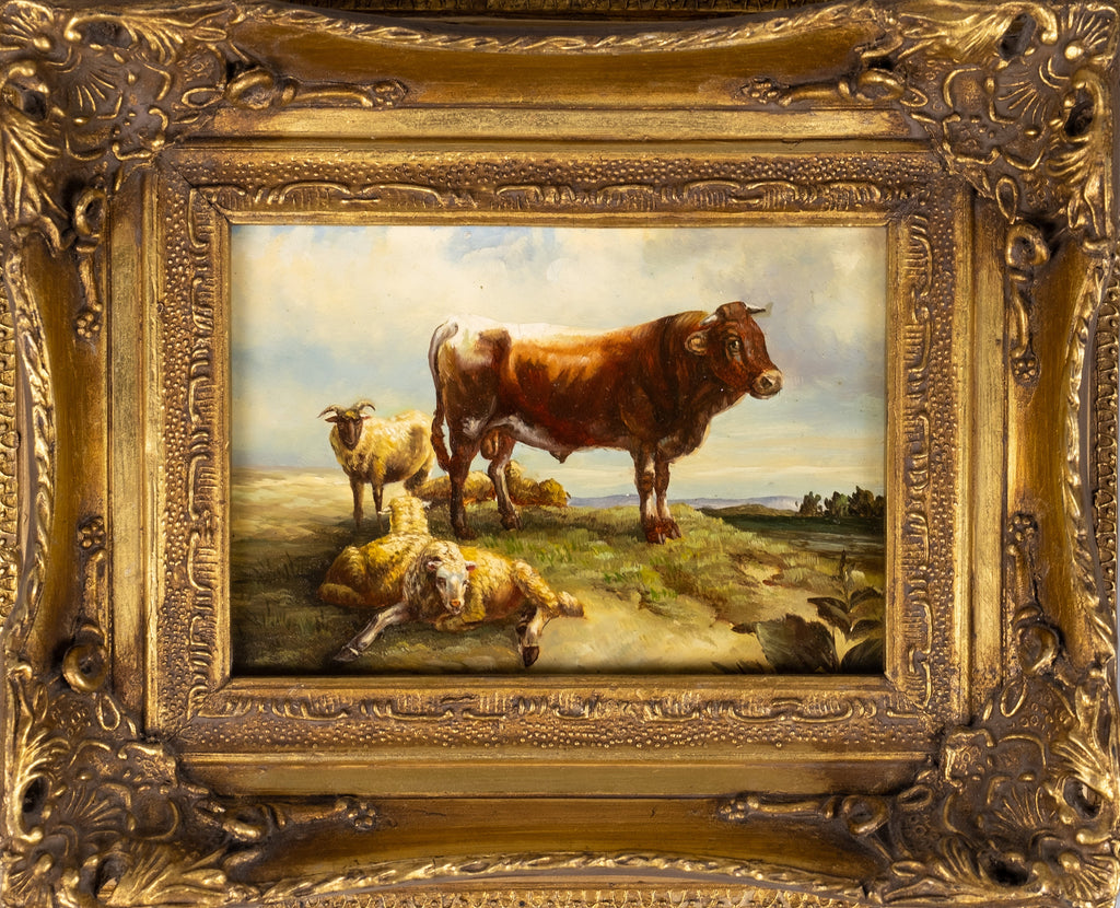 A circle of Thomas Sidney Cooper (1803-1902) oil on board work of diminutive proportions, depicting a cow and grazing sheep on a hill with a rolling landscape.