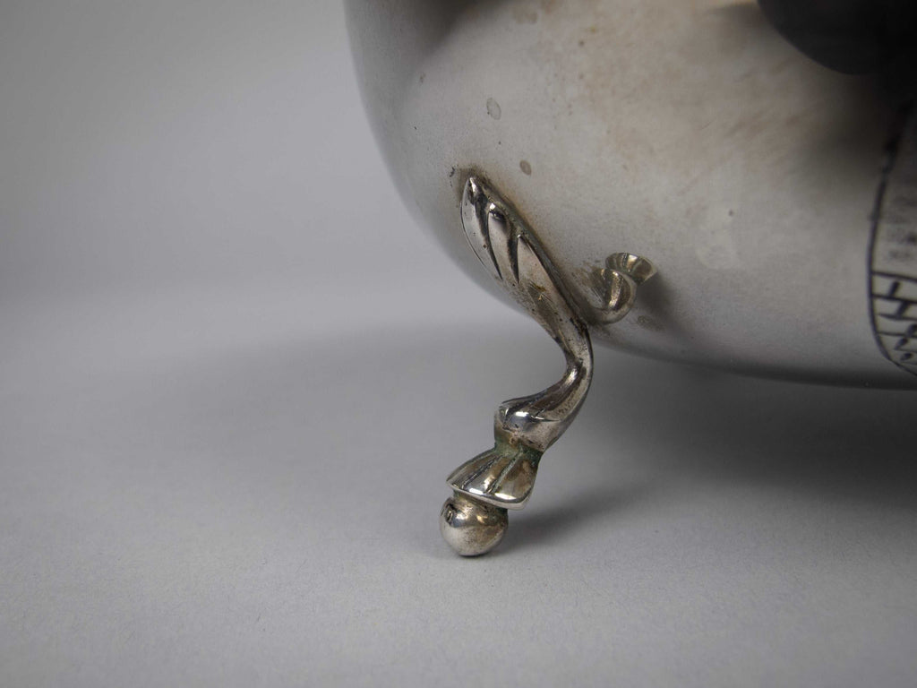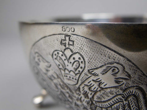 The bowl sits on three legs with ball feet. '800' is stamped above the Byzantine crest and remains clearly visible.
