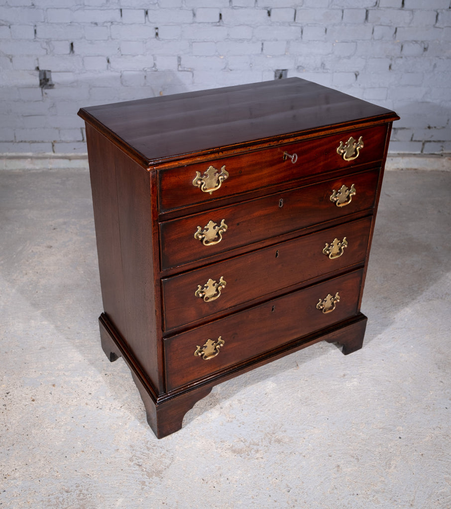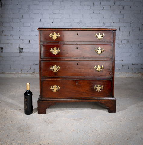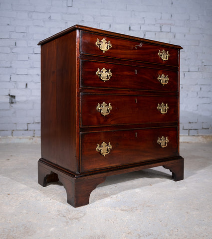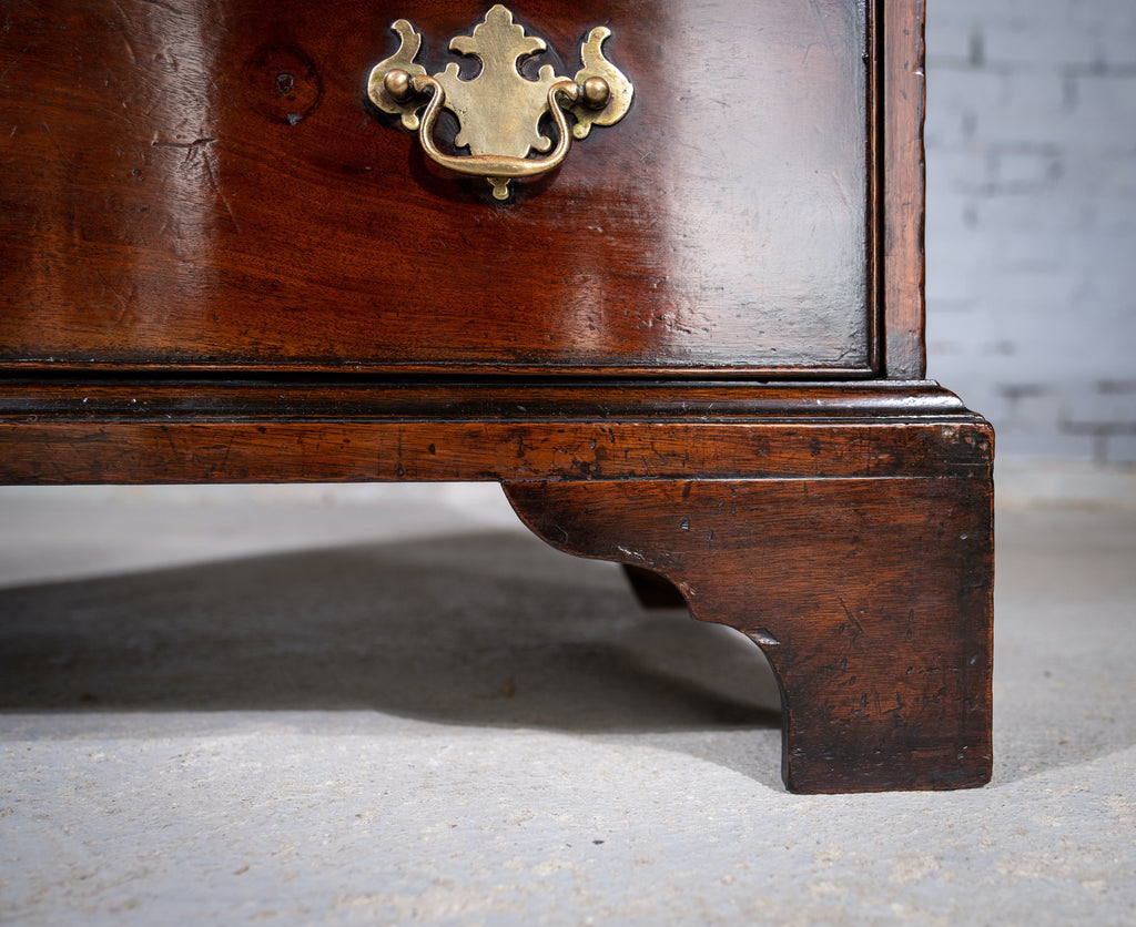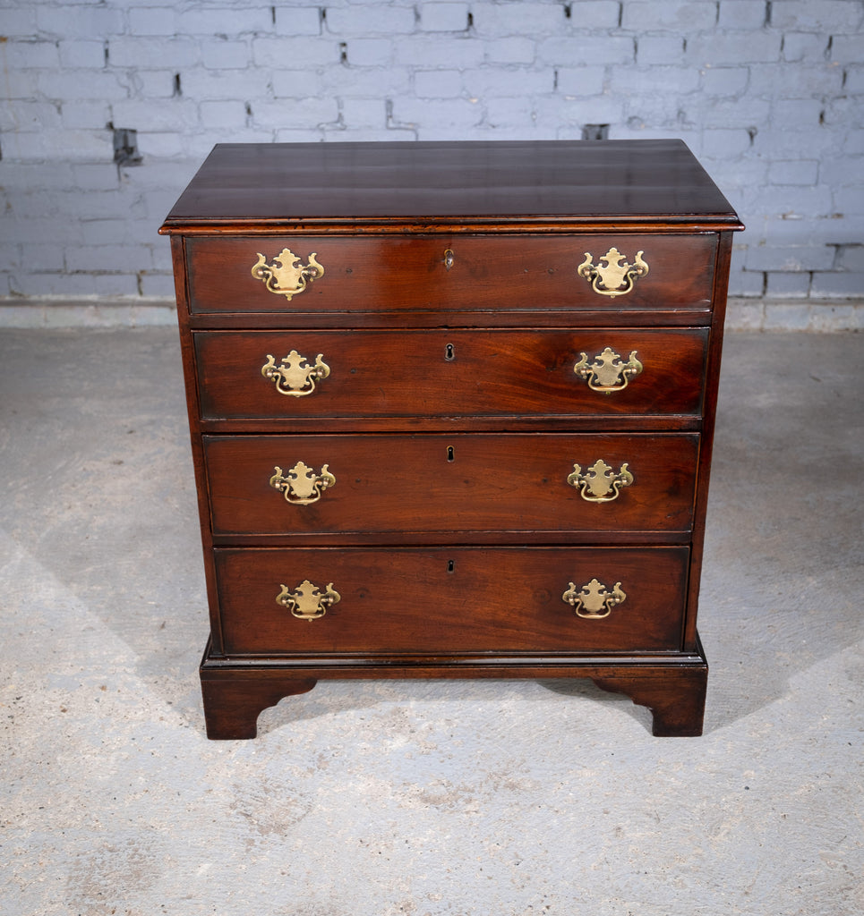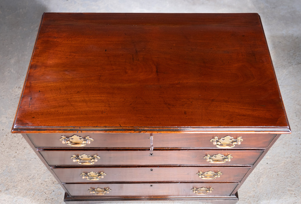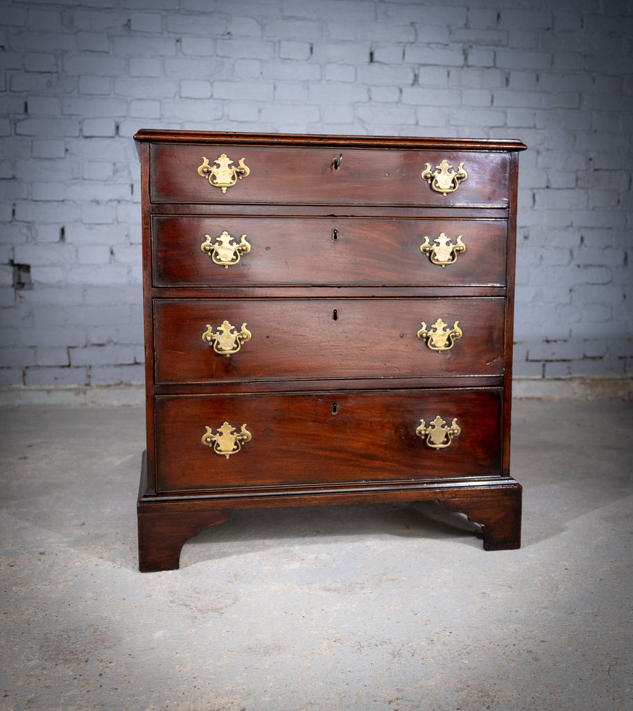 The moulded mahogany top sits above four graduated cockbeaded drawers with later swan neck brasses, the whole raised upon four bracket feet.