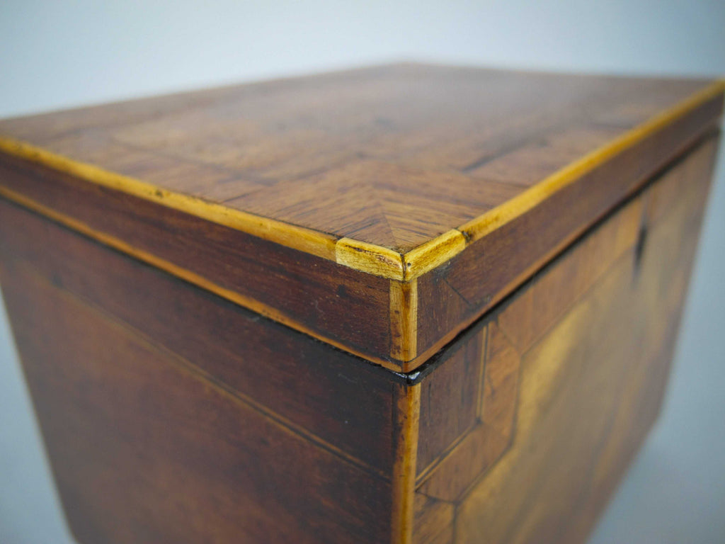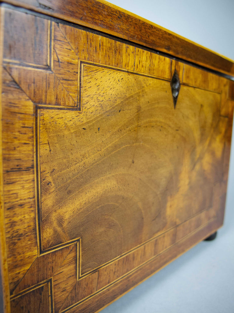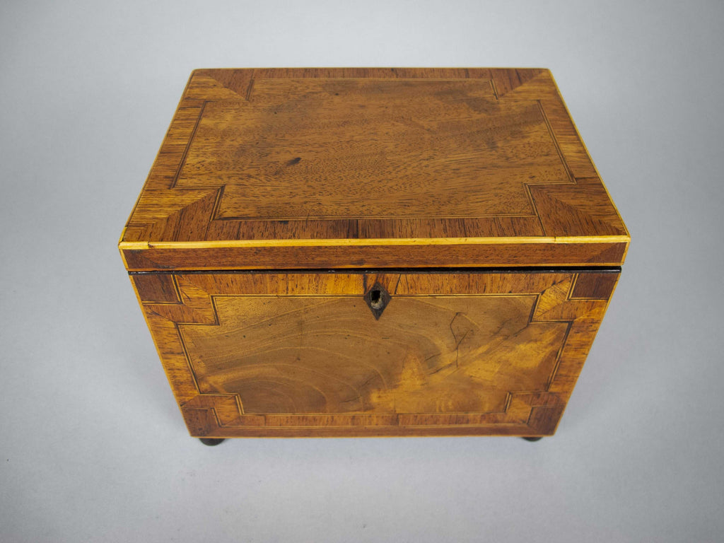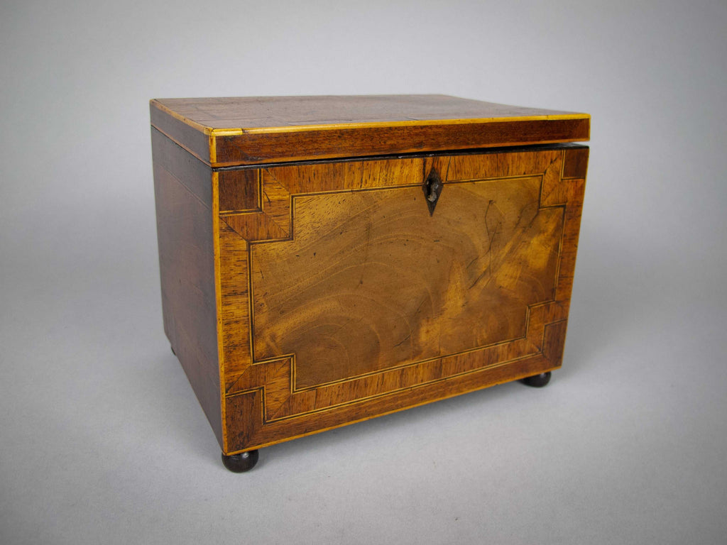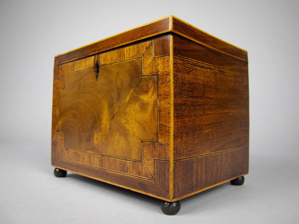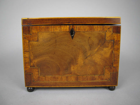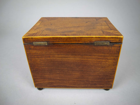An early 19th century mahogany and boxwood veneered tea caddy with bun feet.