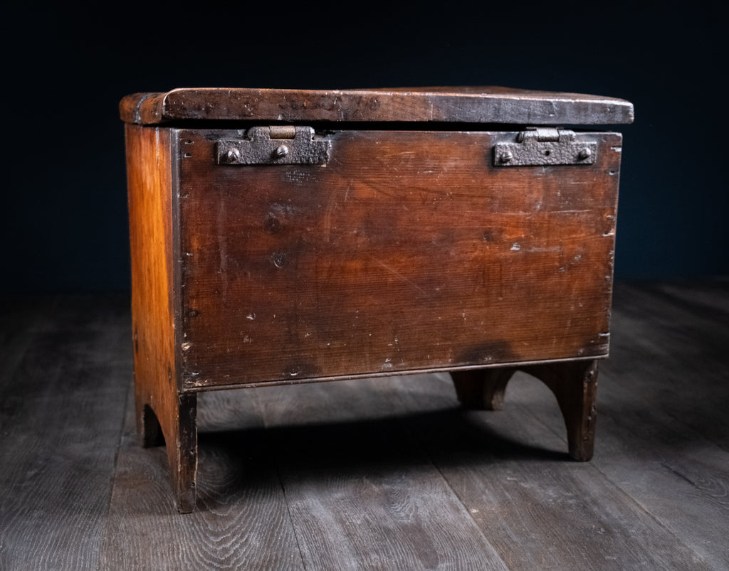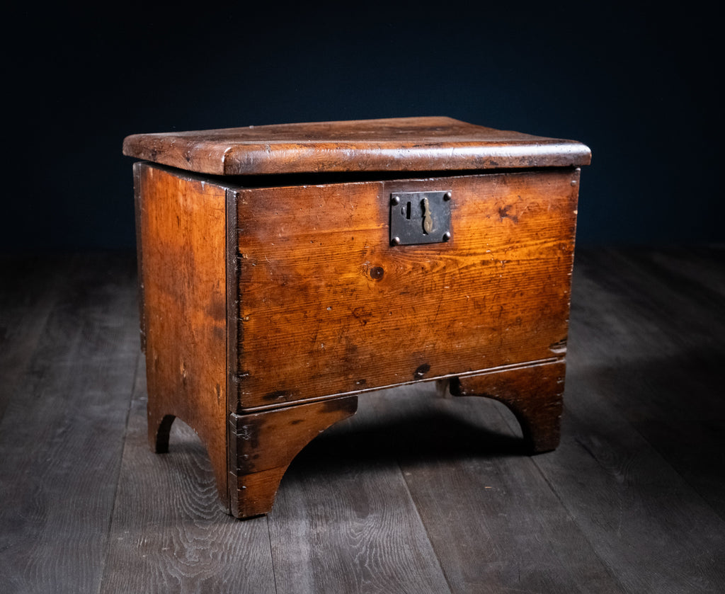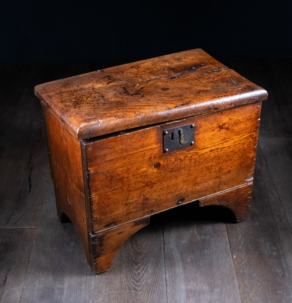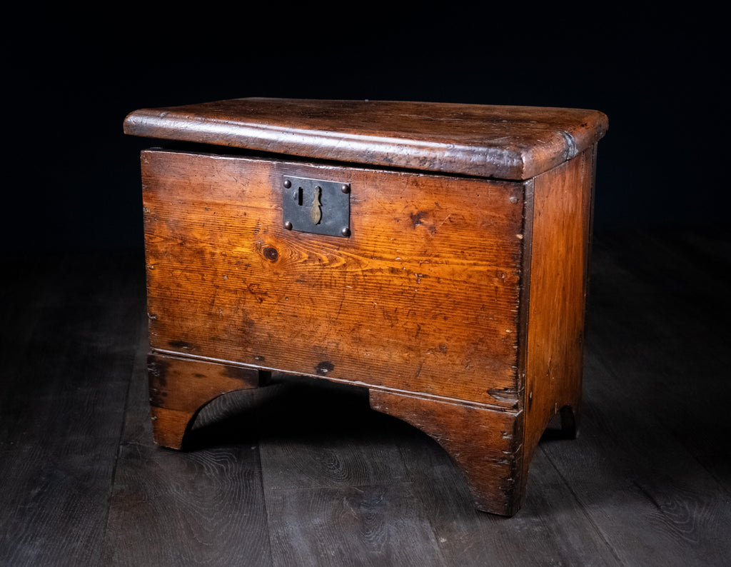 The iron-hinged elm lid sits above a pine body terminating in arched legs.