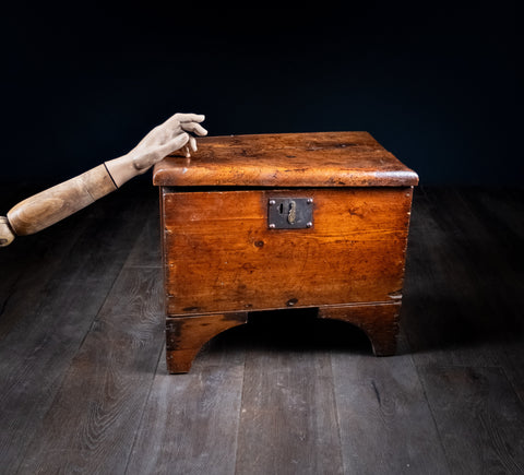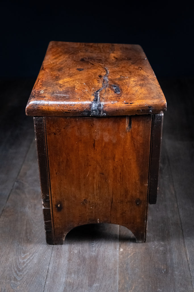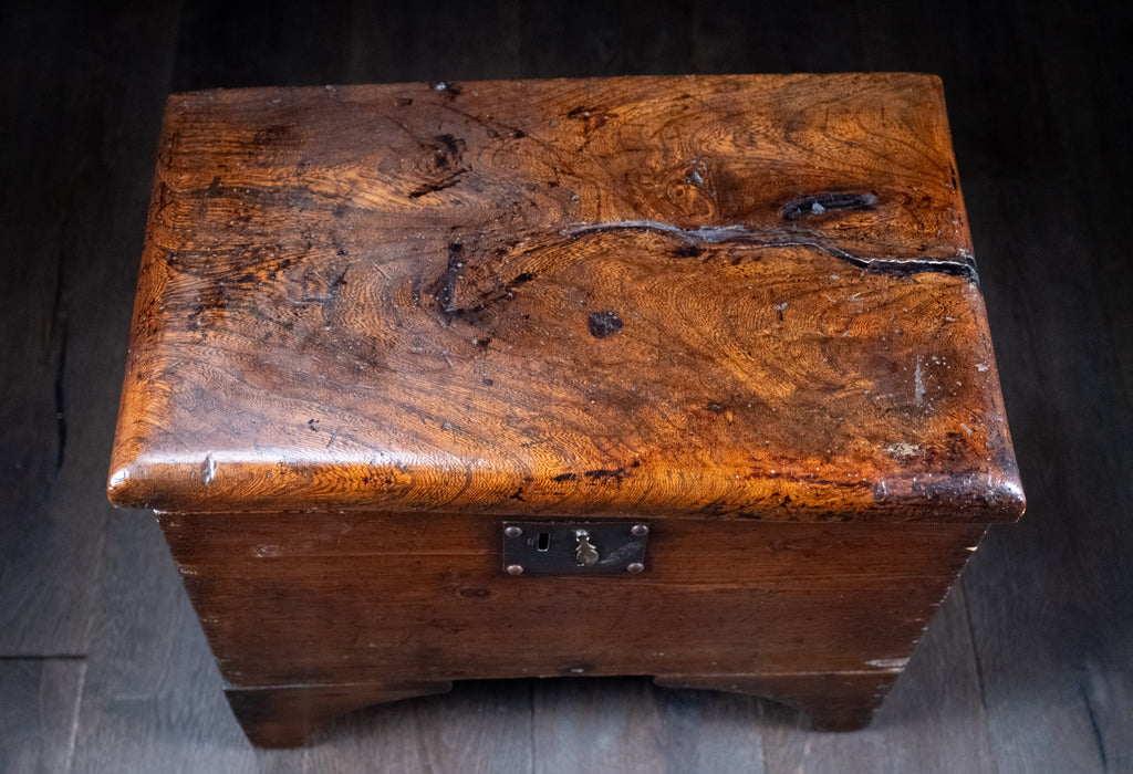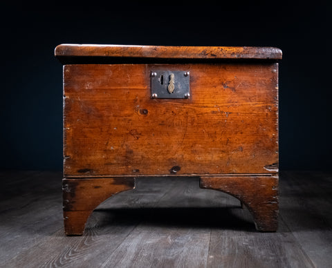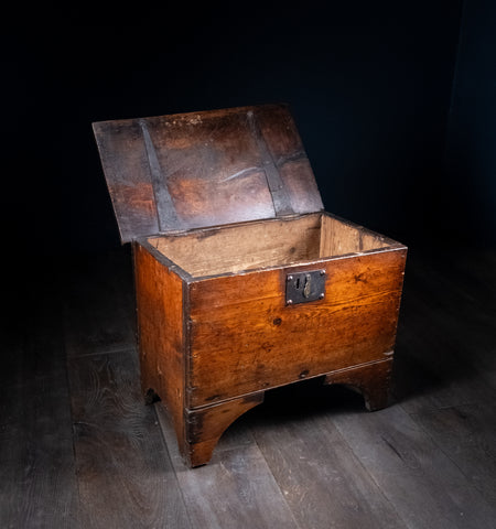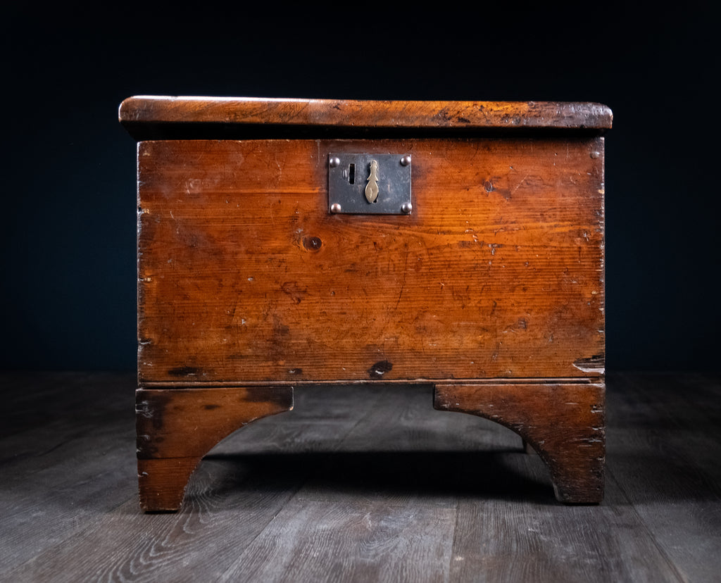 The iron-hinged elm lid sits above a pine body terminating in arched legs.