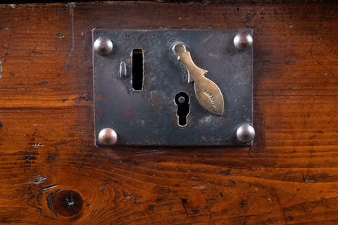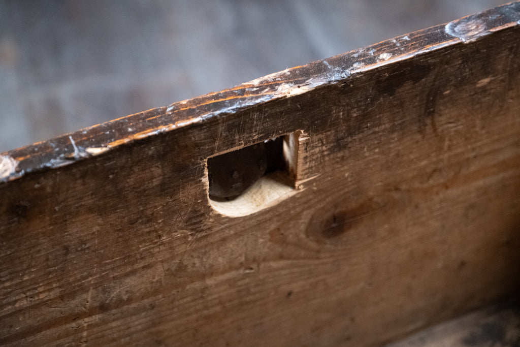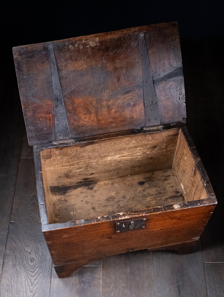 Lots of knock and bumps throughout and signs of historic woodworm (fully treated in abundance of caution). Later lock plate. The elm lid has a warp which means it is lifted slightly to one side when closed.