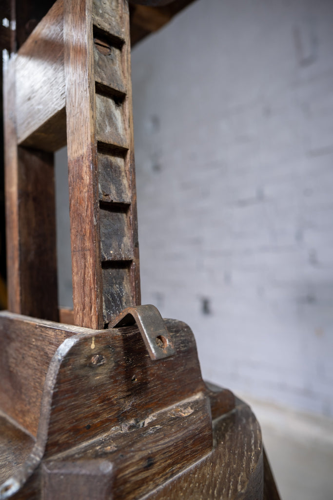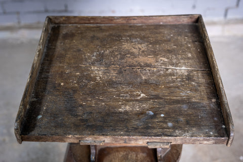 The top is edged to three sides and has a split to the wood but remains strong and stable. The top sits above two ribbed wooden struts which enable the stand to be heightened considerably (to standing height if desired). The stand would have originally had a turning mechanism for heightening and lowering which is no longer present. A small piece of metal has been used as a substitute which holds the stand in place with ease. The top can be tilted in any height position using the side metal keys which all twist and move as they should.