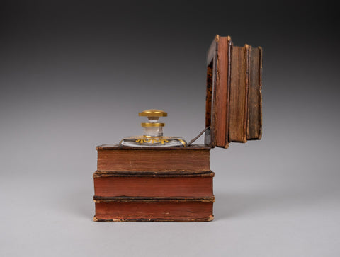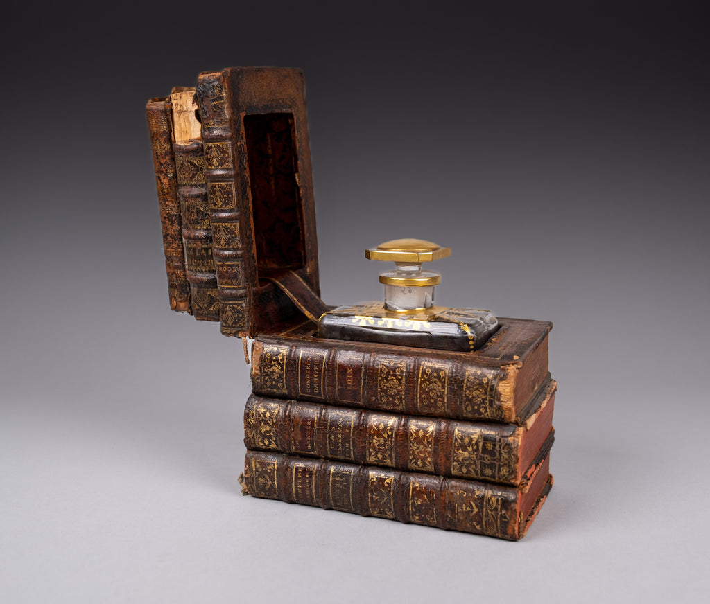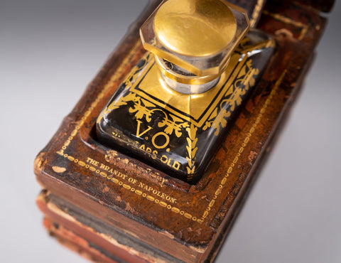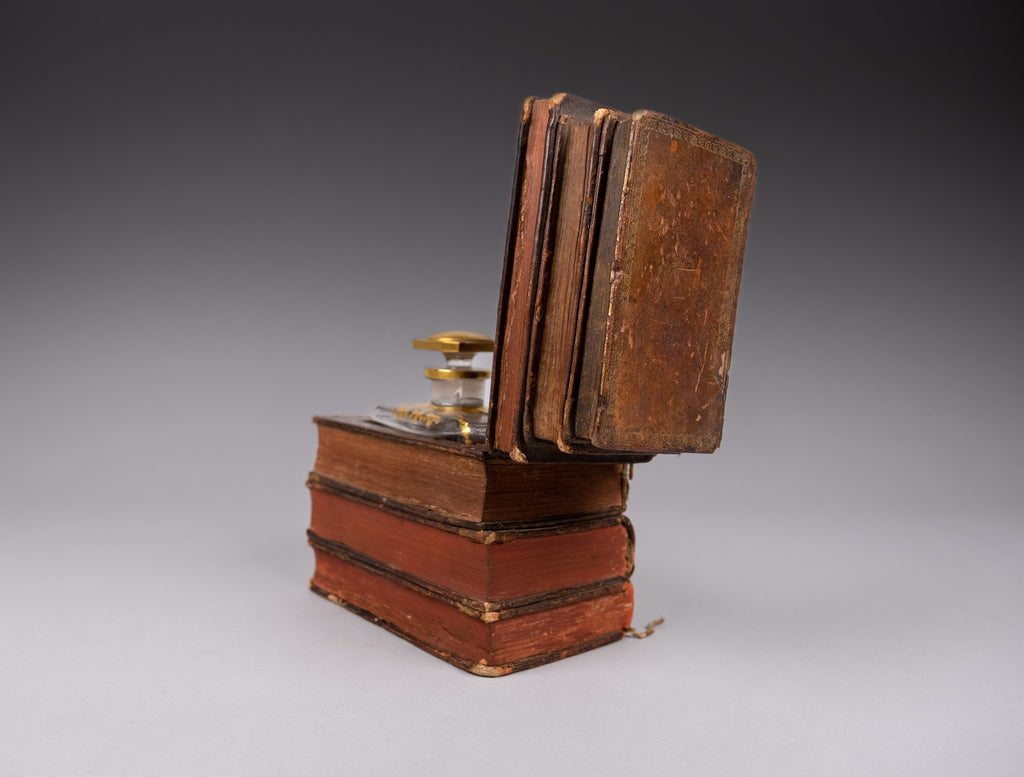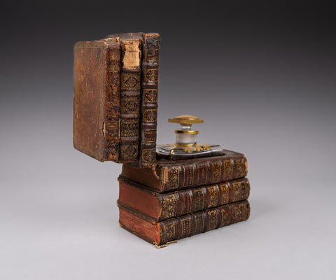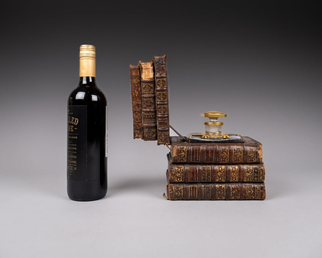 An early 20th Century decanter box formed from adapted 19th century French leather bound books. The interior is fitted with a gilt decorated glass bottle and stamped 'The Brandy Of Napoleon'.