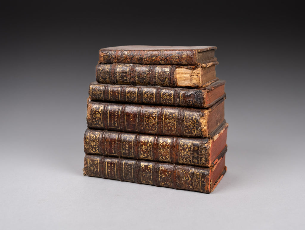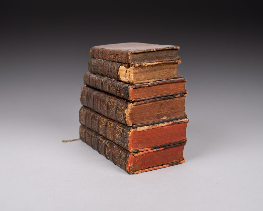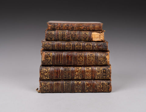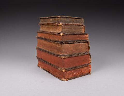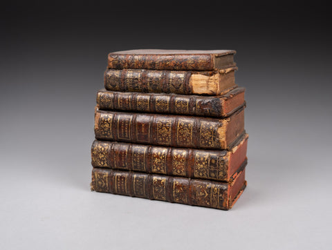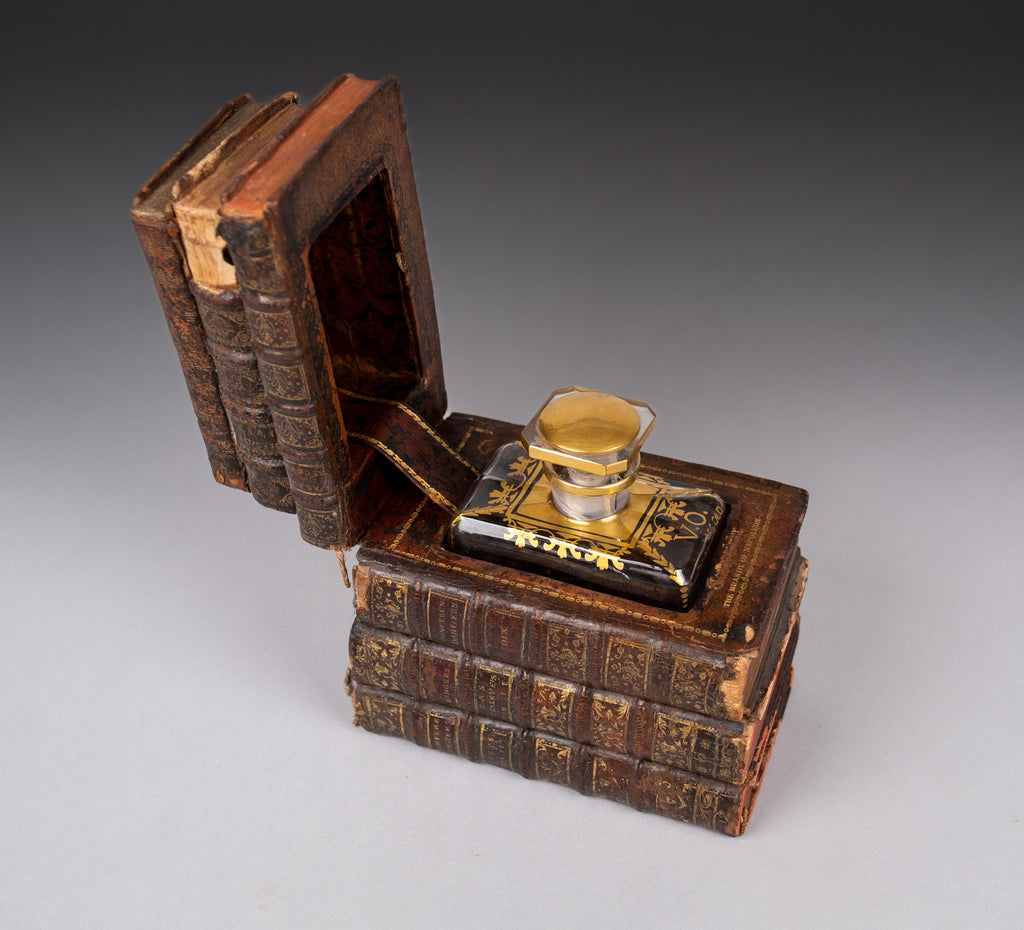 An early 20th Century decanter box formed from adapted 19th century French leather bound books. The interior is fitted with a gilt decorated glass bottle and stamped 'The Brandy Of Napoleon'.