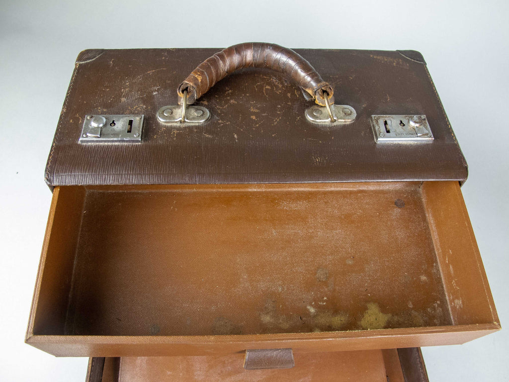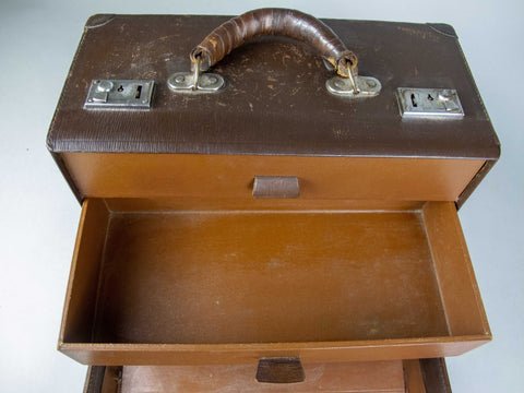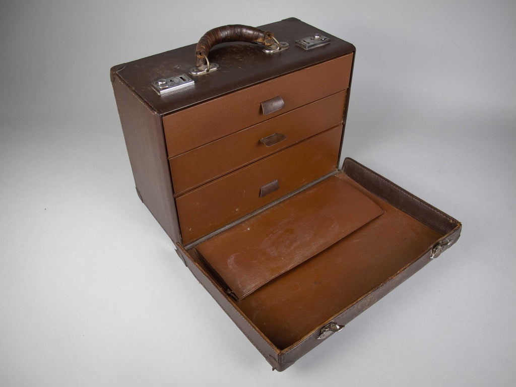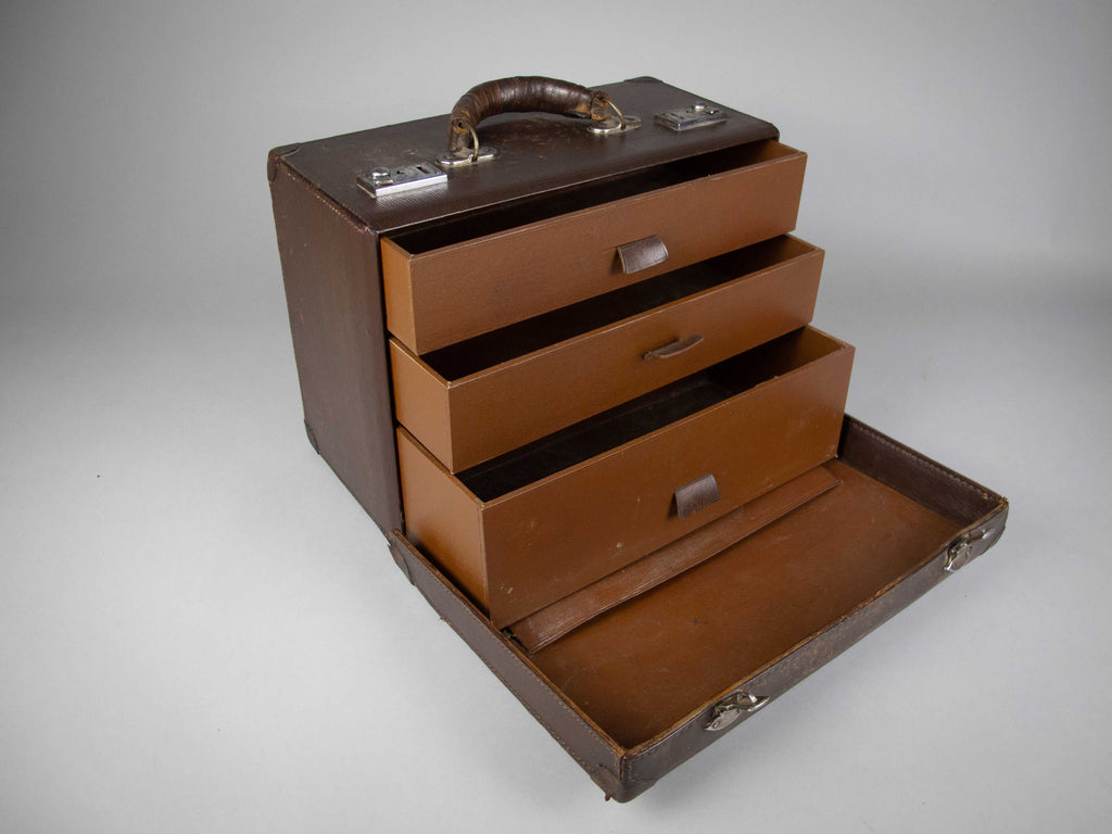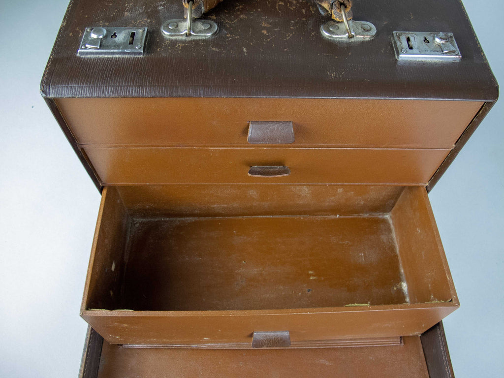 The case is in a completely original condition and as such there are scuffs to the exterior leather and some marking to the interior of some of the drawers from previous use. The lock clasps open and close with ease.