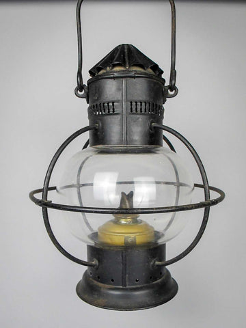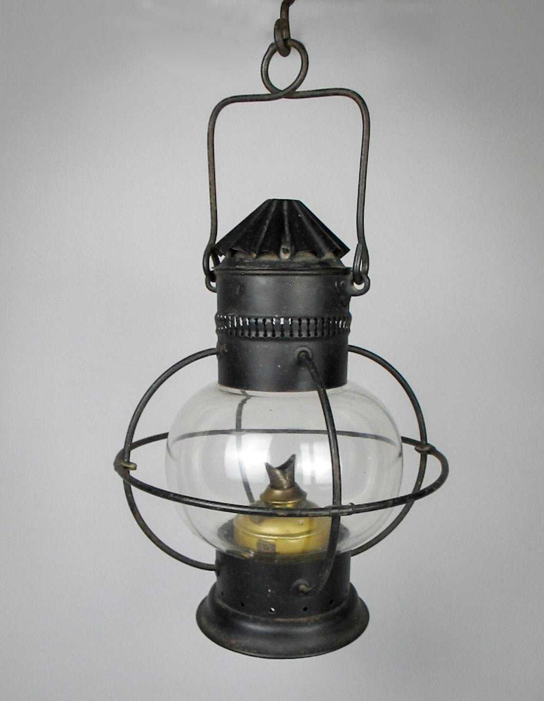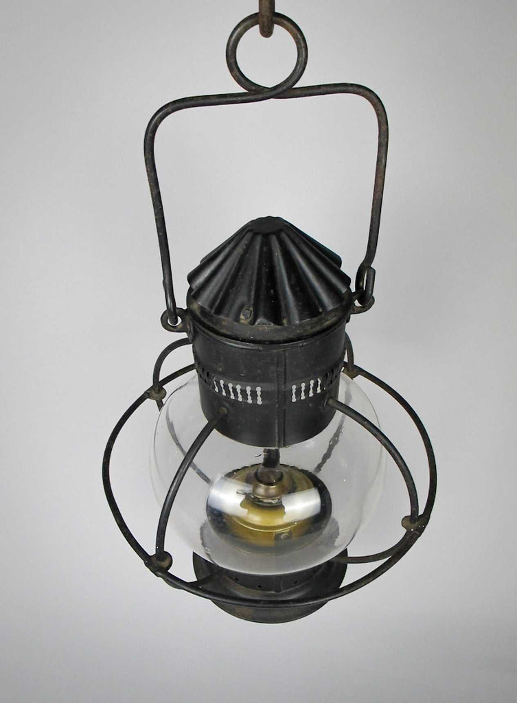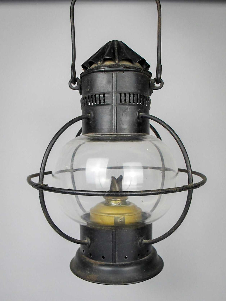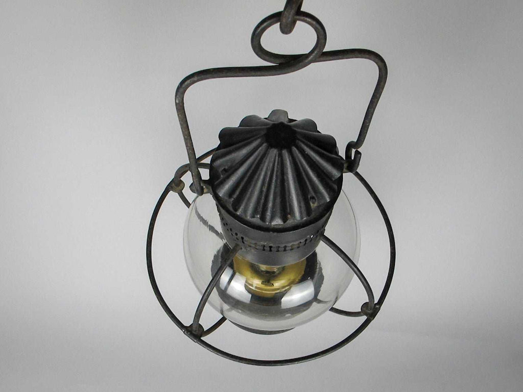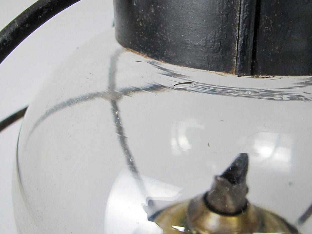 The lamp boasts a pierced chimney above a framed glass globular body and a circular foot. The glass is original and handblown, with a wonderful wave and visible bubbles.