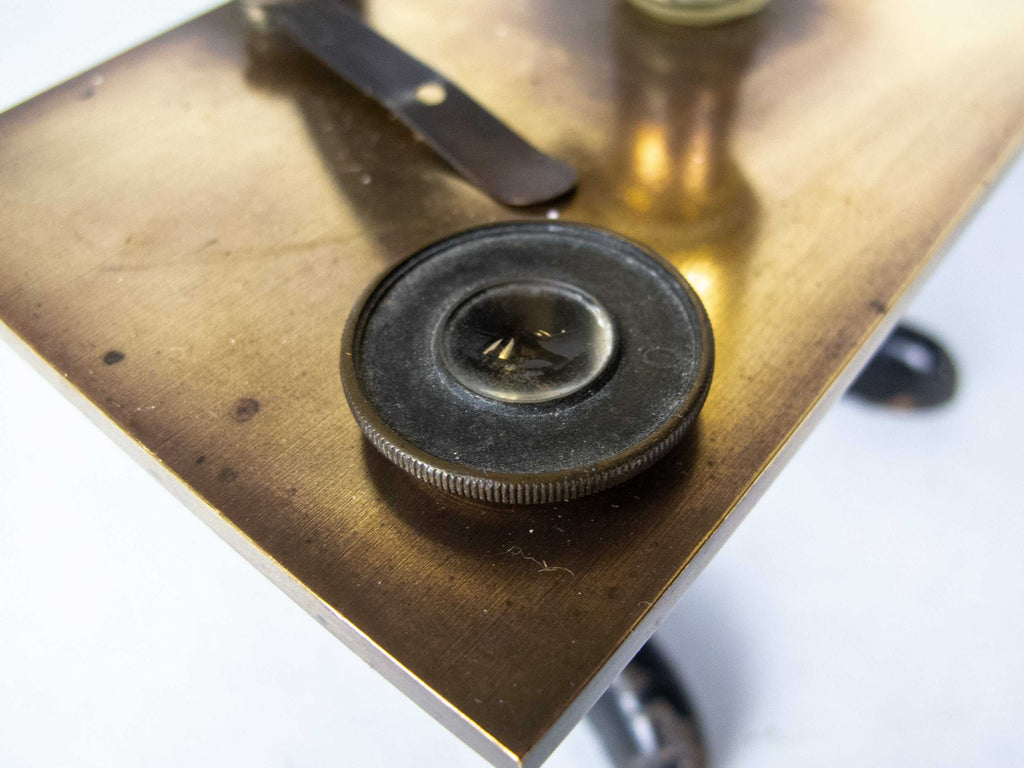 An Ernest Leitz Wetzlar monocular brass microscope, serial no. 163721. The microscope comes complete with an additional eye lens and the original rubber magnifying lens protector. The reflective mirror is original and intact.