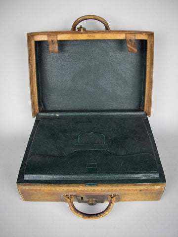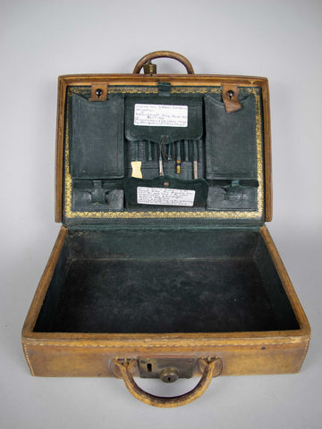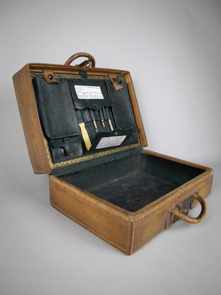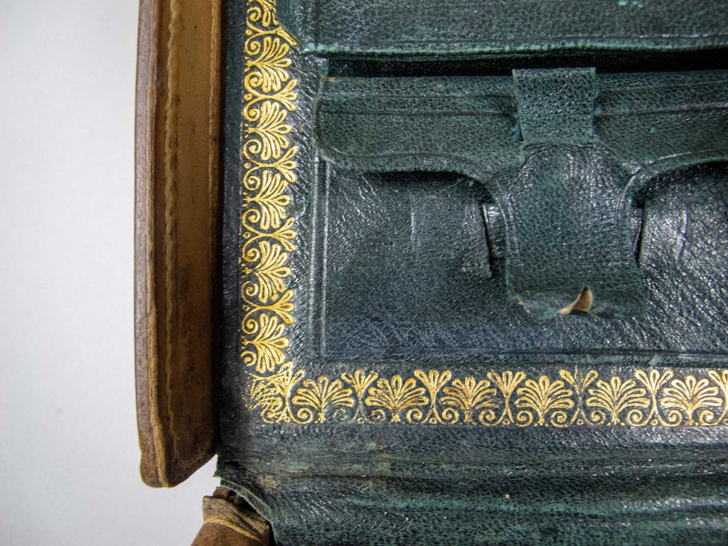 The box opens to reveal a full green leather interior with gilt stamped decoration and numerous leather pockets. Undoing the leather straps to the top of the interior reveals a secret compartment, again in full green leather, with an expanding document holder.