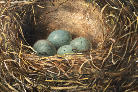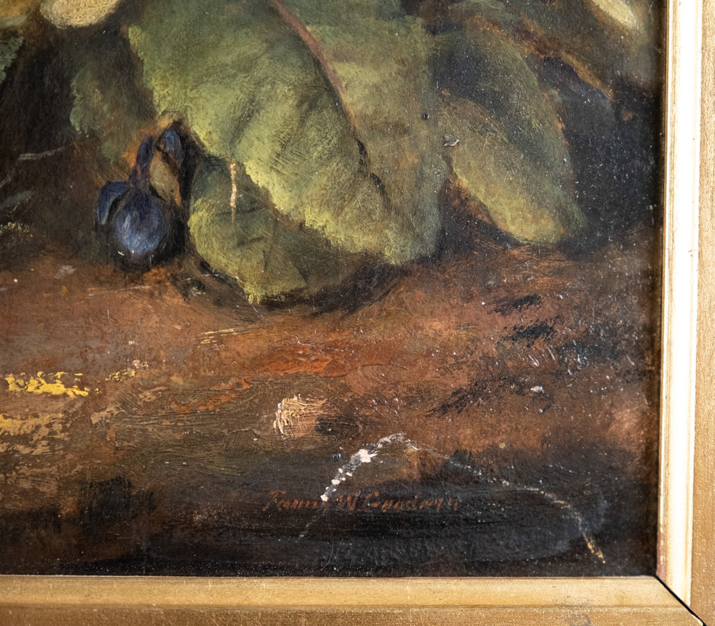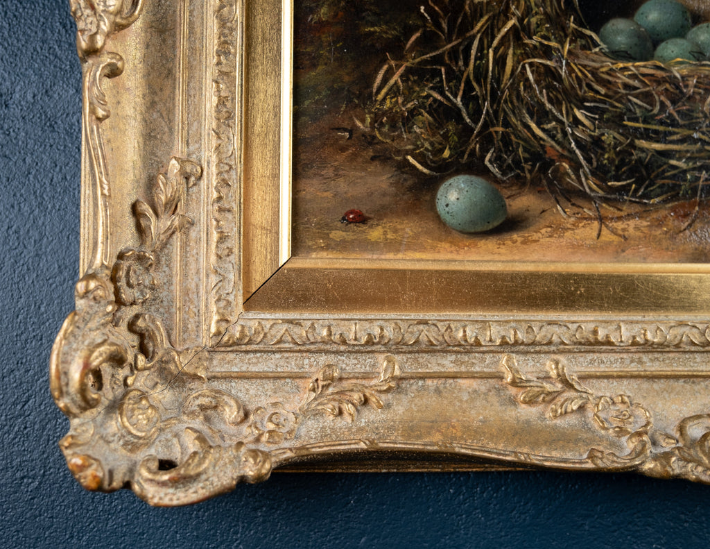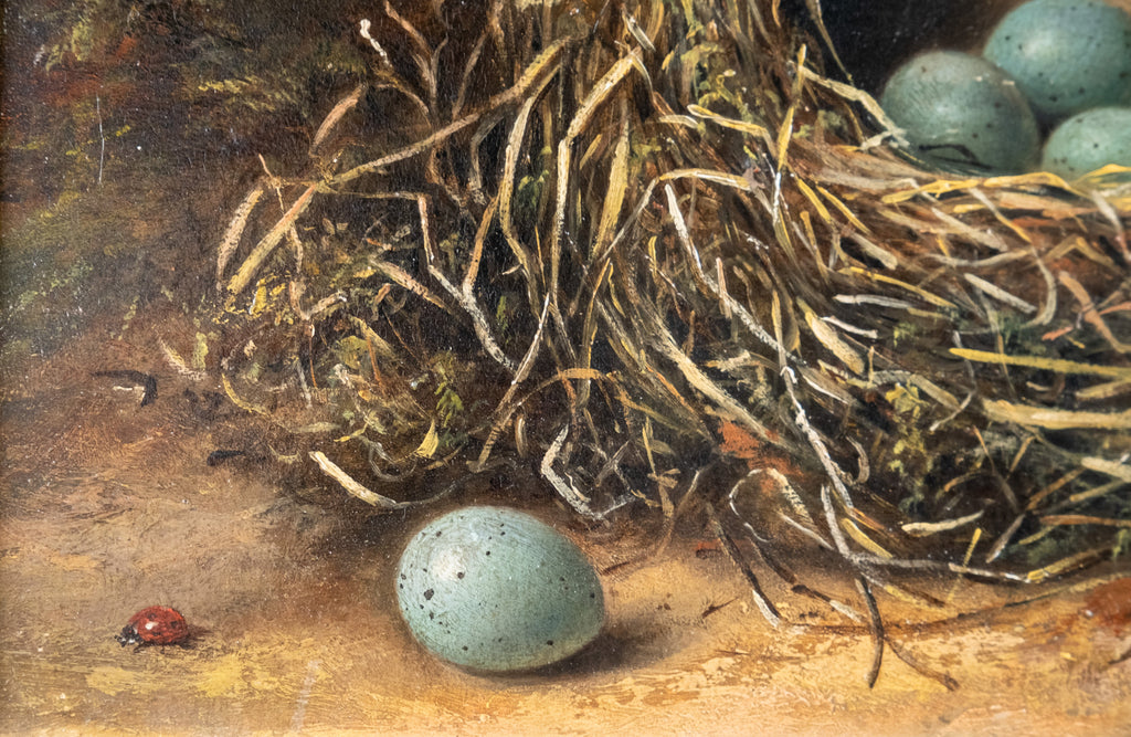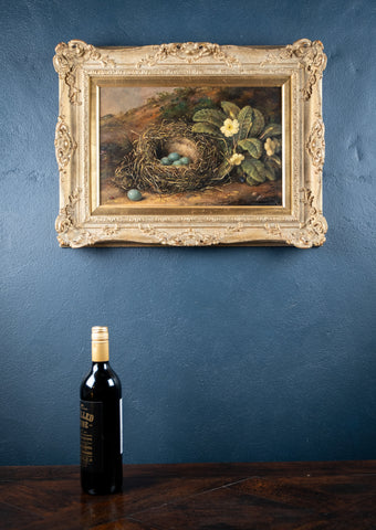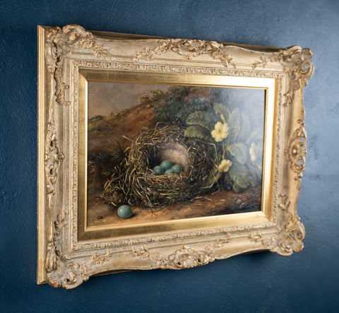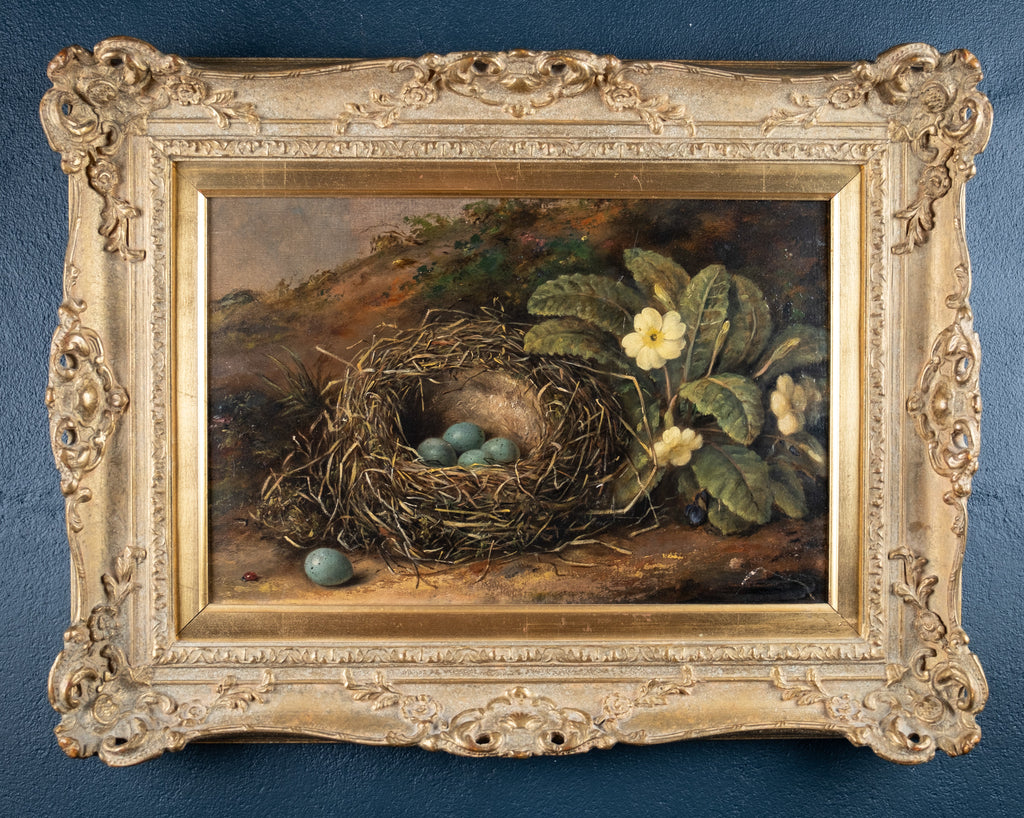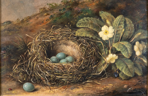 A beautiful oil on board depicting a bird's nest and primrose, signed 'Fanny W. Goodwin' (fl. 1840-1850).