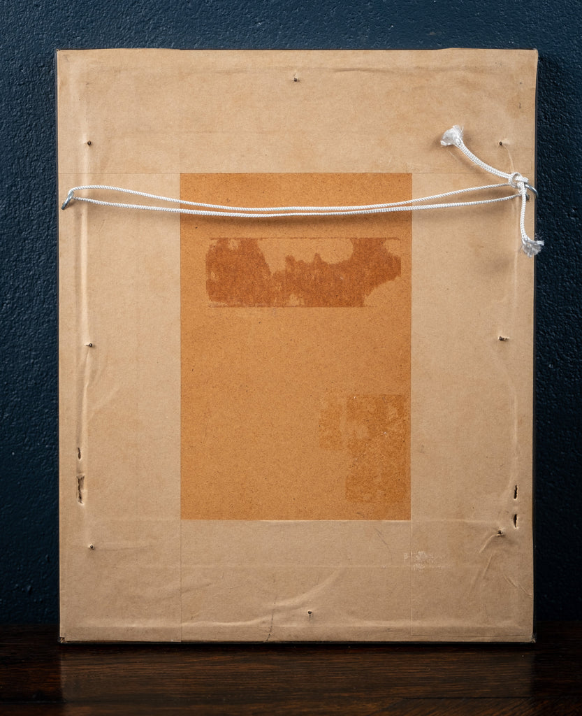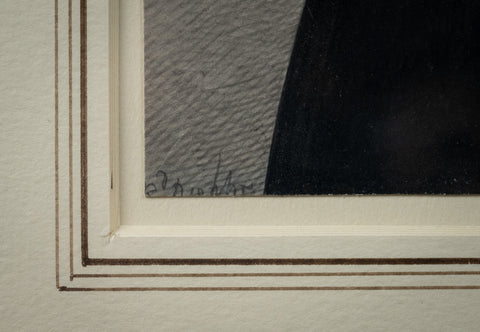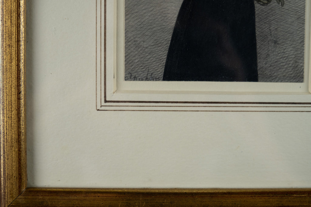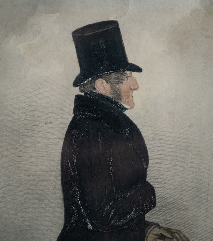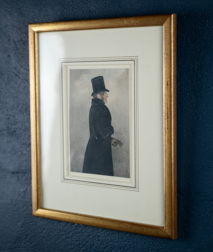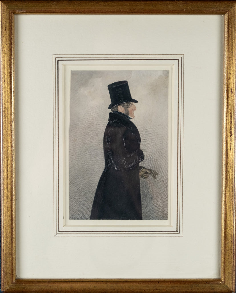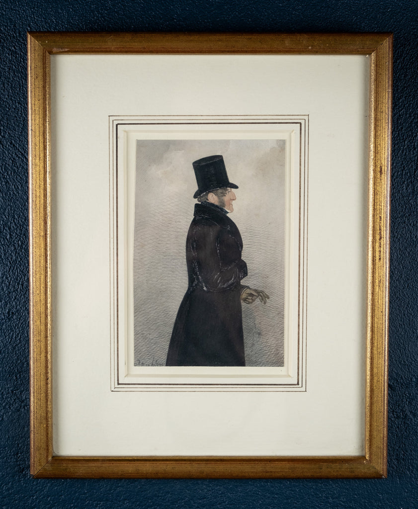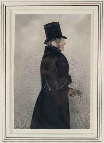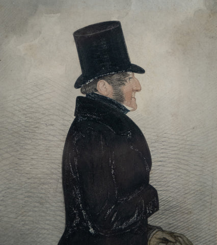 The work is very well executed, depicting a gentleman in a black suit with top hat holding his gloves with an overcast sky to the background. The work is housed in an attractive cream mount and gilt frame.
