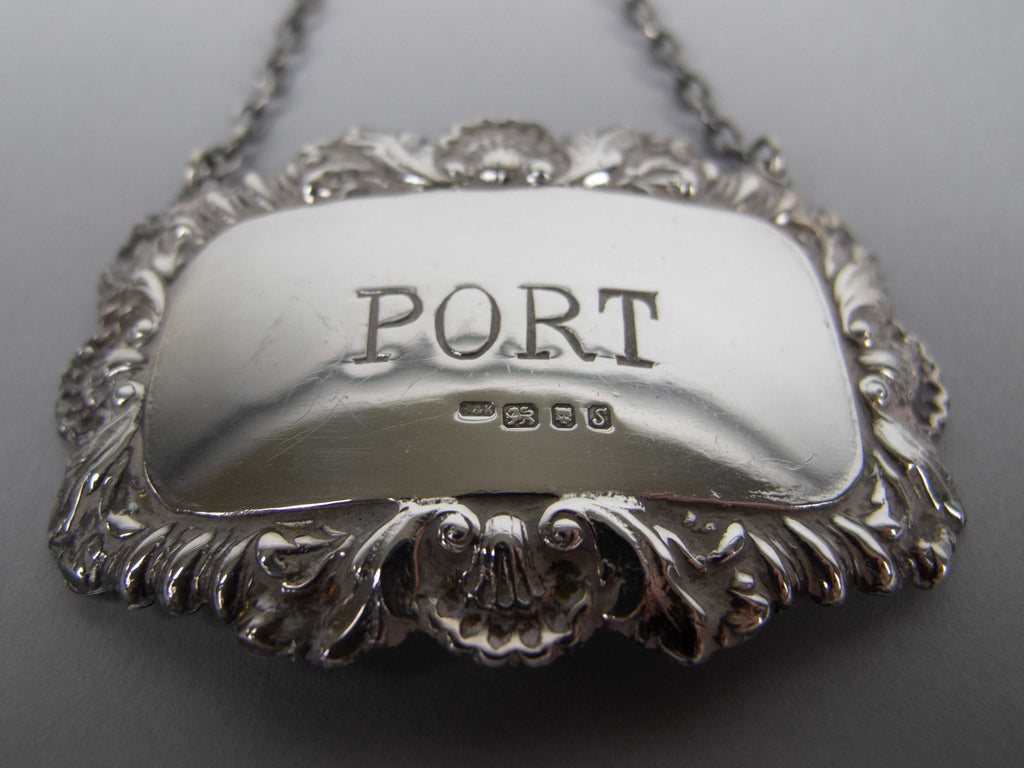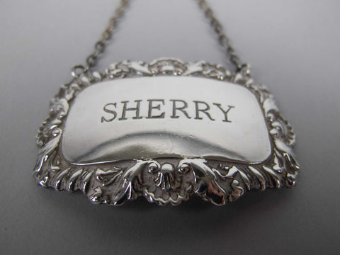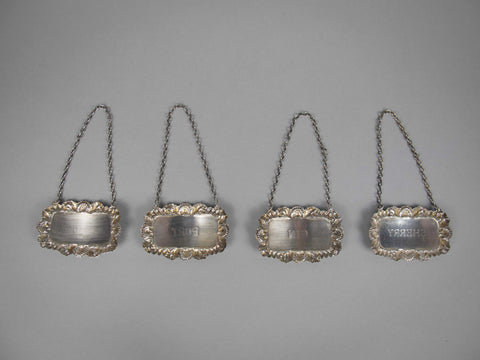 Three of the four labels are fully hallmarked. The 'Sherry' label is not hallmarked but tests as silver and is identical to the other three hallmarked silver pieces in the set.