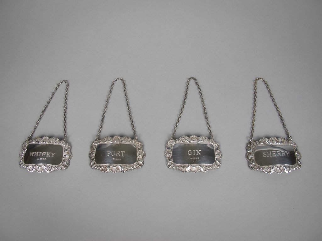 A lovely set of four sterling silver decanter labels by Richards & Knight of London, 1973.
