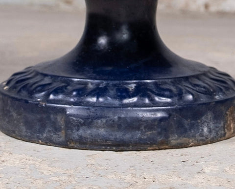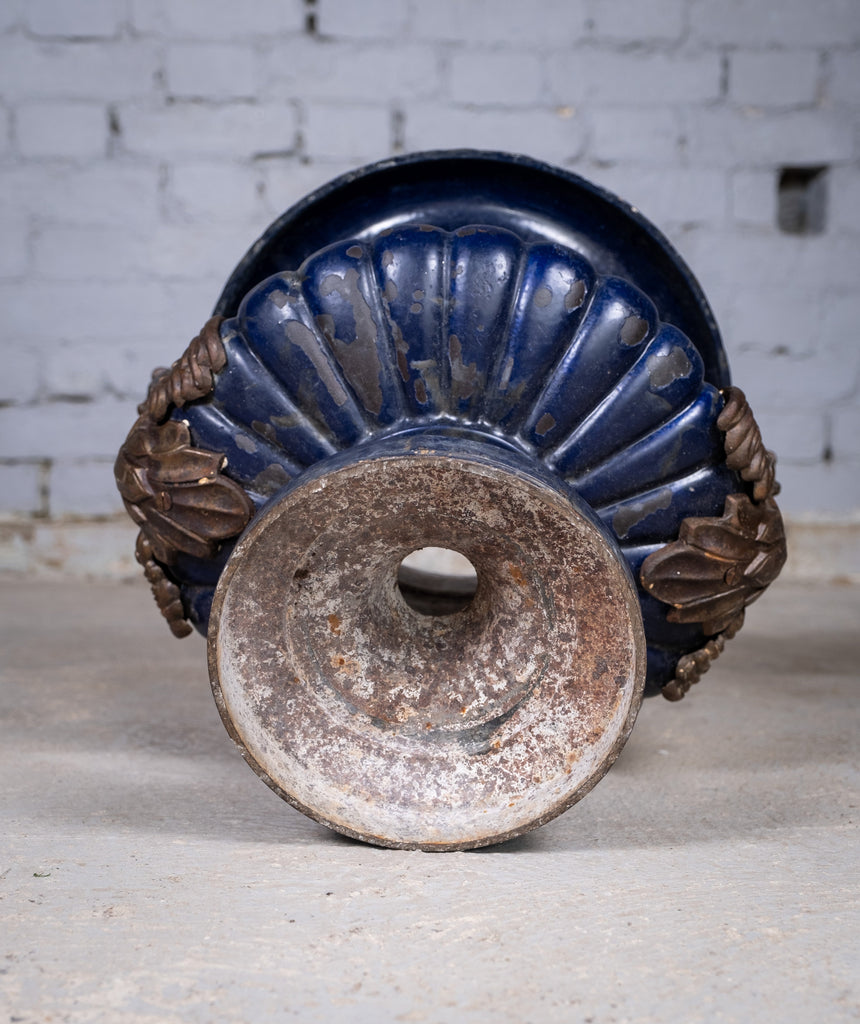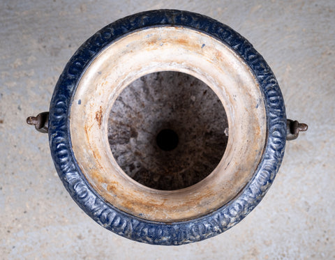 The urn has been historically coated in a rich blue enamel which has covered the signature but the plaque on which the signature would have been remains visible to the base with some raising indicative of the signature being underneath, the plaque itself being of the correct proportions and placement for an Alfred Corneau piece.