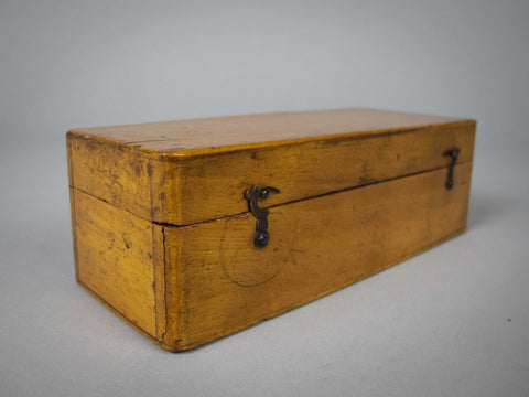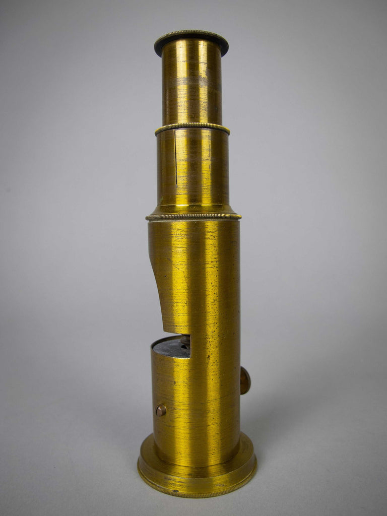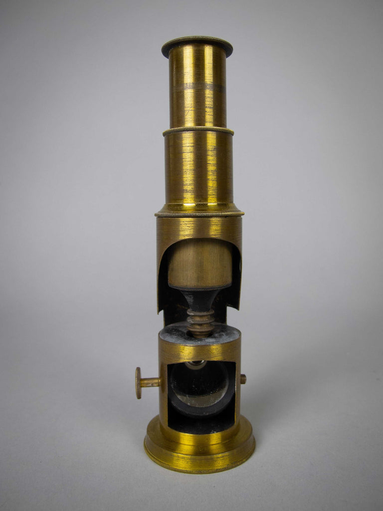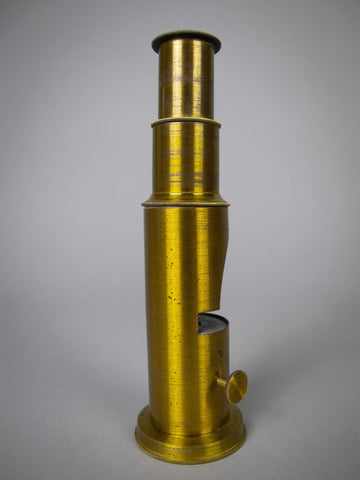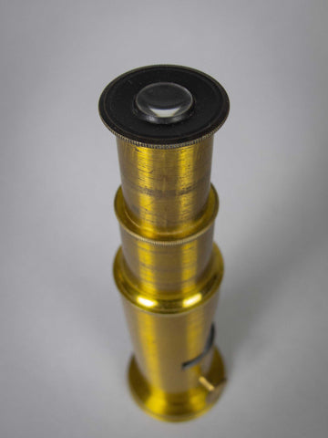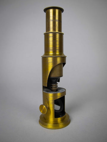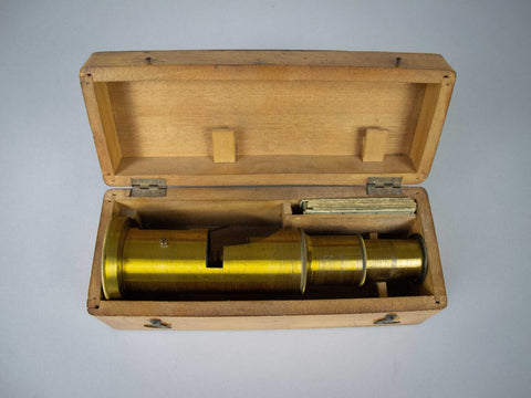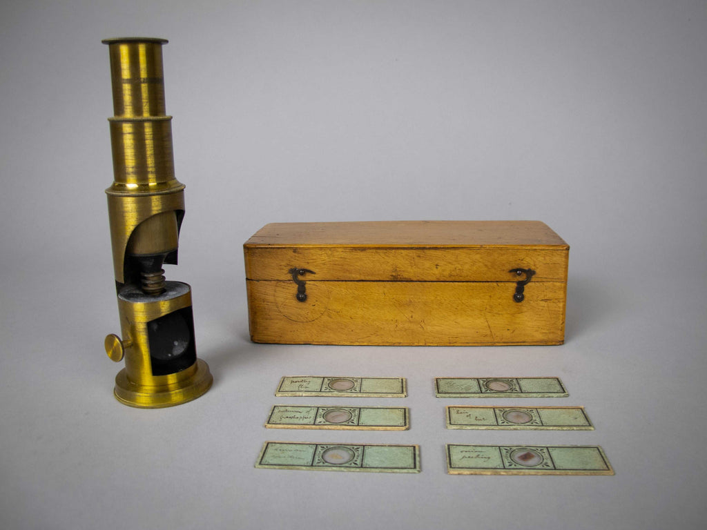 A French brass field microscope with its original travelling box, which still contains six slides, c.1880 - 1910.