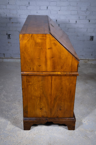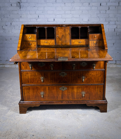 The bureau is of good proportions and boasts a featherbanded enclosed fall front top and featherbanded drawers with double bead carcase moulding. There is an attractive waist moulding but note the bureau is formed of one piece. The drawers and top have bat wing escutcheons consistent with the period. The handles and bracket feet are later replacements. The facia of the right fall-front rest shows historic repair but remains stable. There are a few very minor losses to the extremities in places (please see photographs) but the bureau remains in a good and attractive condition externally.