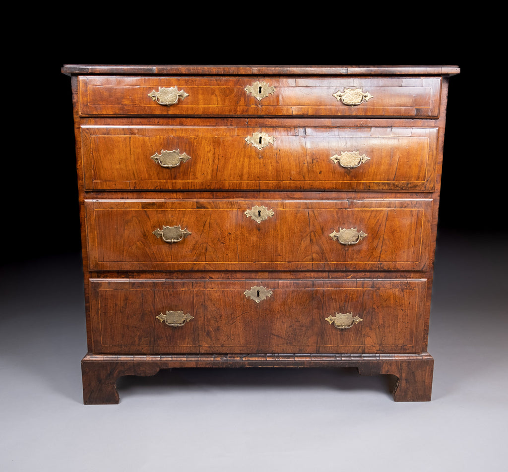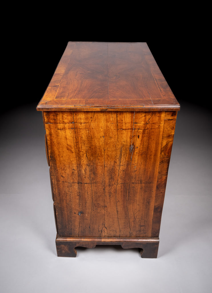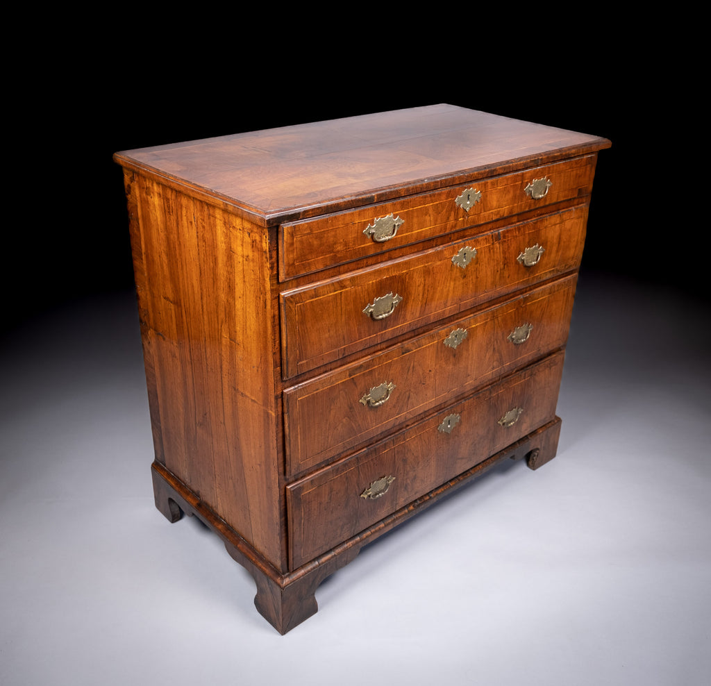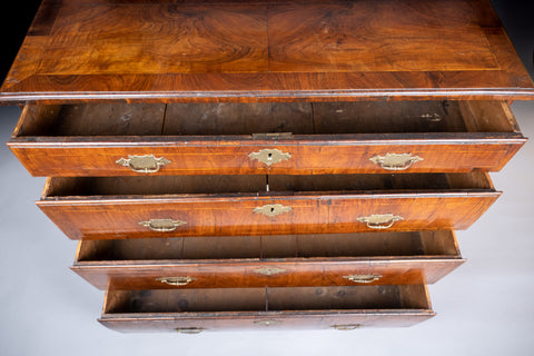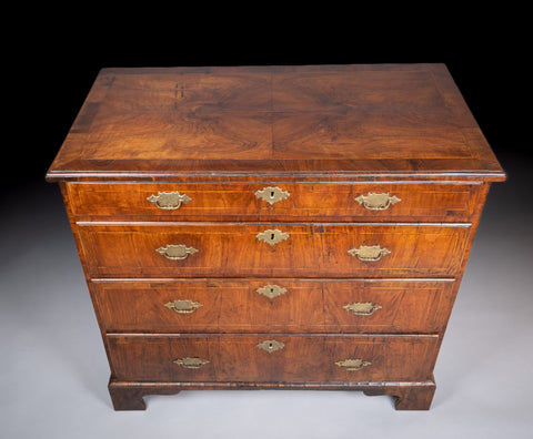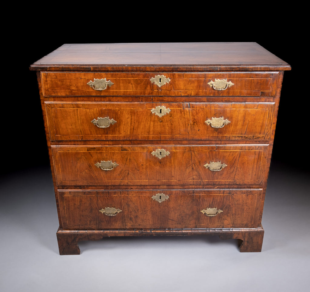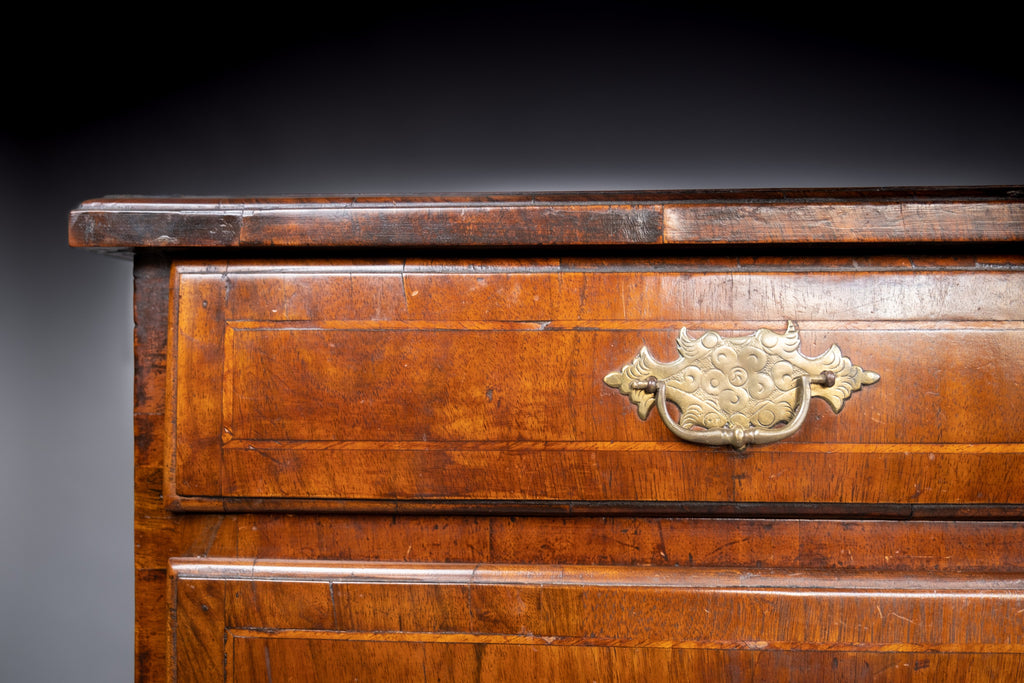The chest has a rectangular moulded quarter-veneered top above four long lip moulded drawers with oak lining, all above four bracket feet. Later but historically accurate brasses.