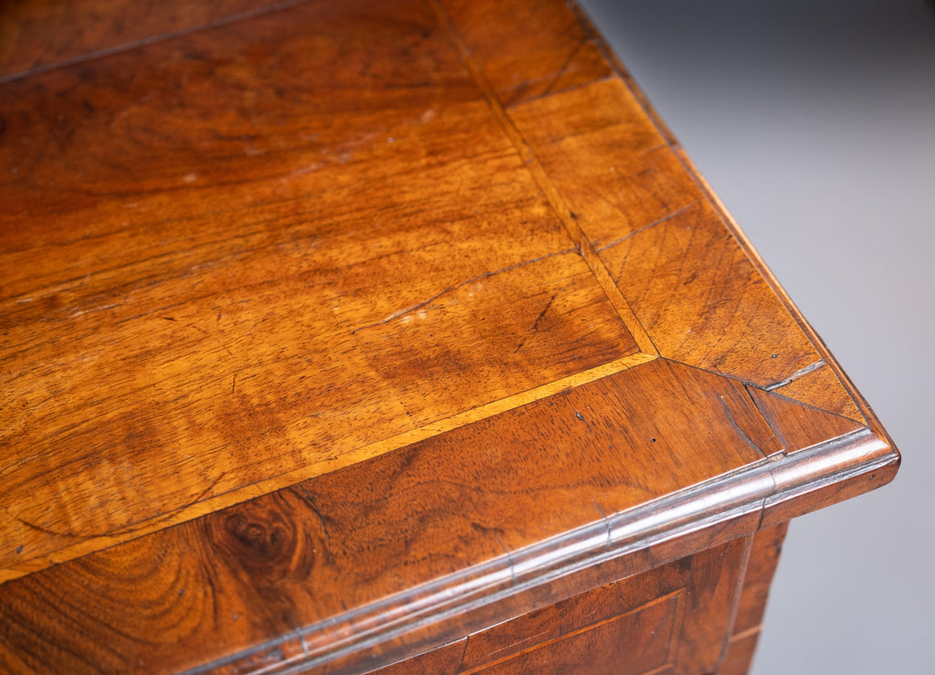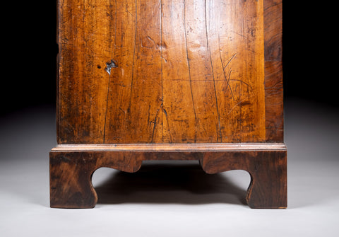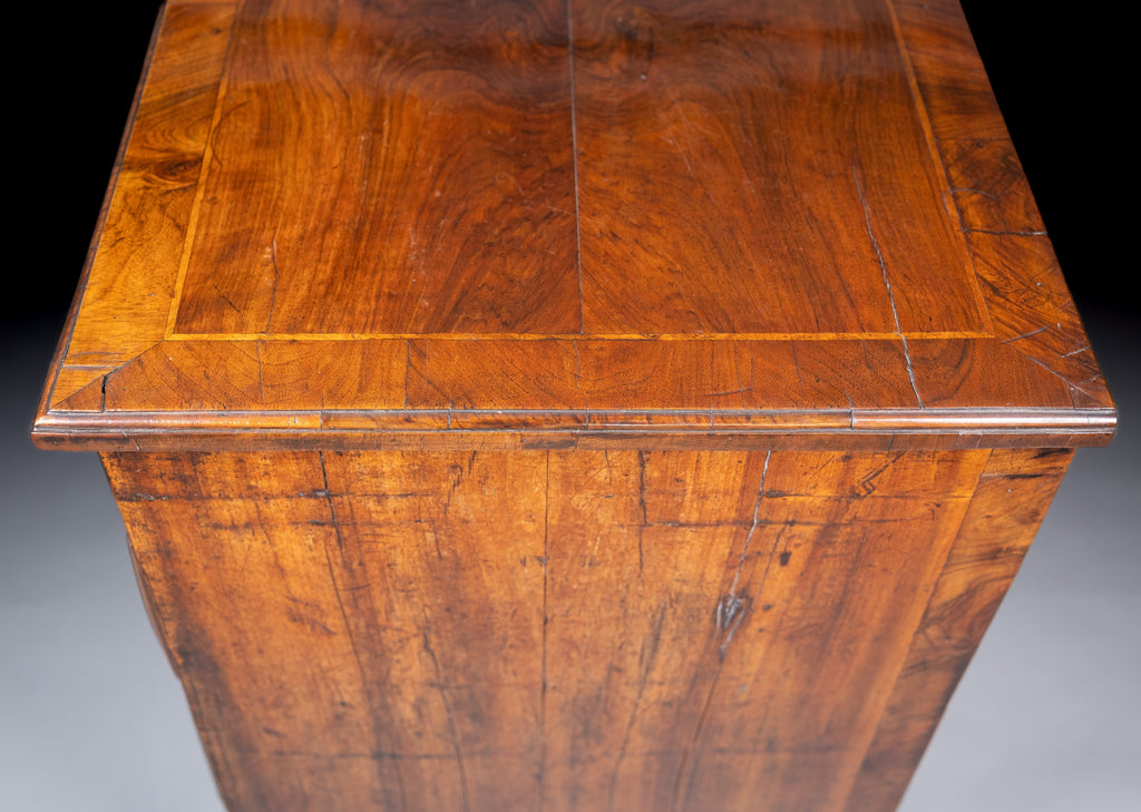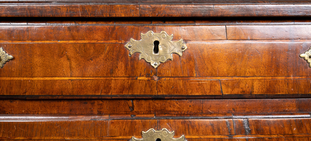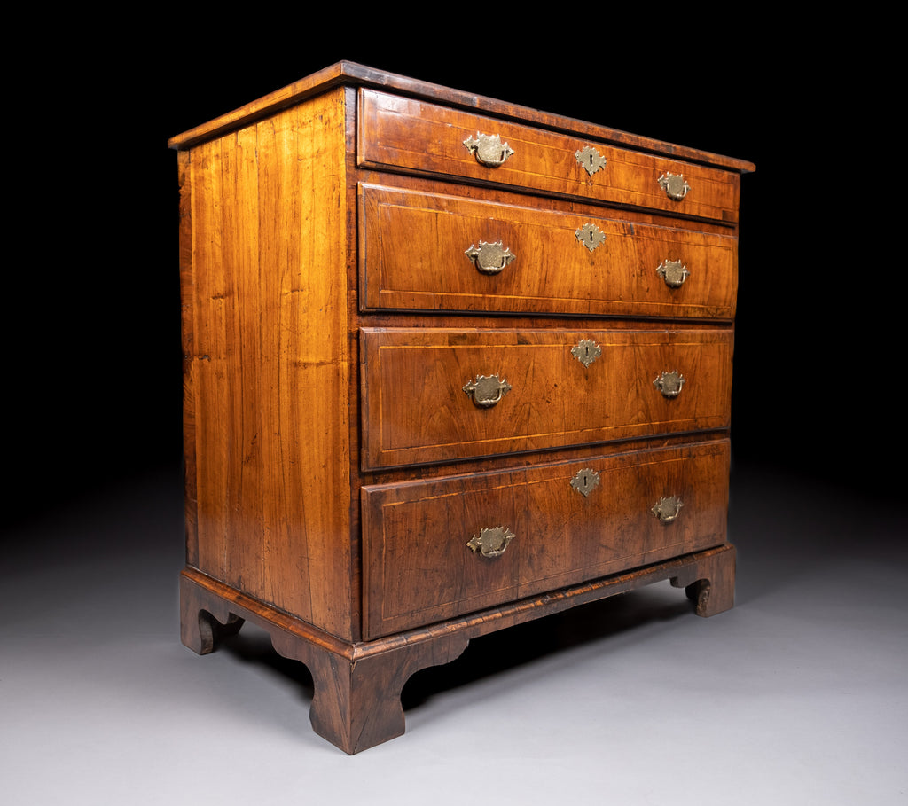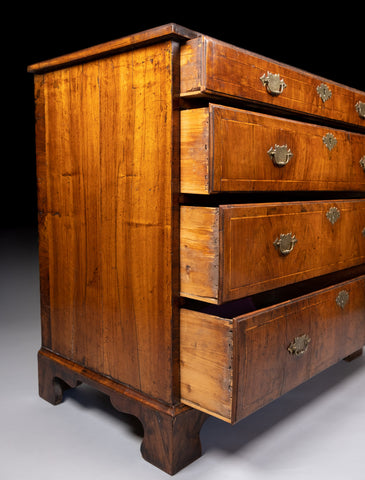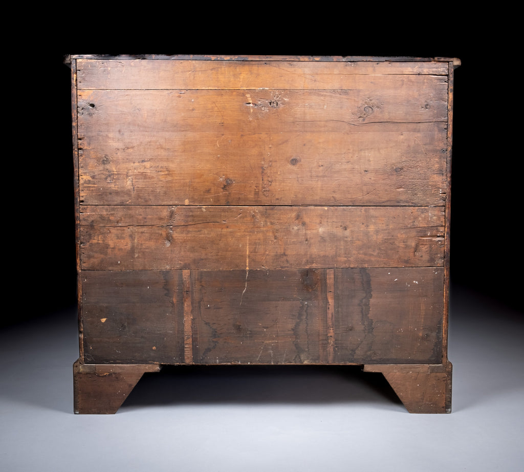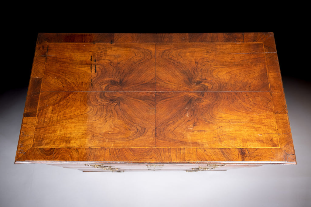 The chest has a rectangular moulded quarter-veneered top above four long lip moulded drawers with oak lining, all above four bracket feet. Later but historically accurate brasses.