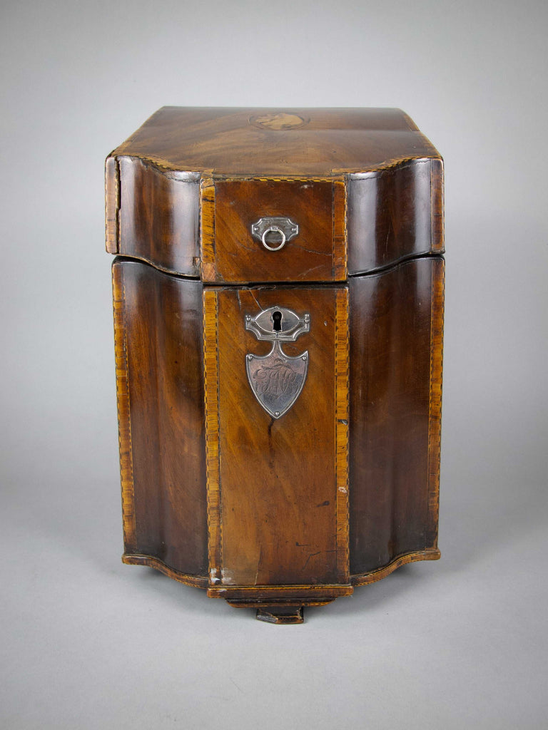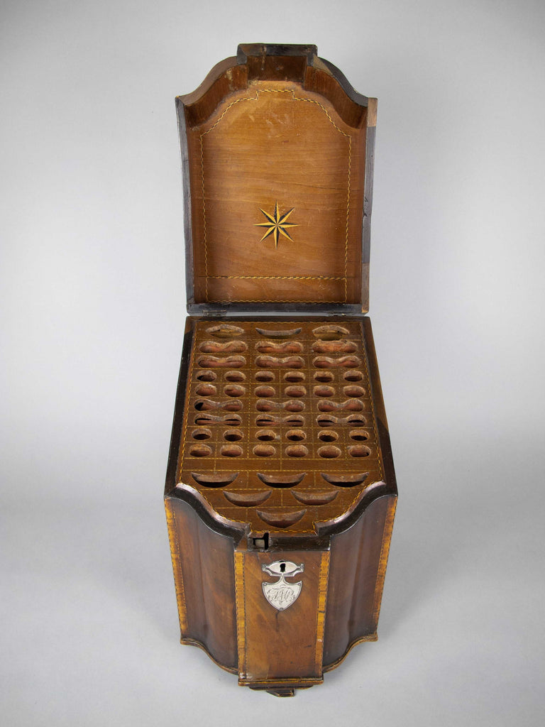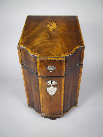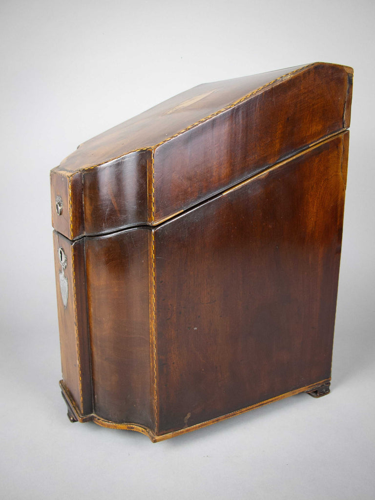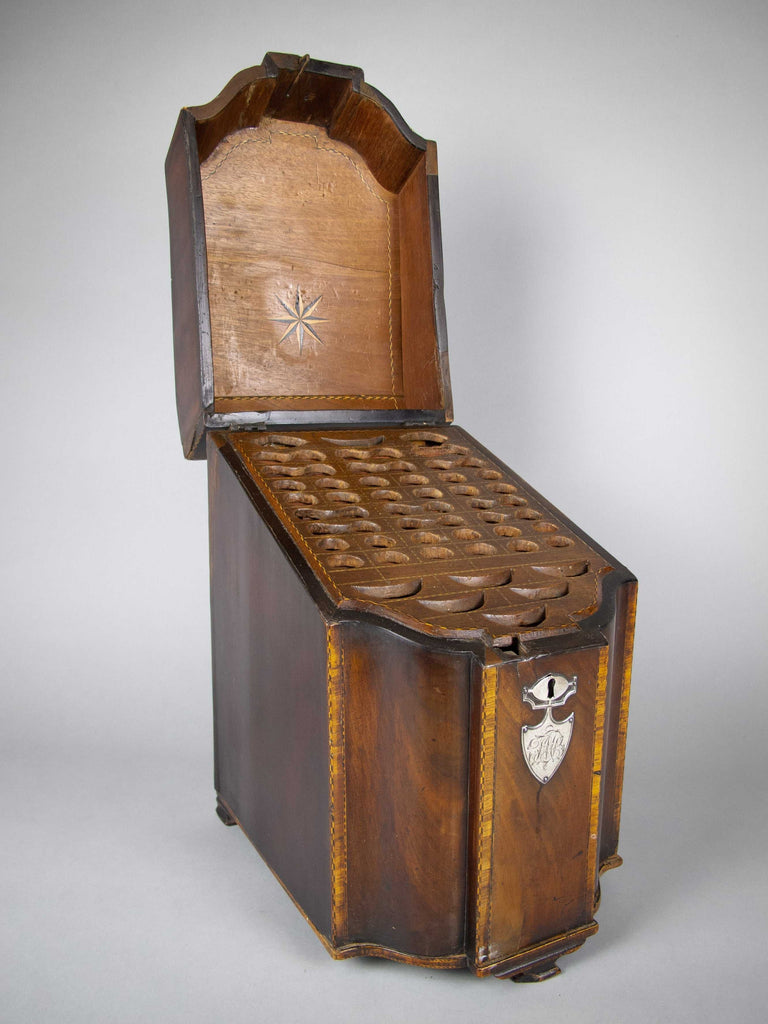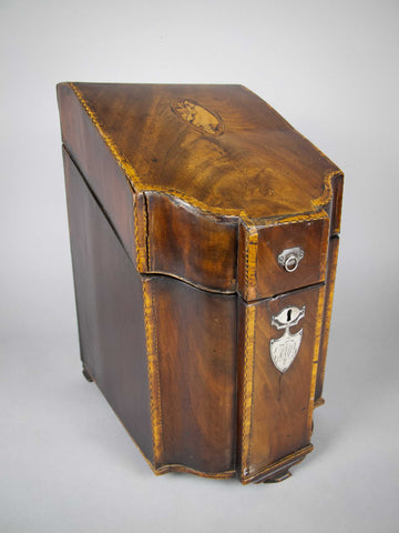 A fine quality George III flame mahogany and cross-banded cutlery box with inlaid shell patera to the top and the original cross-banded fitted interior. The front boasts a white metal armorial cartouche with the monogram 'JWB', beneath a white metal escutcheon.