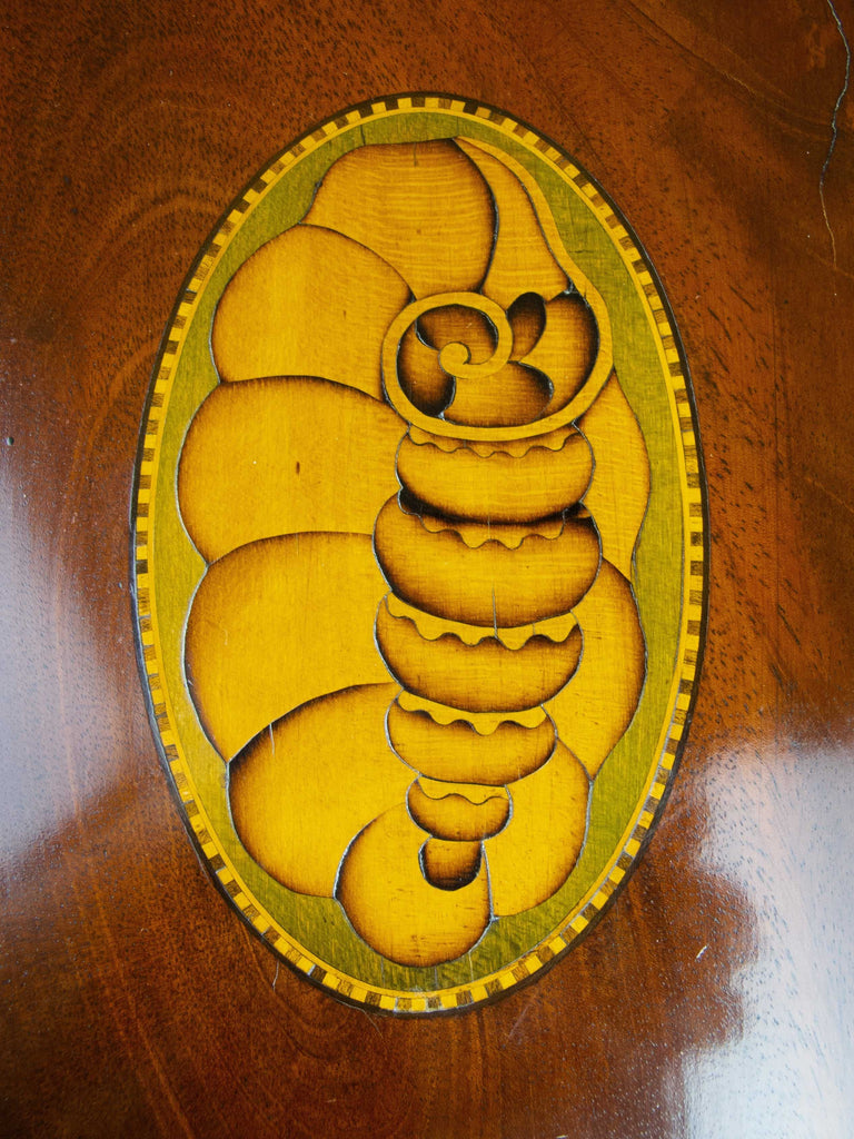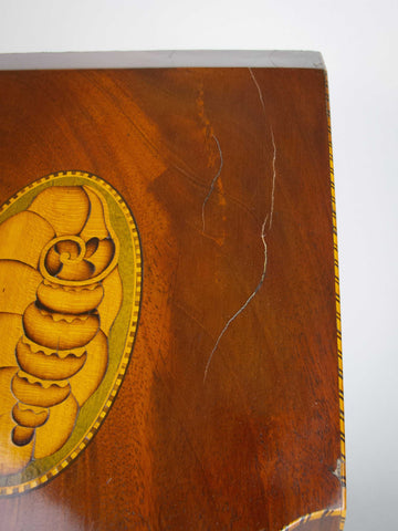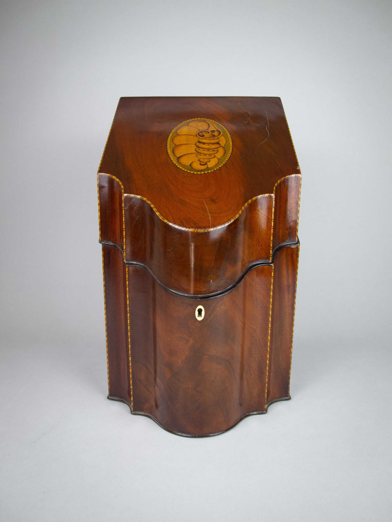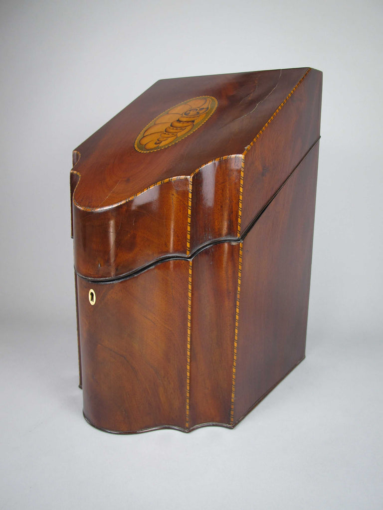 A very attractive George III mahogany knife / cutlery box of serpentine form inlaid with a satinwood conch shell motif, with satinwood and ebony strung edging throughout.
