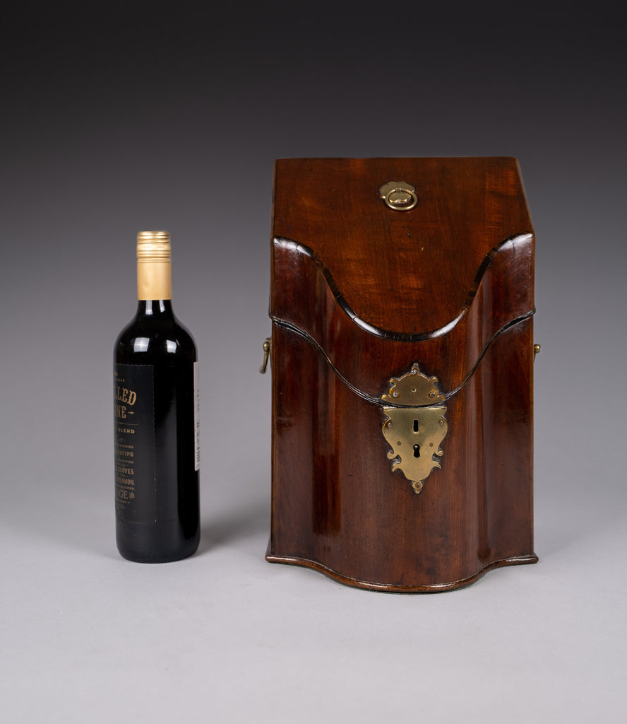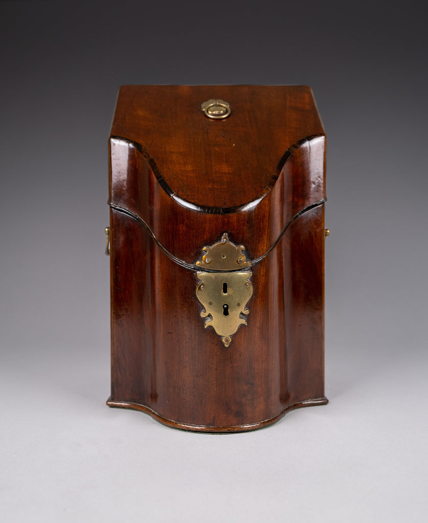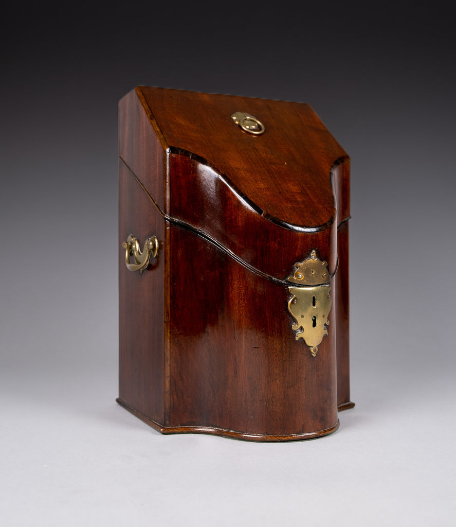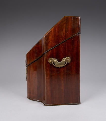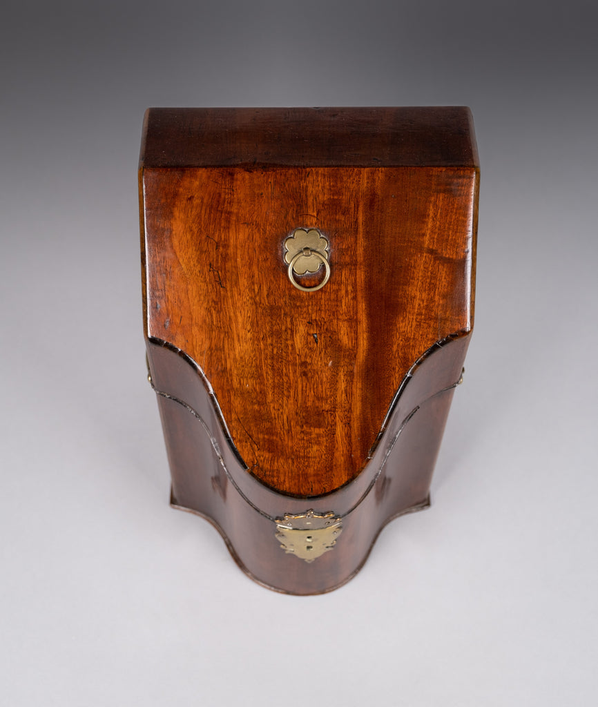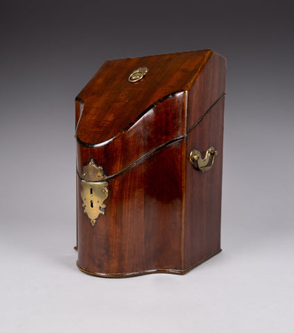 A George III late 18th century mahogany serpentine fronted knife box with brass handles.