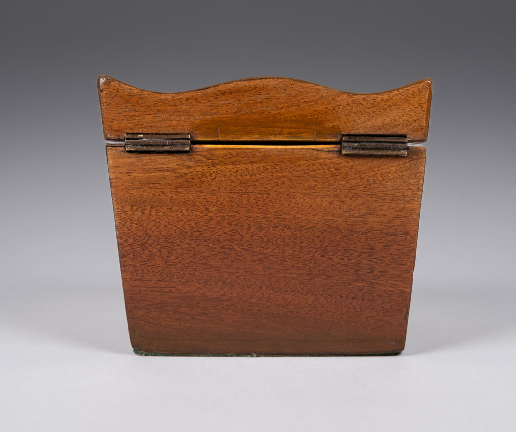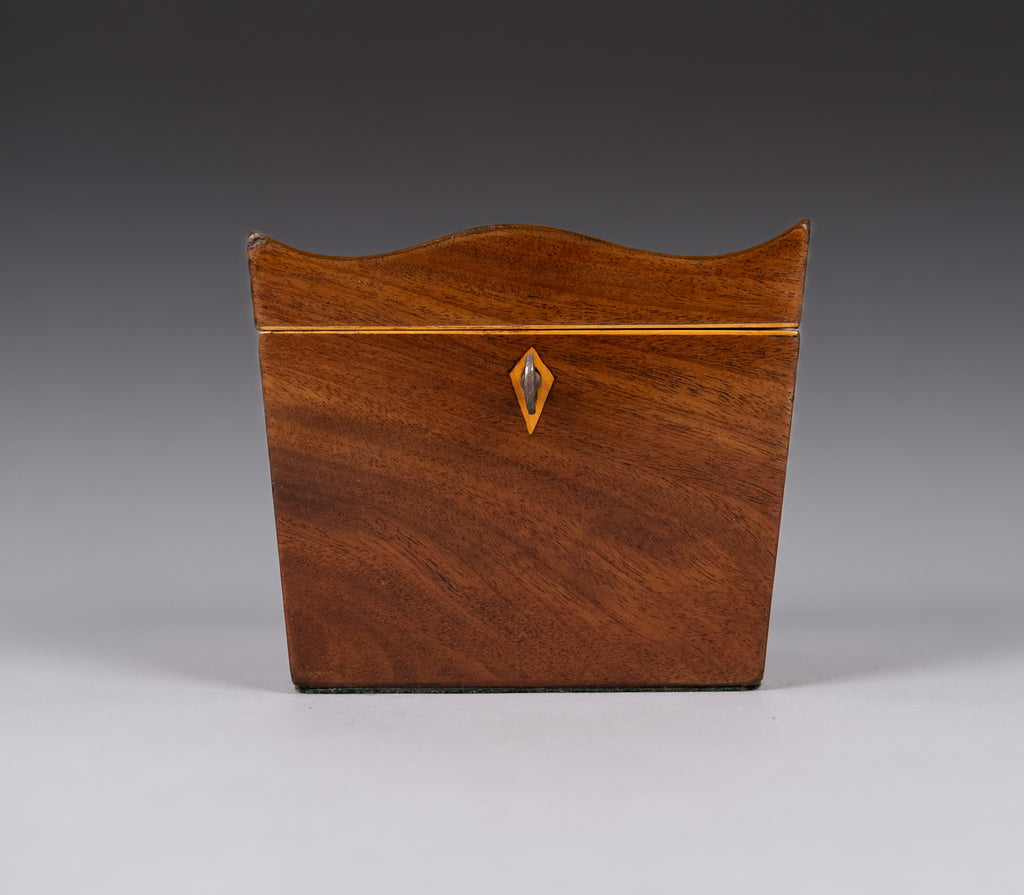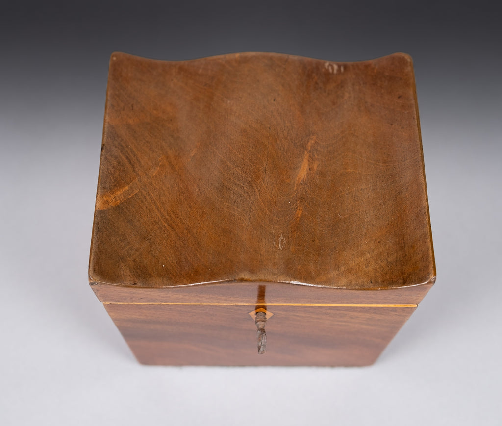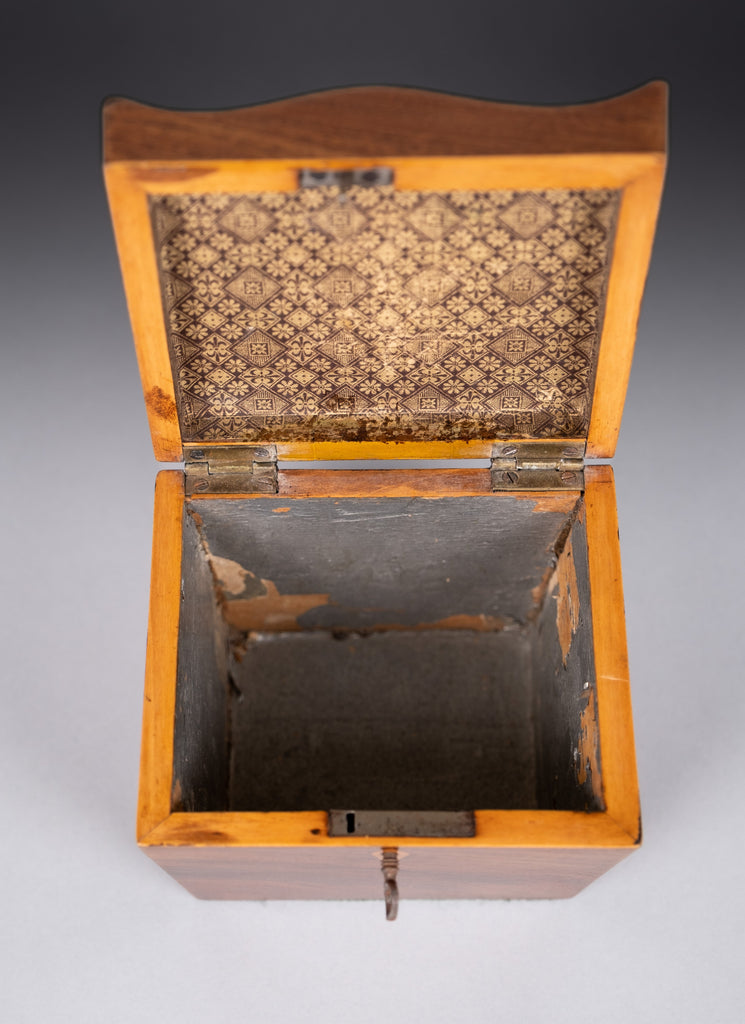 The tea caddy is of unusual form with a serpentine top above a tapered body. The caddy has boxwood inlay to the caddy rim, lid and escutcheon. The top shows some fading (please see photographs) and there are some small nibbles to the extremities in areas.