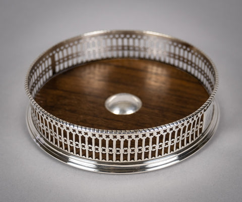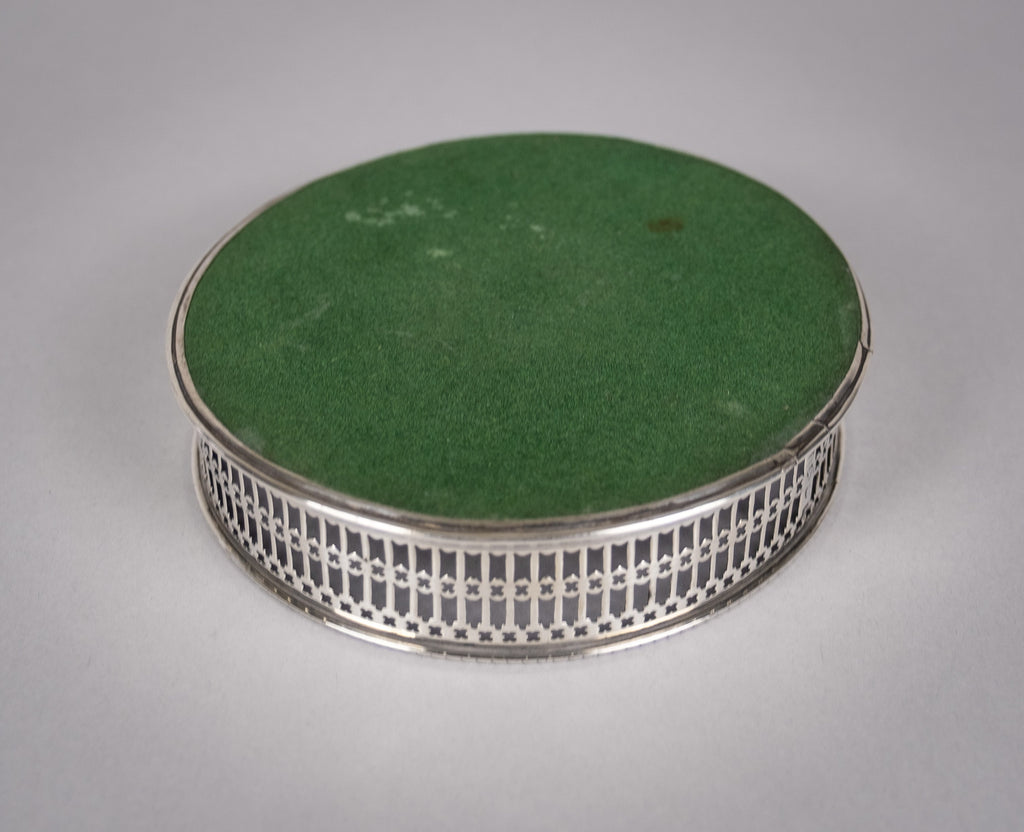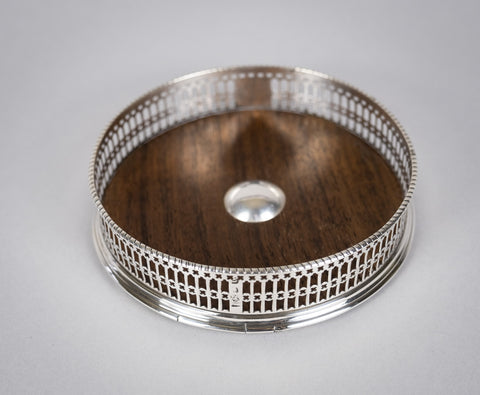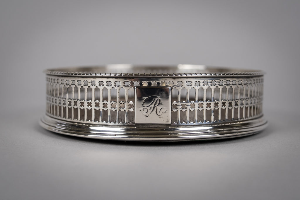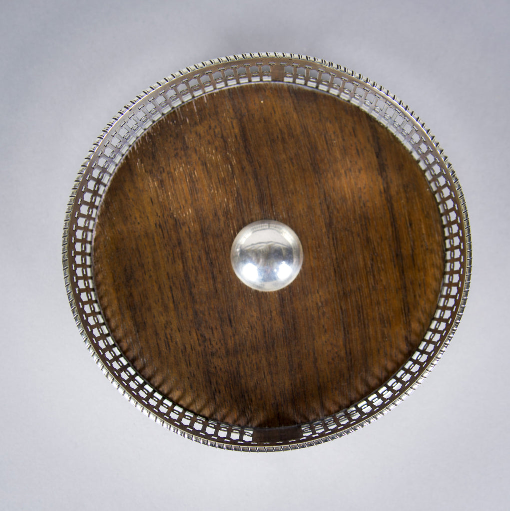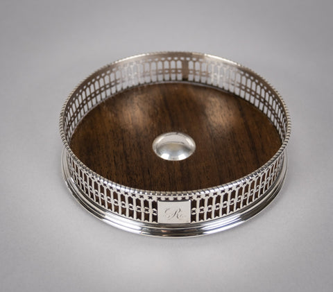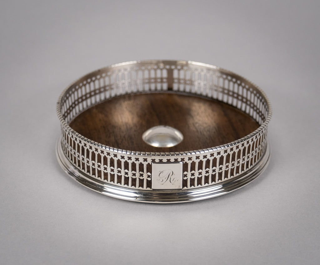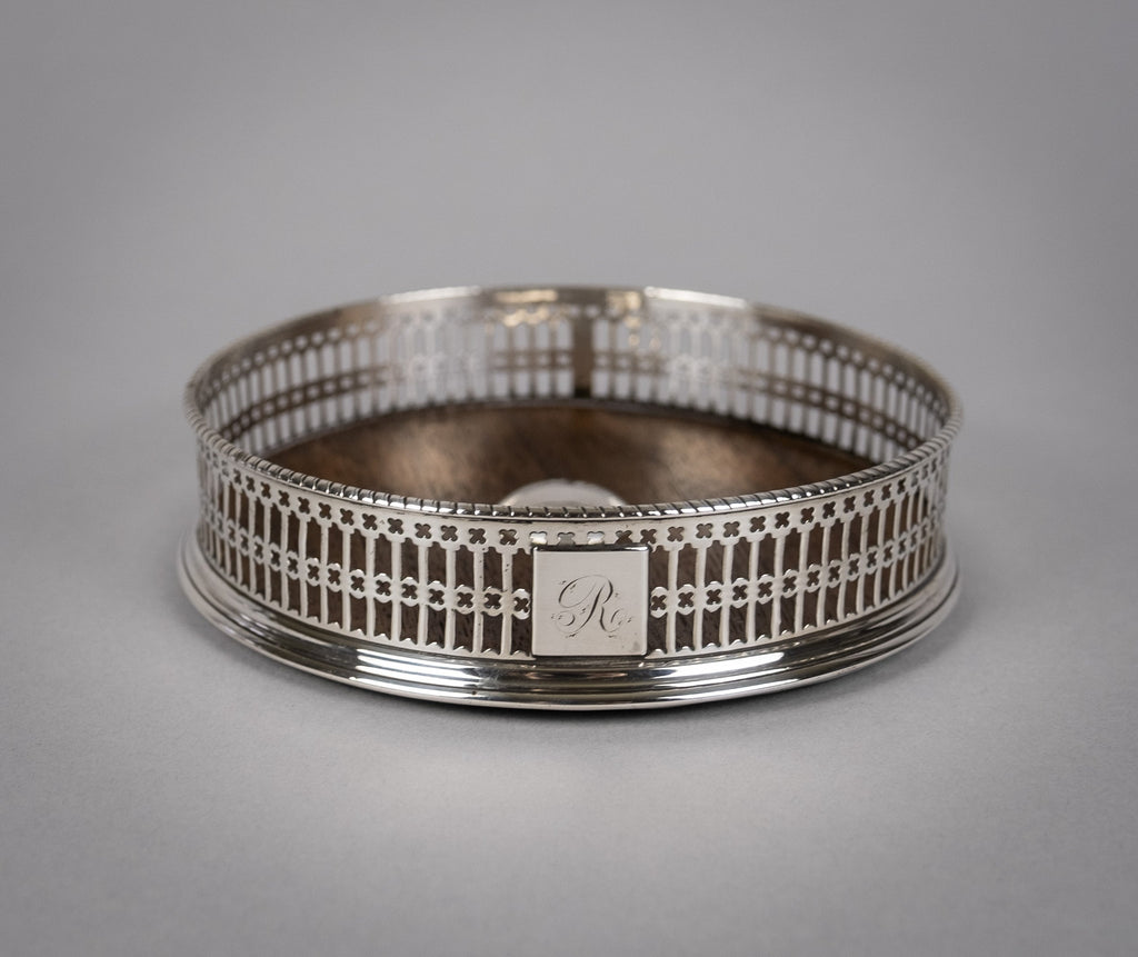 The coaster boasts fretted sterling silver sides with a silver cabochon boss to the centre. A square cartouche with the letter 'R' sits front centre. There is a very small area of damage to the silver at the base near the hallmarks (please see photographs), otherwise the coaster remains in an excellent condition throughout.