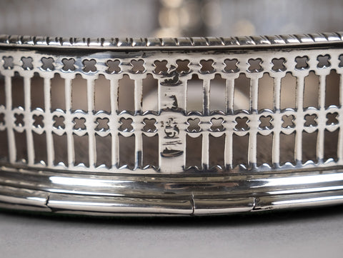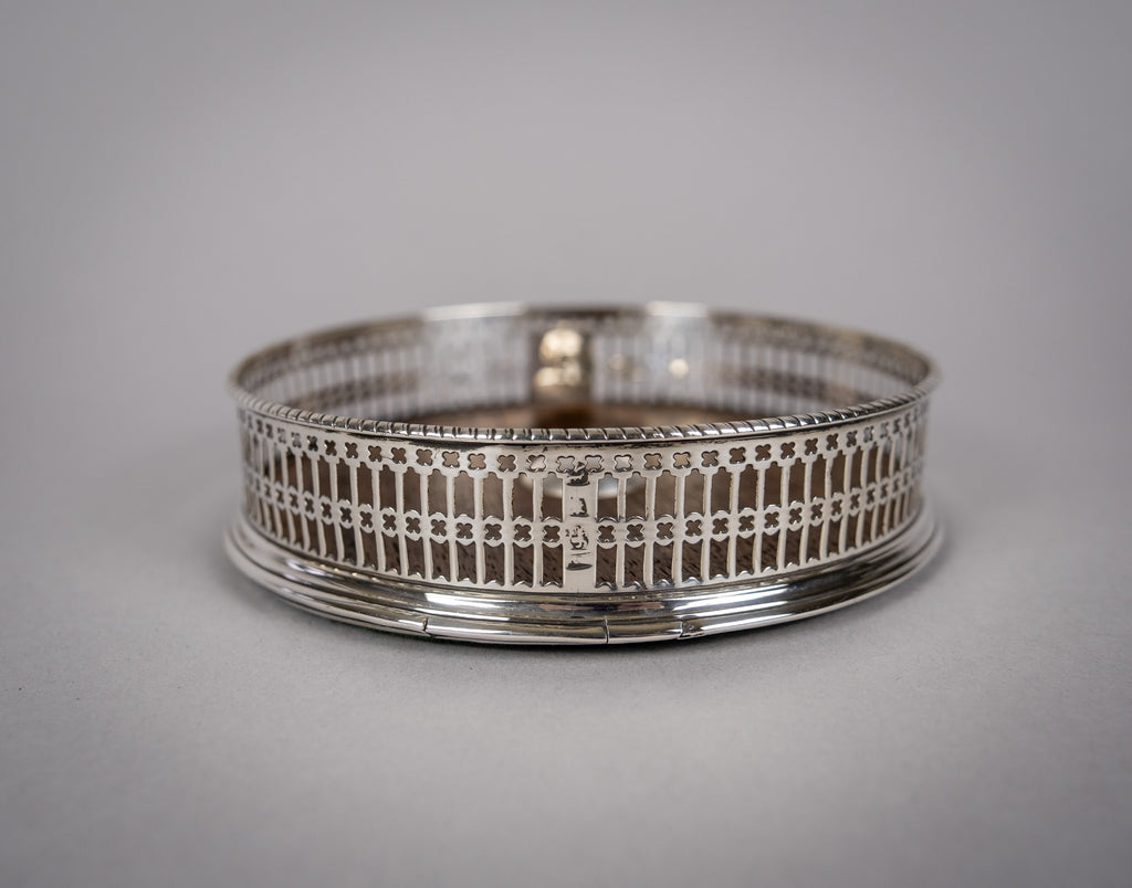 A very attractive George III sterling silver wine coaster, assayed for London. The maker's mark and hallmarks are rubbed, however the crowned lion assay remains visible, dating the piece no later than 1821. The earliest coasters generally started to appear c.1760, thus this piece can be relatively accurately dated to George III period.