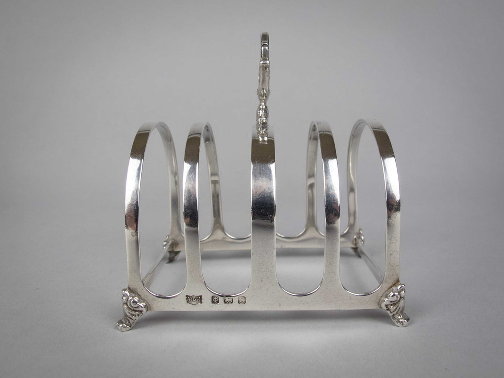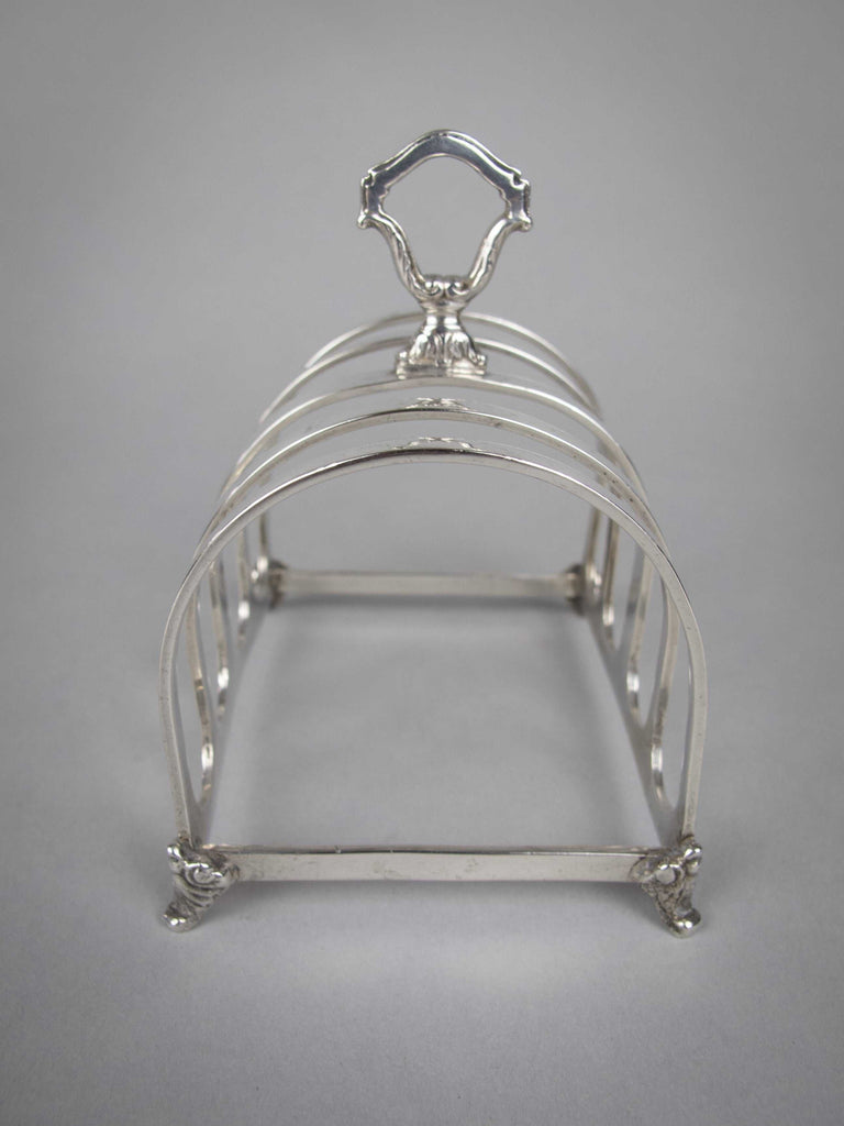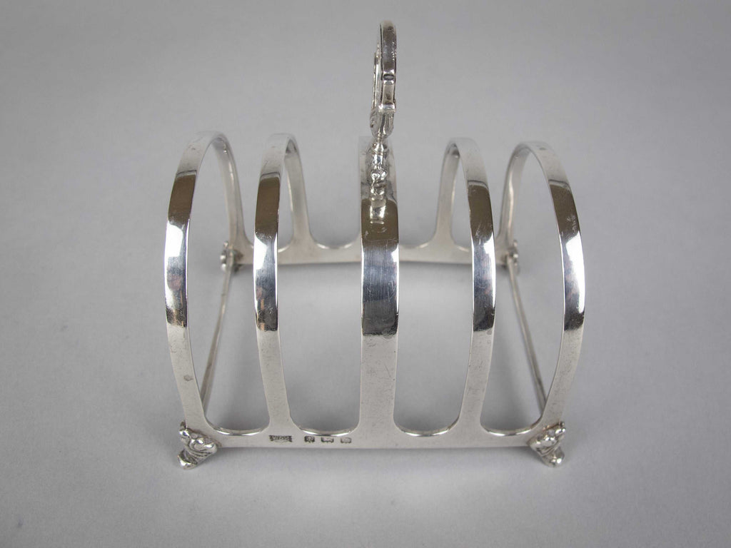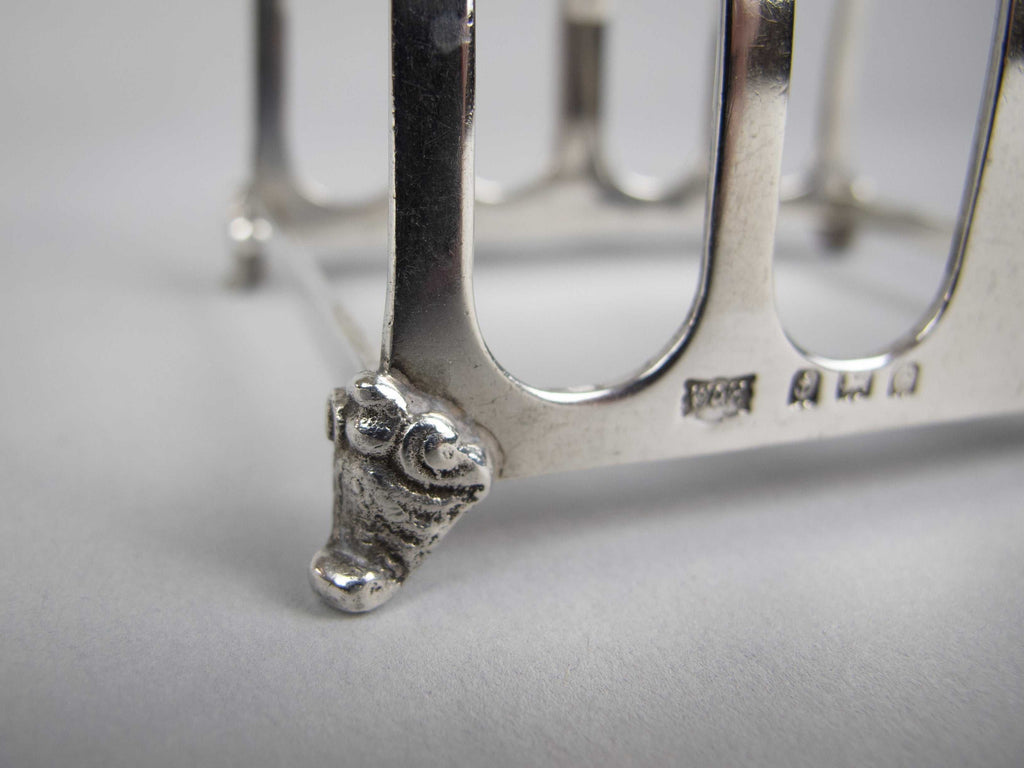 The toast rack boasts raised scroll feet and a handle of matching design. The toast rack has some very small patches of light tarnish to the silver but otherwise remains in a very good condition with clear hallmarks.