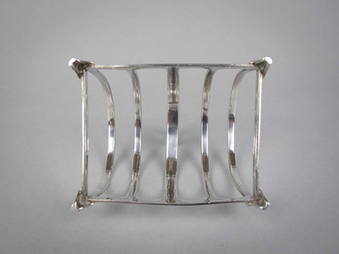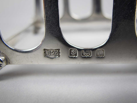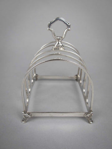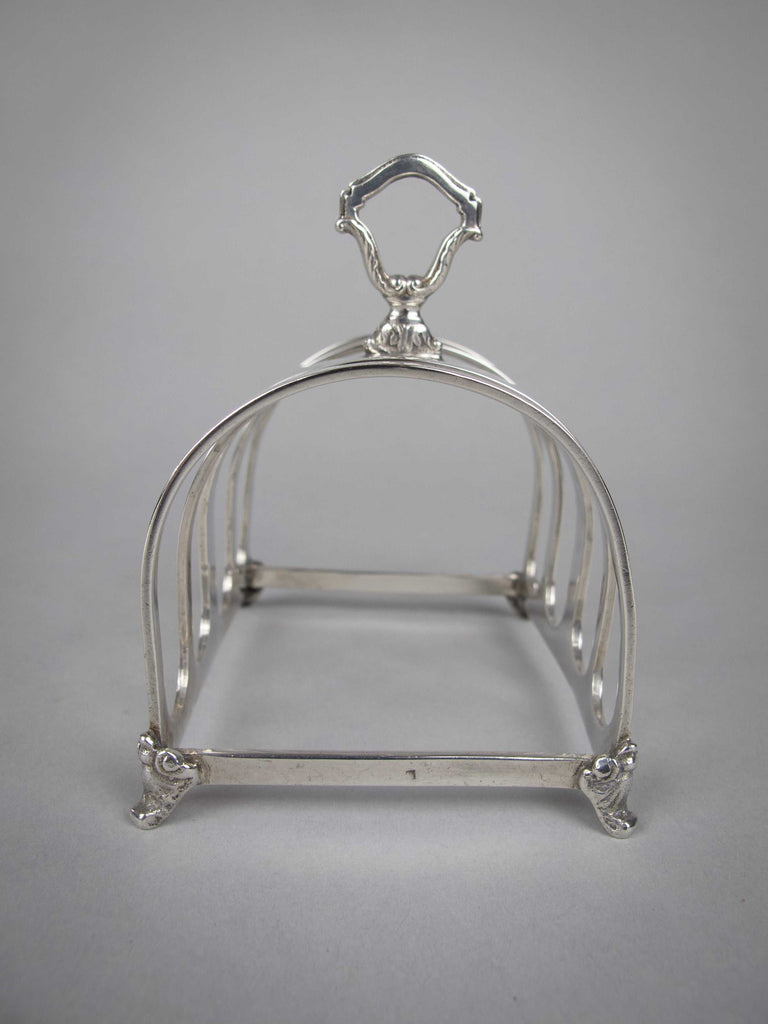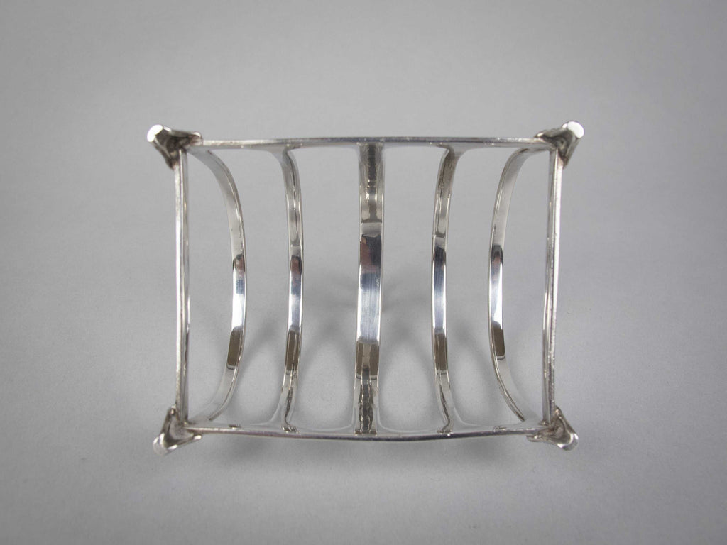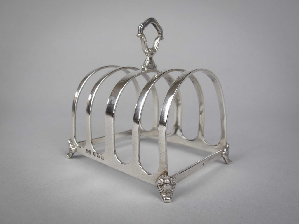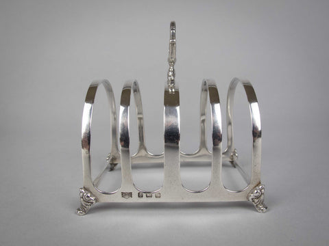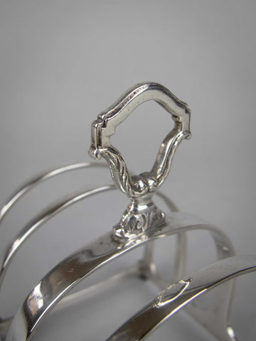 The toast rack boasts raised scroll feet and a handle of matching design. The toast rack has some very small patches of light tarnish to the silver but otherwise remains in a very good condition with clear hallmarks.