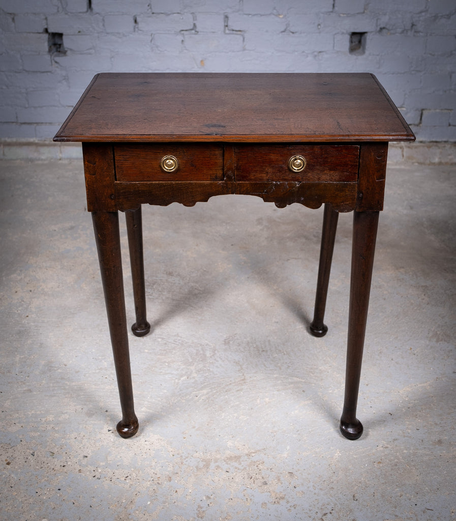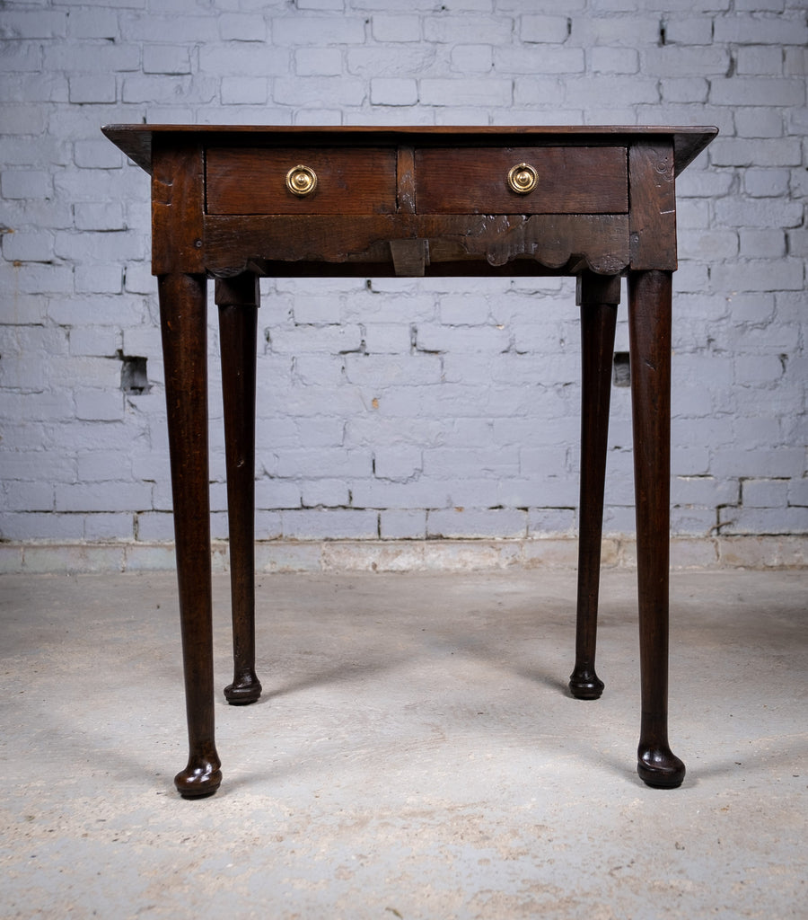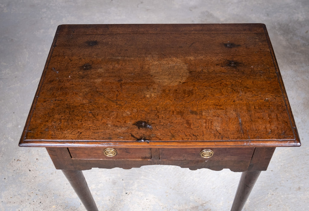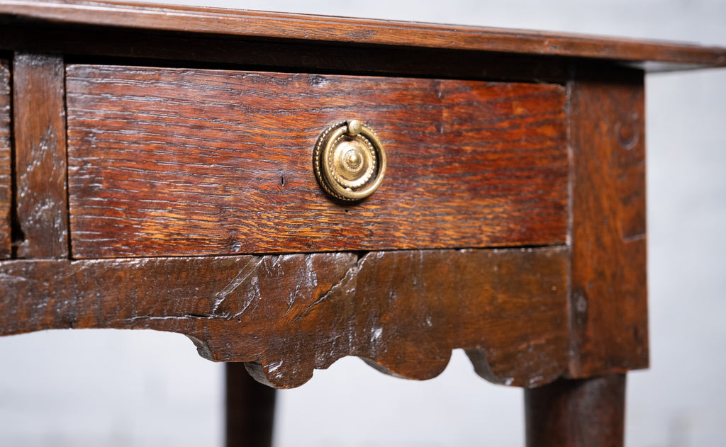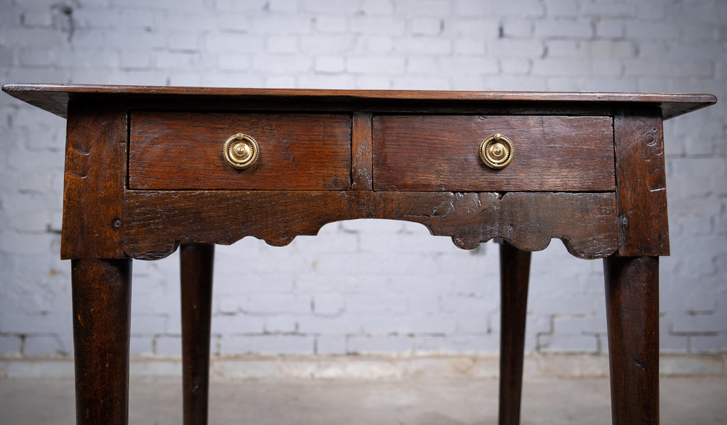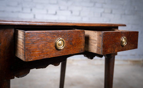 The table boasts two frieze drawers and a shaped apron, all above tapering legs terminating in pad feet. The oak has a lovely colour throughout, with a small section of burr to the front apron which gives the piece wonderful character.