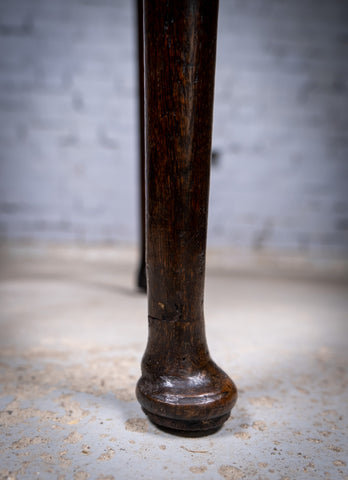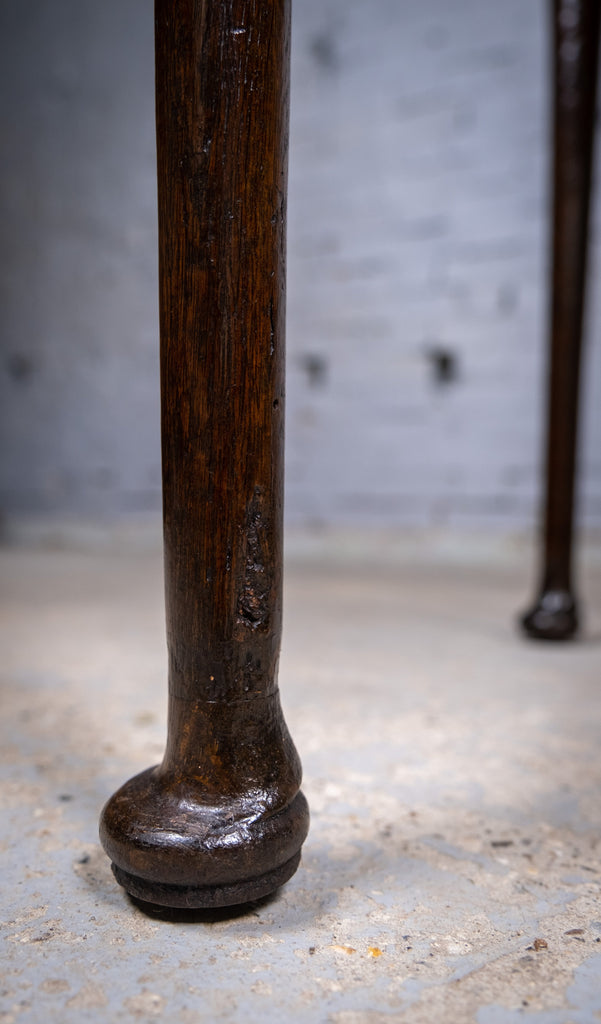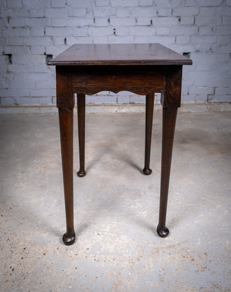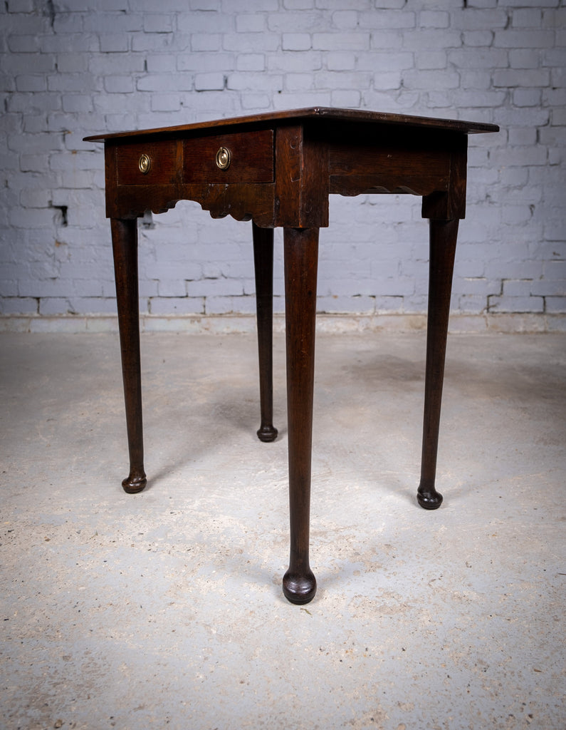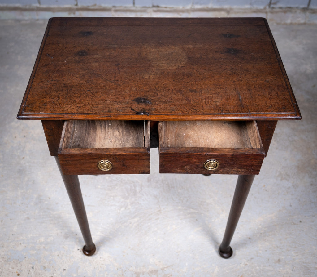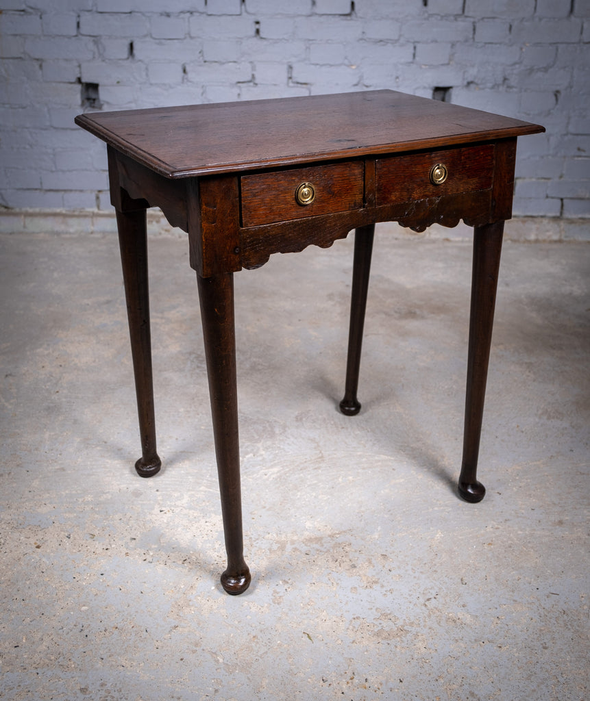 The table boasts two frieze drawers and a shaped apron, all above tapering legs terminating in pad feet. The oak has a lovely colour throughout, with a small section of burr to the front apron which gives the piece wonderful character.