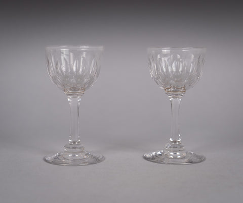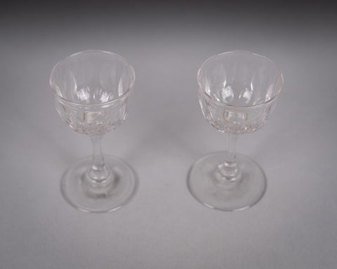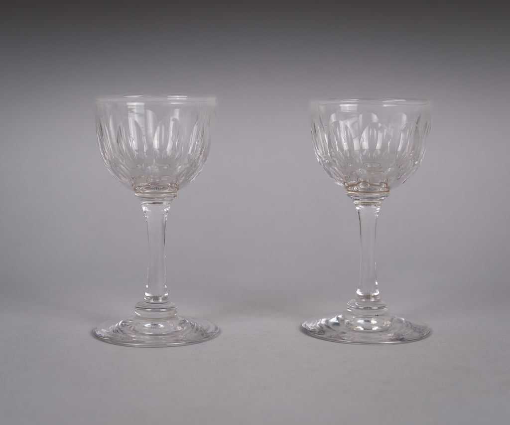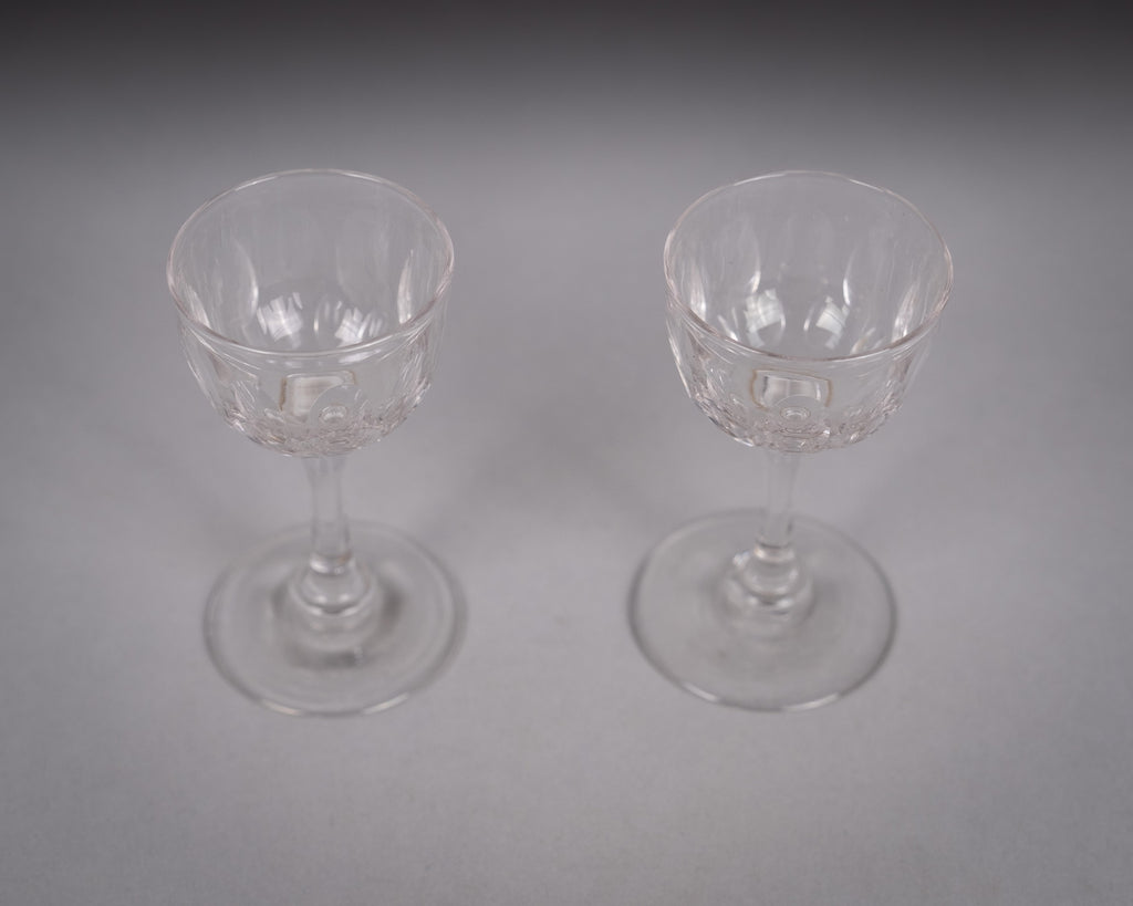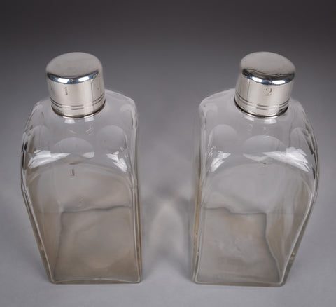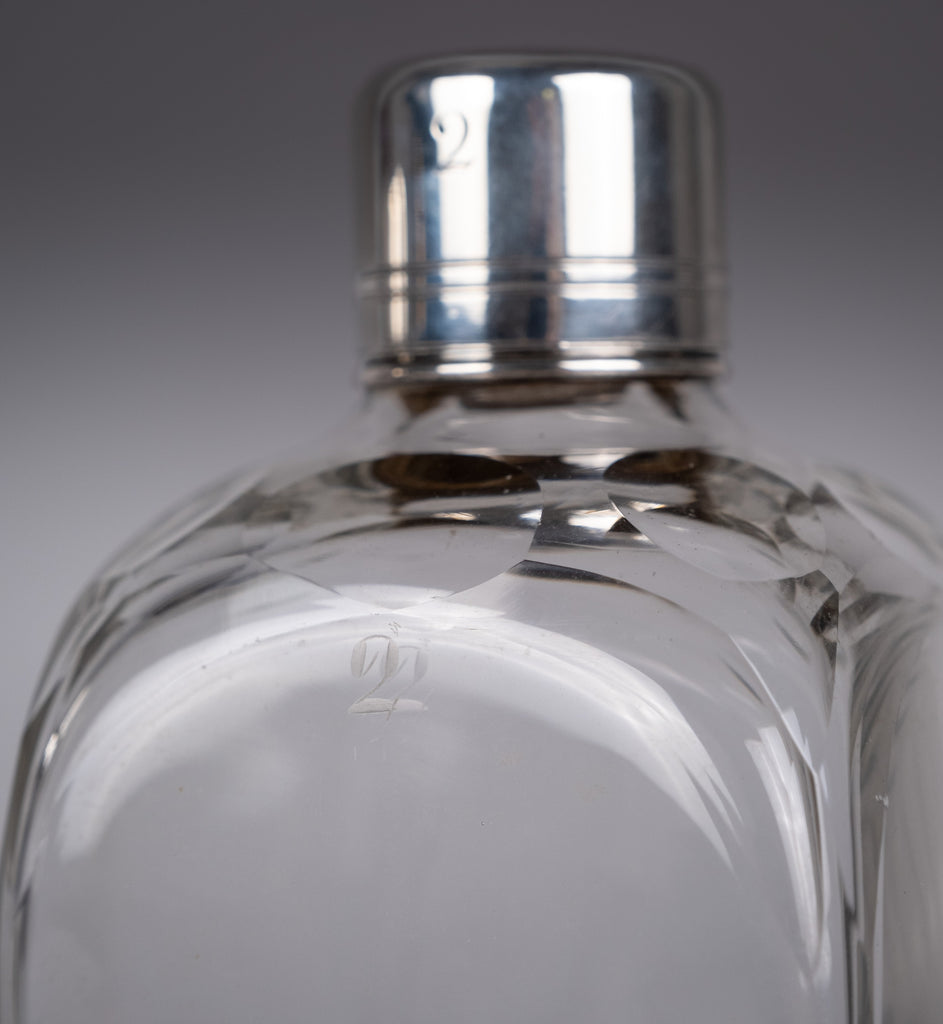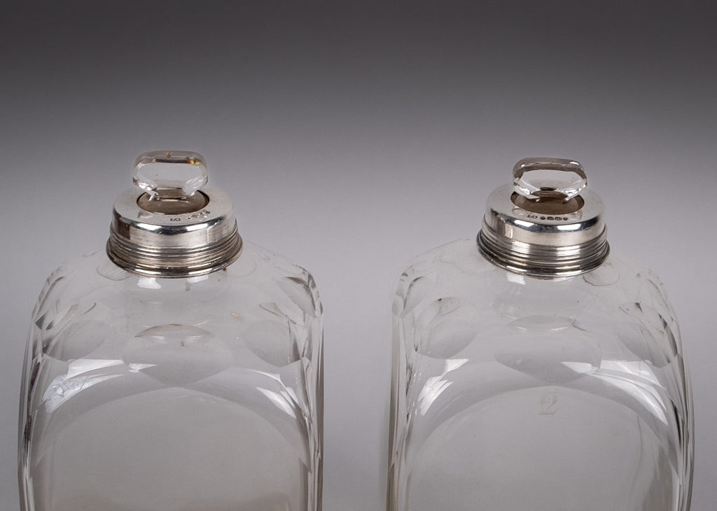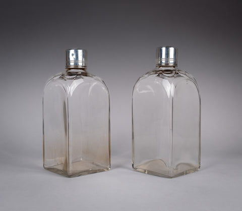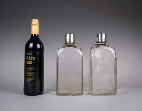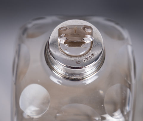 The glasses remain in an impeccable condition, free from any damage. The decanters show some light signs of wear; 'Decanter 1' has a small dink to the silver cap/measure and some discolouration to the glass near the base. 'Decanter 2' has some small nibbles around the 'bubble' design recess and a small chip to the underside (please see photographs). Both decanters' sterling silver screw top cap and rims remain crisp and thus function perfectly.