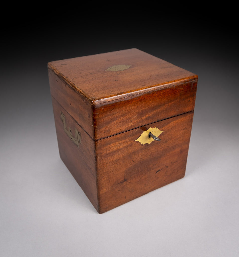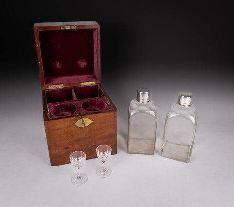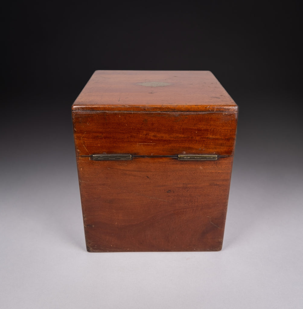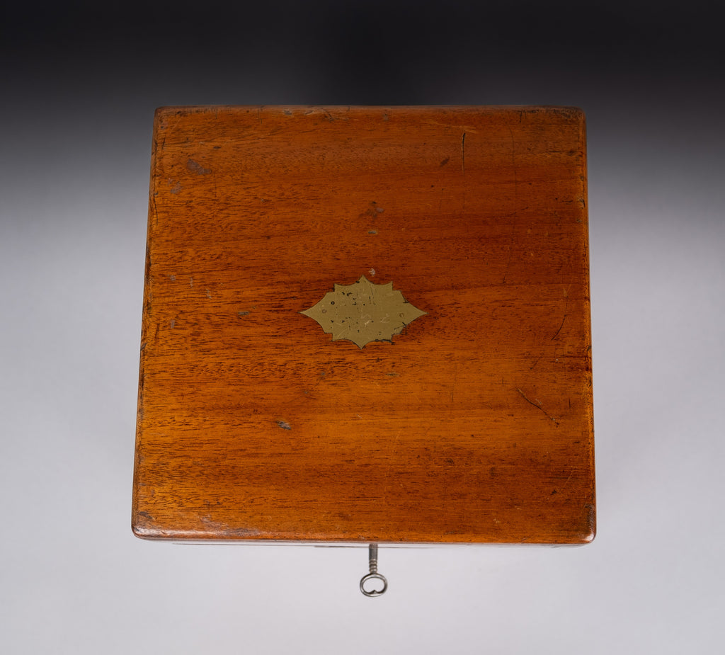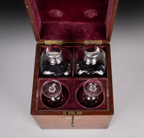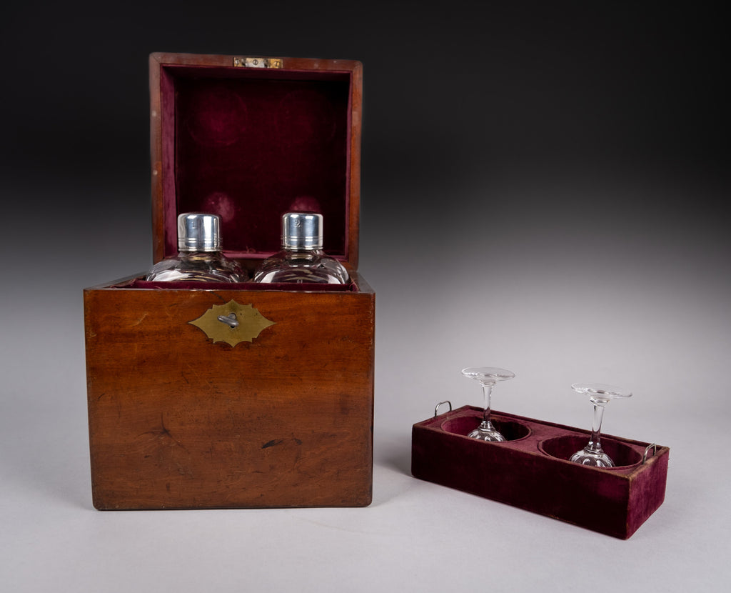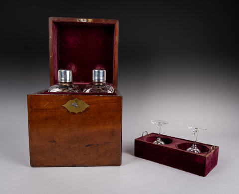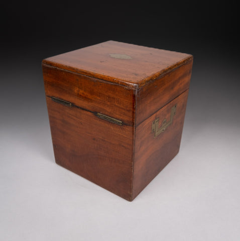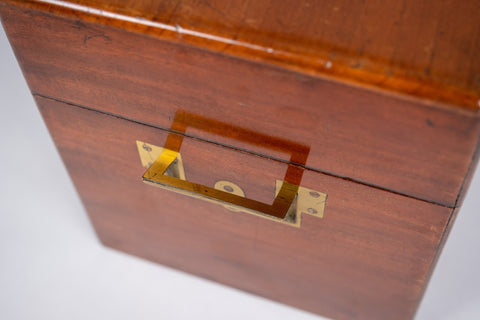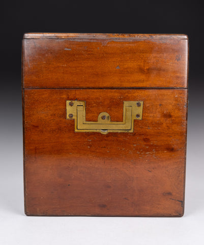 The case itself is a finely made and richly patinated mahogany with brass campaign handles, hinges, escutcheon and a vacant brass cartouche to the lid. Original green baize lining remains present to the base.