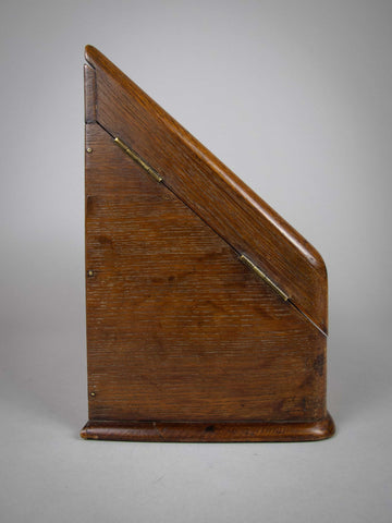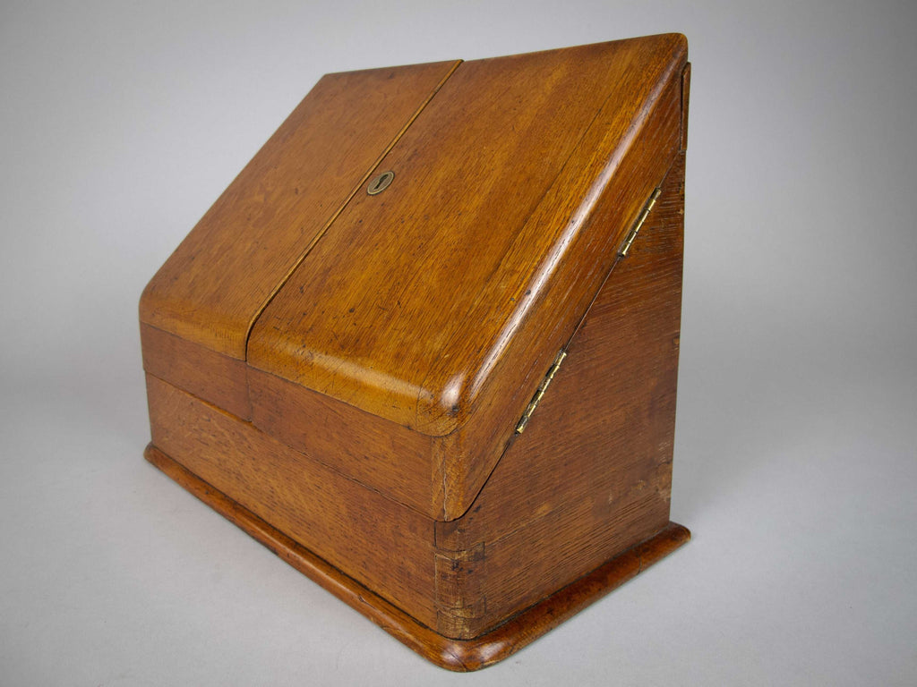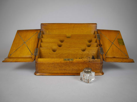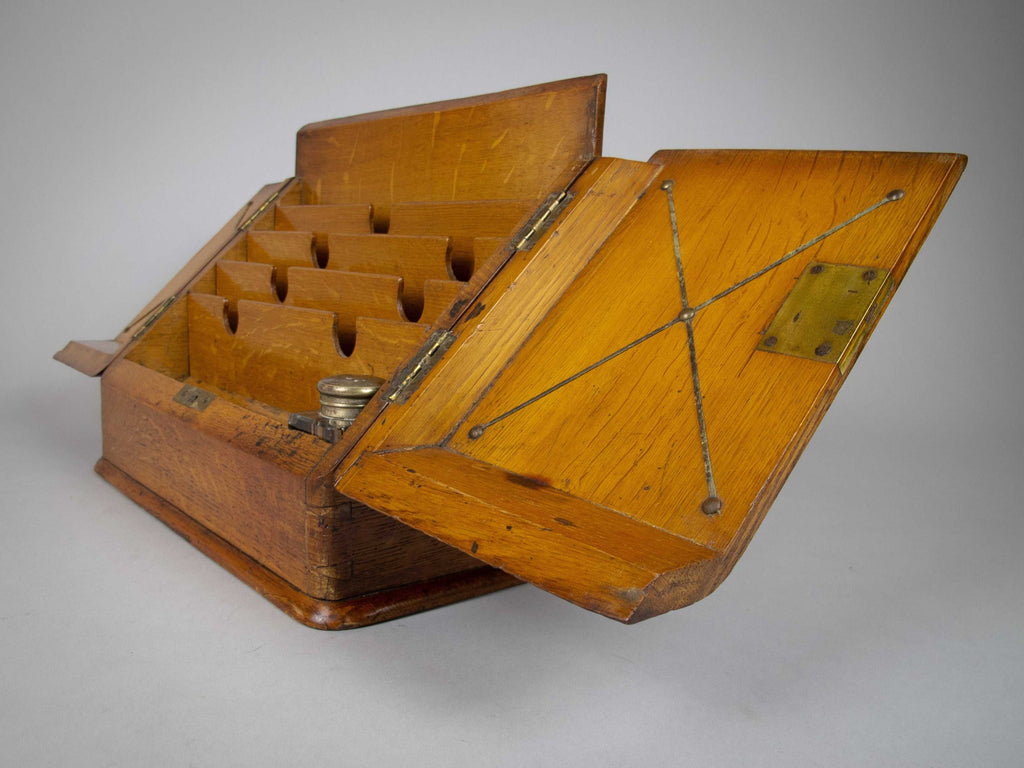 The interior boasts four graduated sections for storing of documents or letters, a pen rest and space for an inkwell (in which an EPNS inkwell currently sits and is included). The fold out doors provide shelves for additional letter storage, writing or reading.