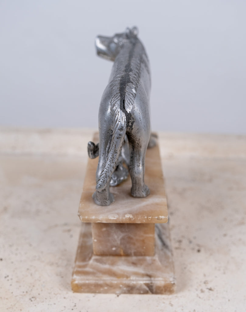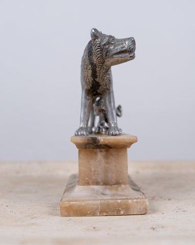 A late 19th/early 20th century Grand Tour silvered metal model of the Capitoline Wolf upon an alabaster base.