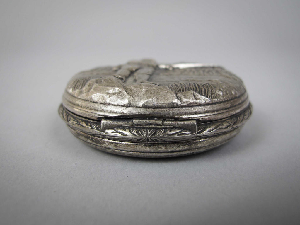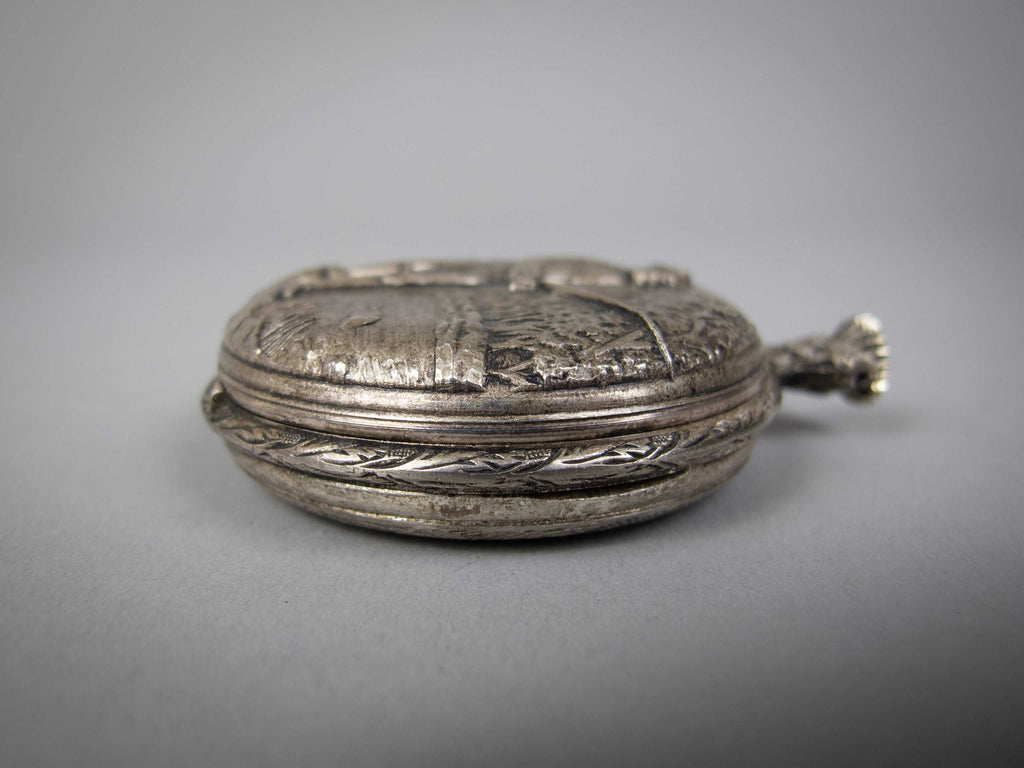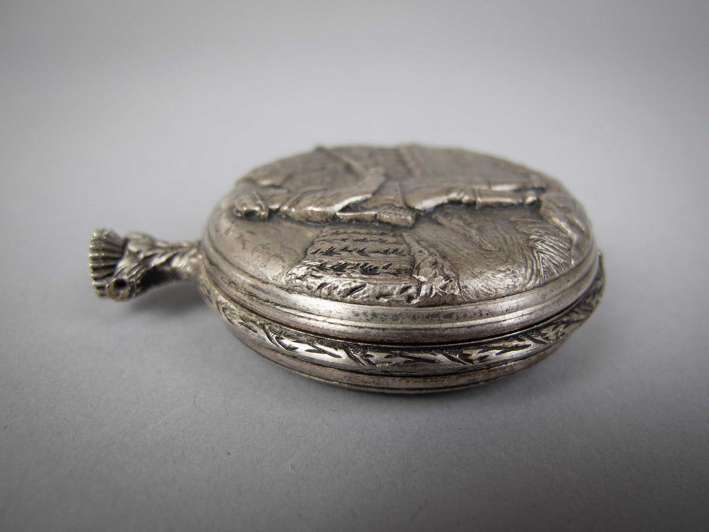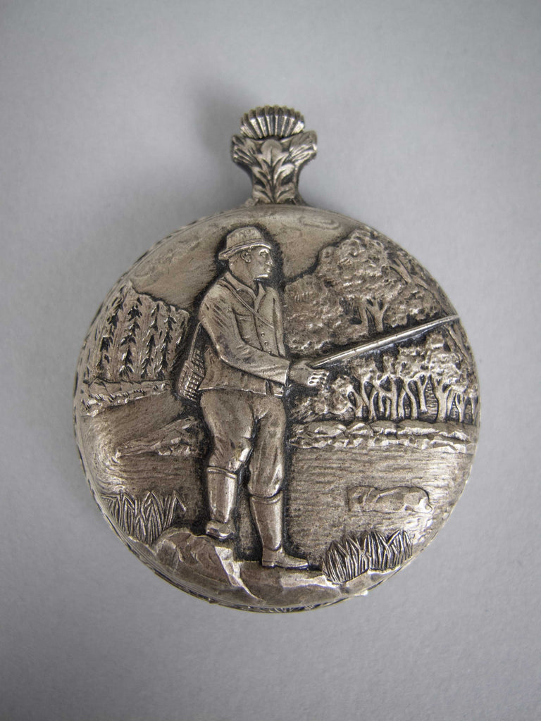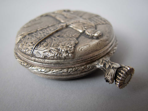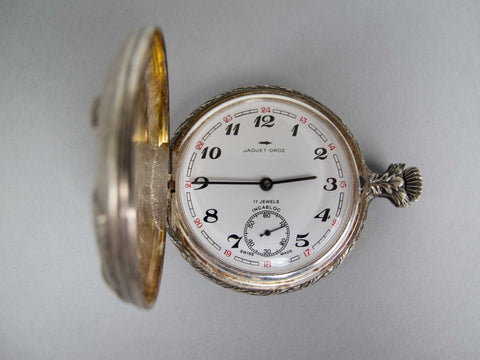 A Jacquet Droz 17 jewel pocket watch, with ornately decorated full hunter case depicting a fisherman. Swiss made with Incabloc movement. C.1970s.