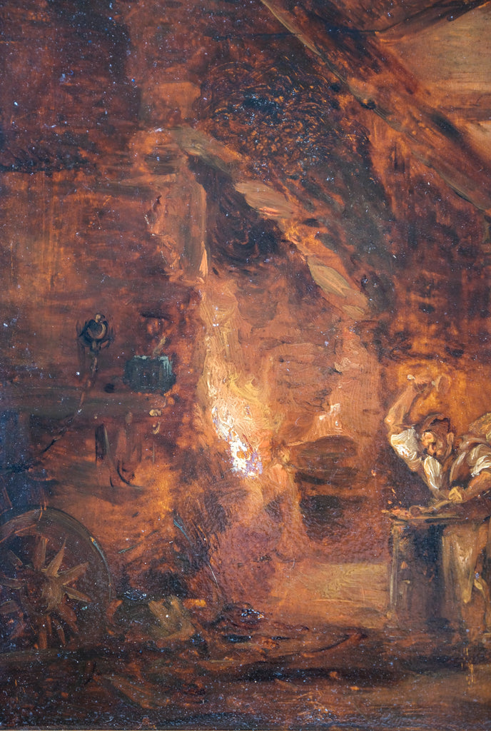 John Jospeh Barker was primarily a painter of landscapes and although he has been known to paint interior scenes, they are usually sentimental thus this work is a departure from his usual subject. Barker has painted fireplaces as part of interior scenes as well as autumnal landscapes, thus it is as if he has drawn on his knowledge and skill in using the orange colour palette to create this intricate work which exhibits the painting of fire and ambient light so beautifully.