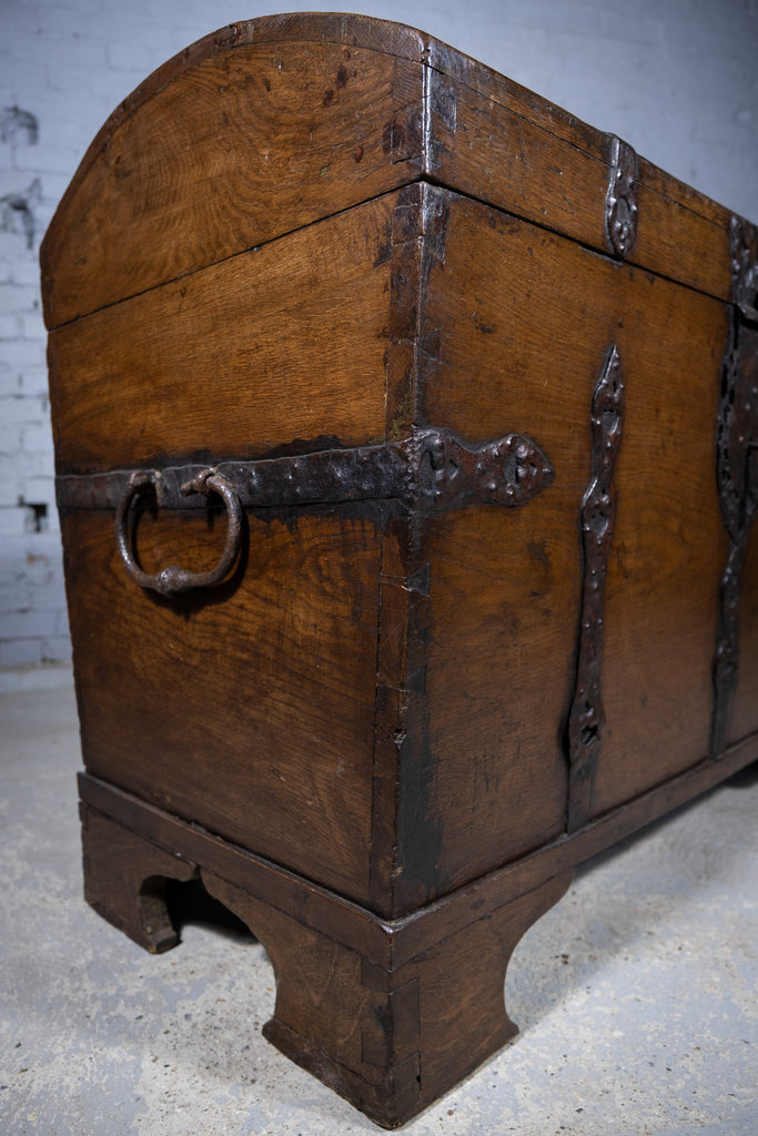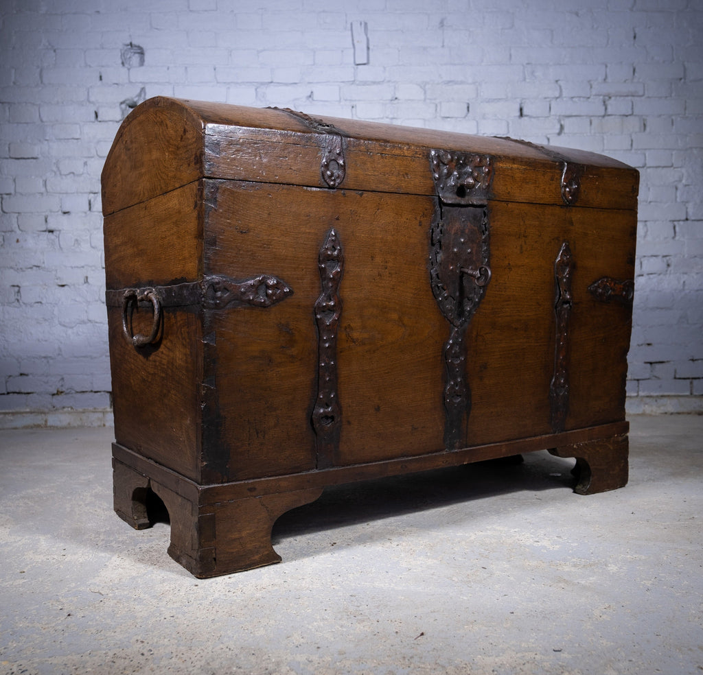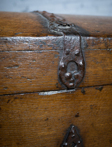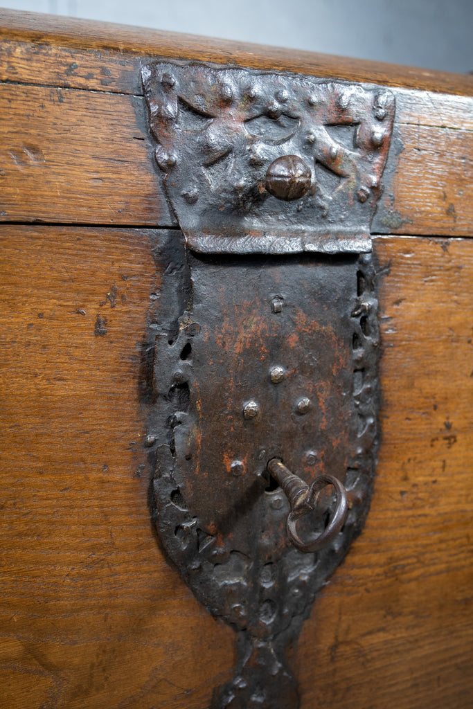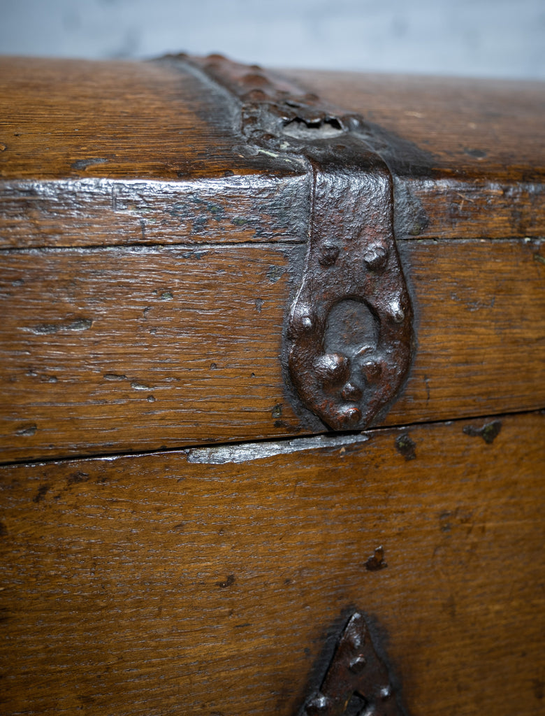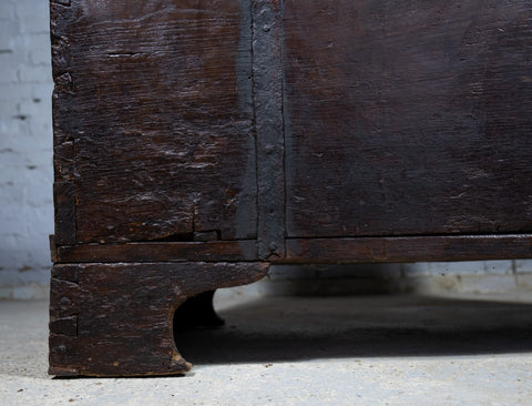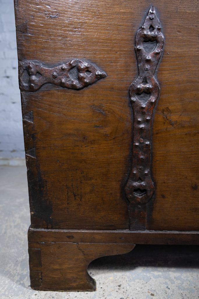 The chest is very substantial and boasts a truly exceptional colour throughout to both the oak and iron work. The original key is striking in itself and the lock still functions perfectly - auto locking when closed. The interior remains in a very good condition with a later hinged candle box to the left side. The chest sits upon later bracket feet; a historic and sympathetic addition which replicates the dovetailing of the chest to each corner.