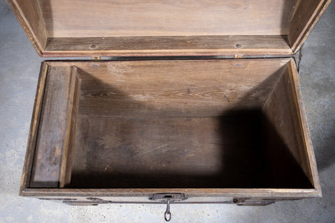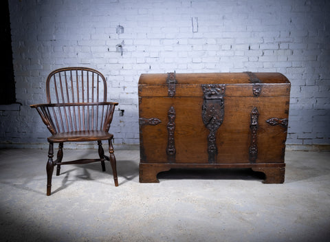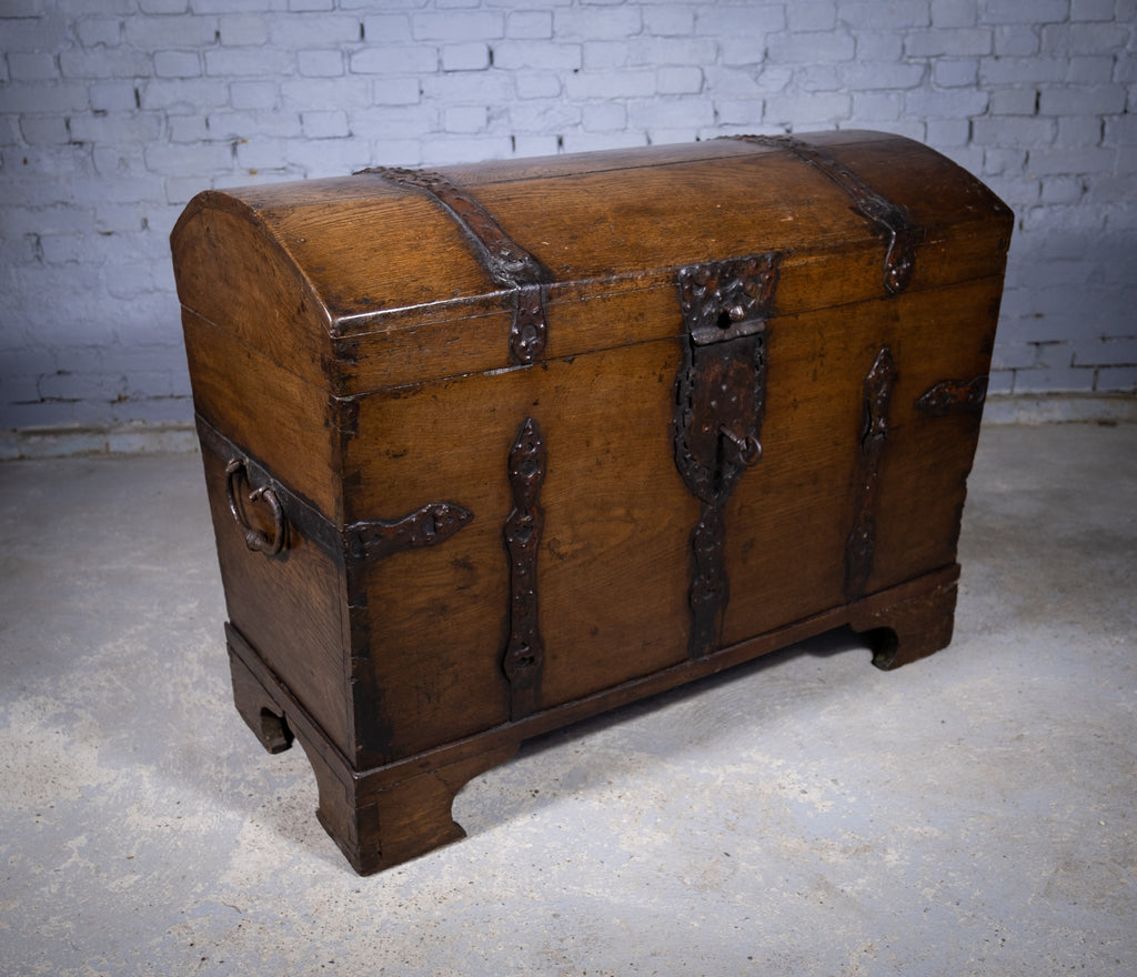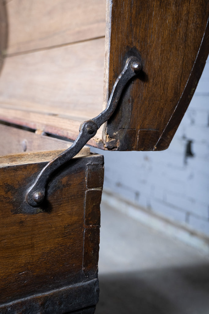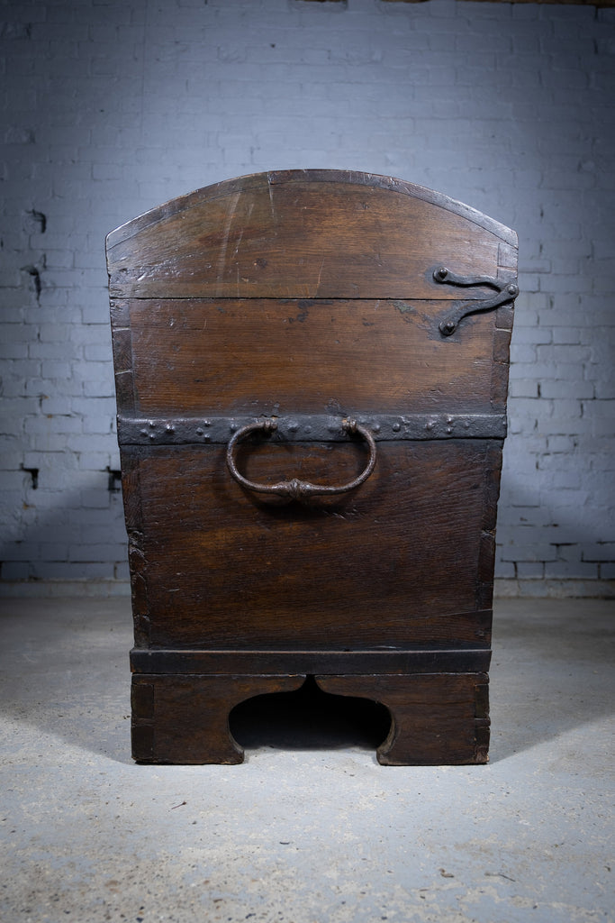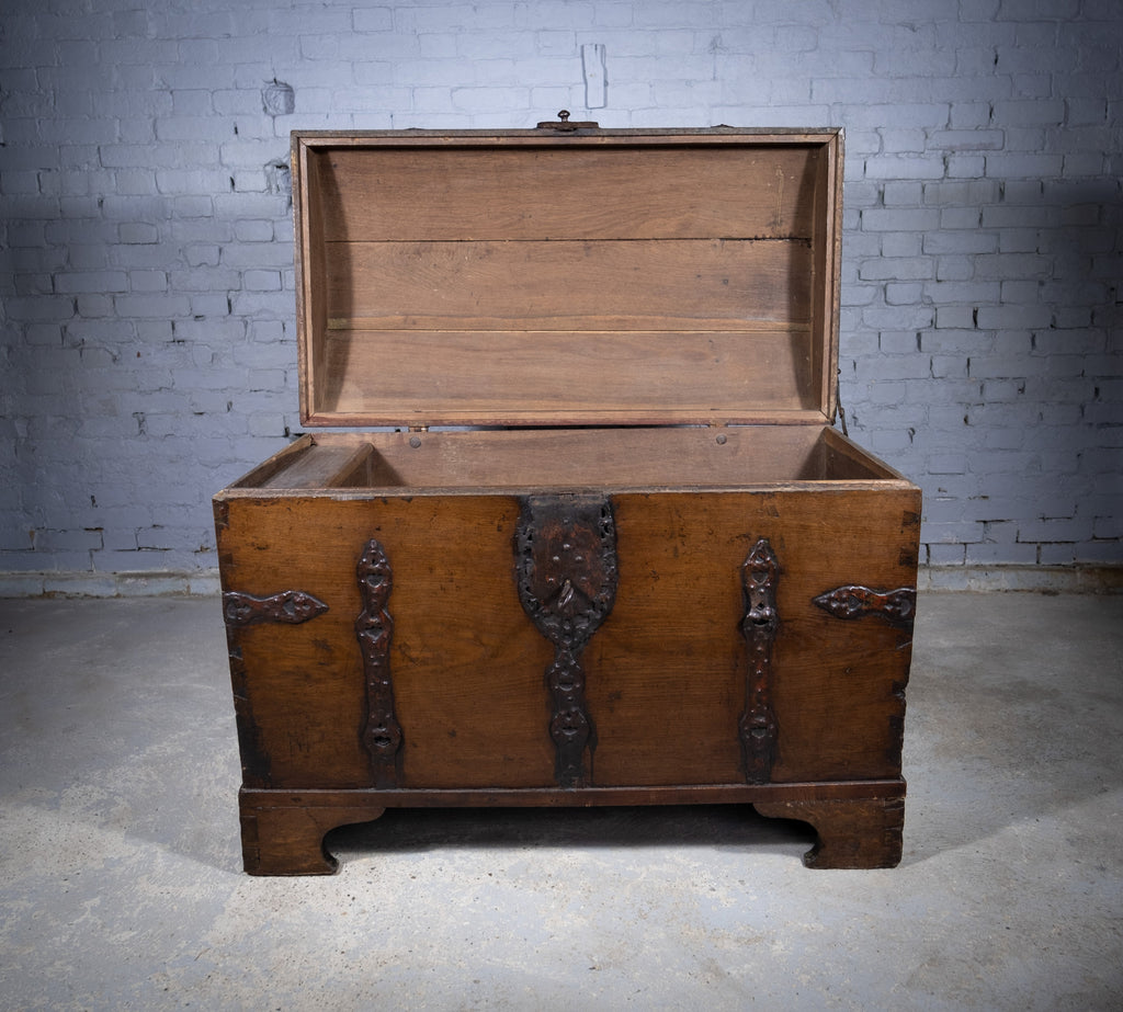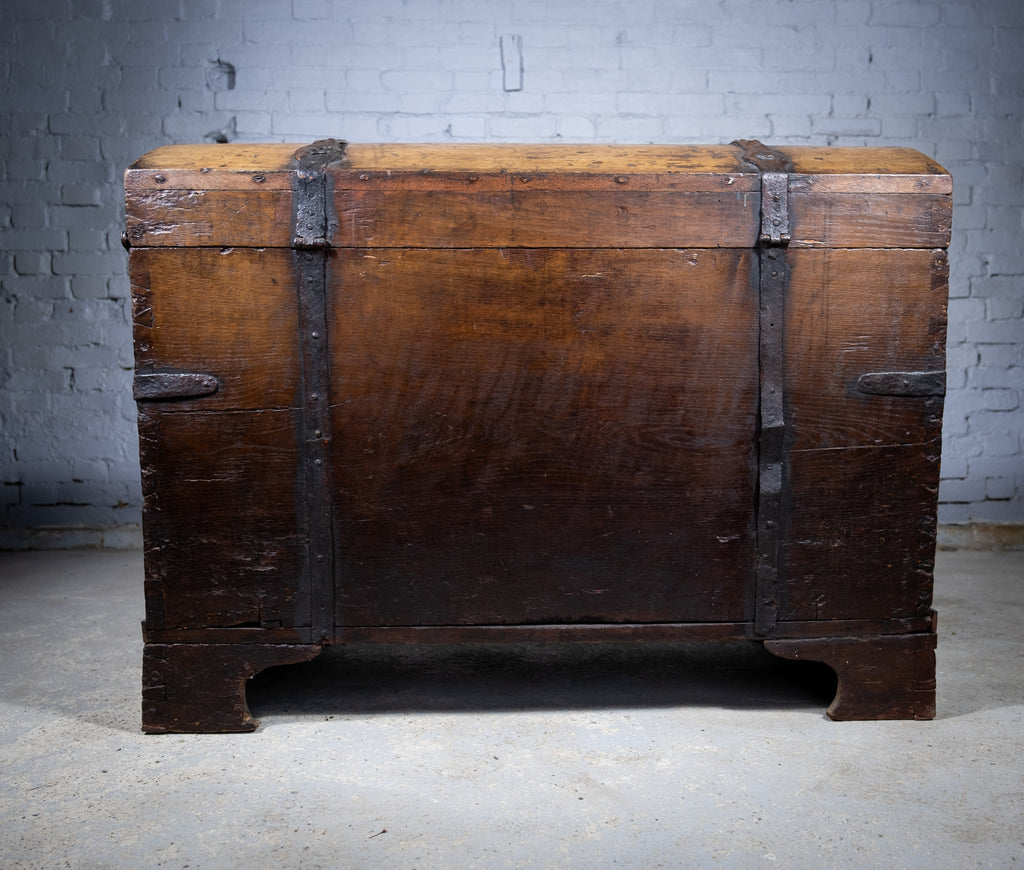 The chest is very substantial and boasts a truly exceptional colour throughout to both the oak and iron work. The original key is striking in itself and the lock still functions perfectly - auto locking when closed. The interior remains in a very good condition with a later hinged candle box to the left side. The chest sits upon later bracket feet; a historic and sympathetic addition which replicates the dovetailing of the chest to each corner.