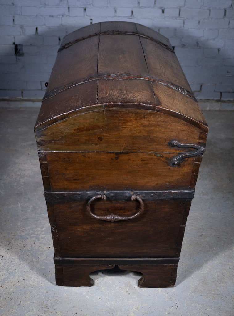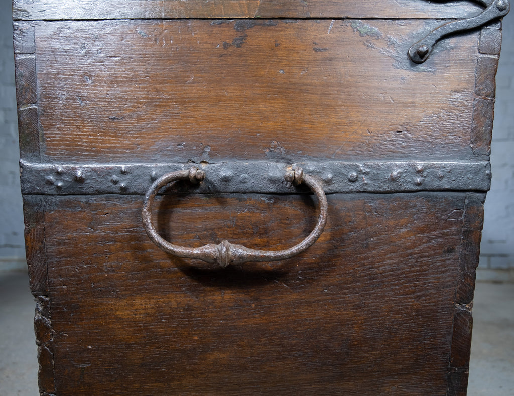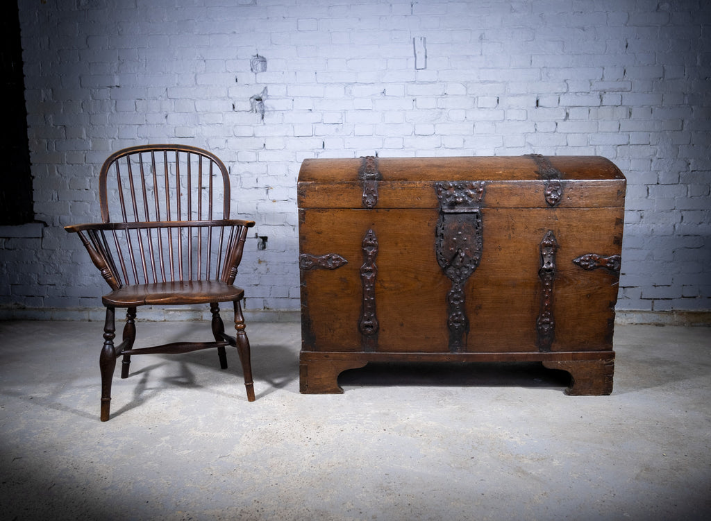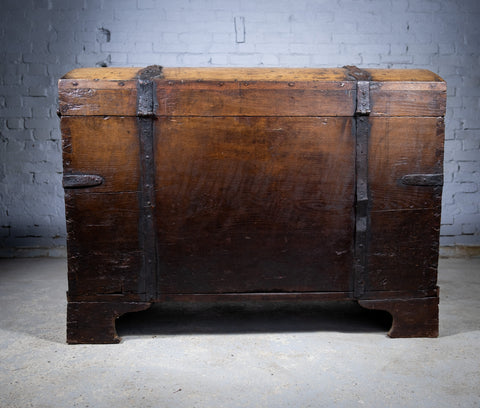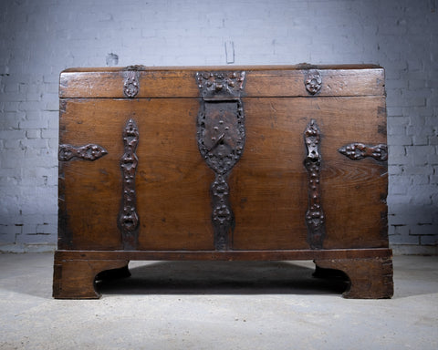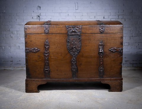 An outstanding 17th century oak and iron bound baroque chest of continental origin (probably German) of very large proportions, complete with its original key. Circa. 1700.