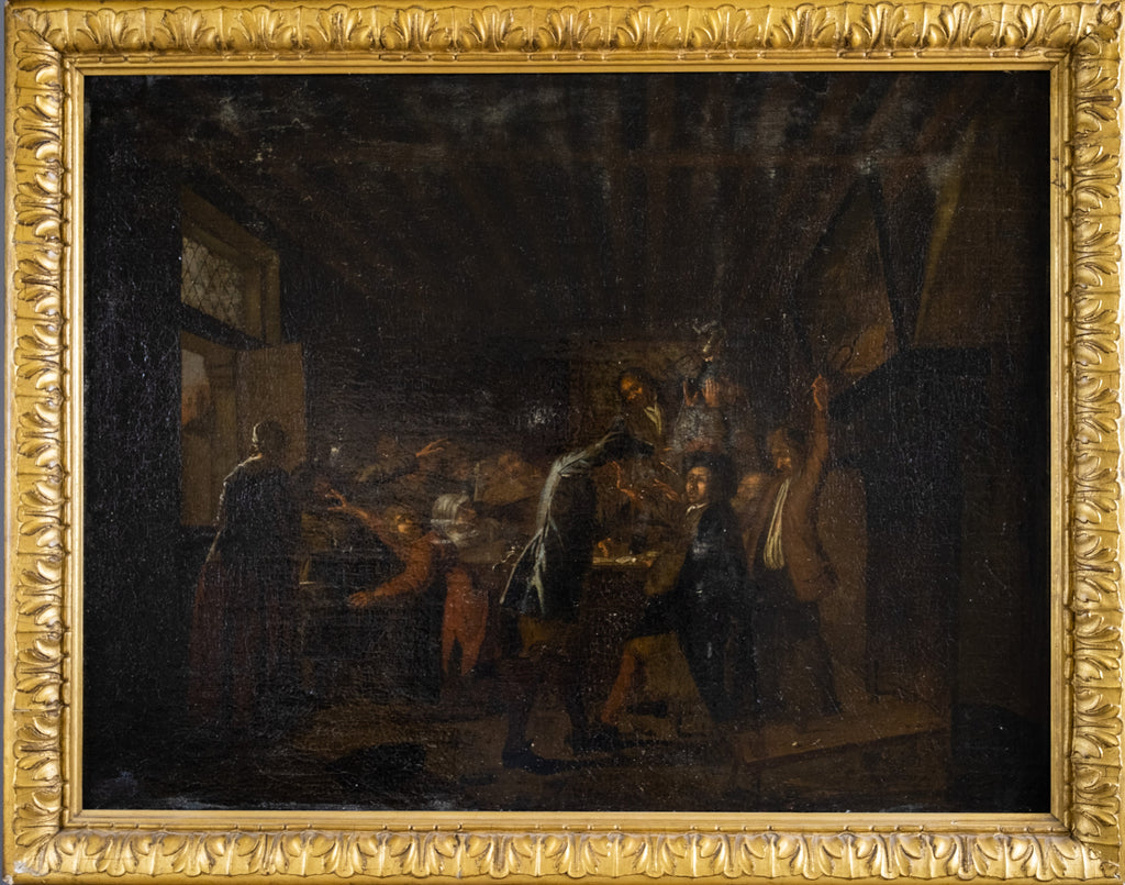 A large 18th century oil on canvas in the manner of Pieter Jansz Quast (1605-1647) depicting a tavern scene in which patrons are fighting over a card game.