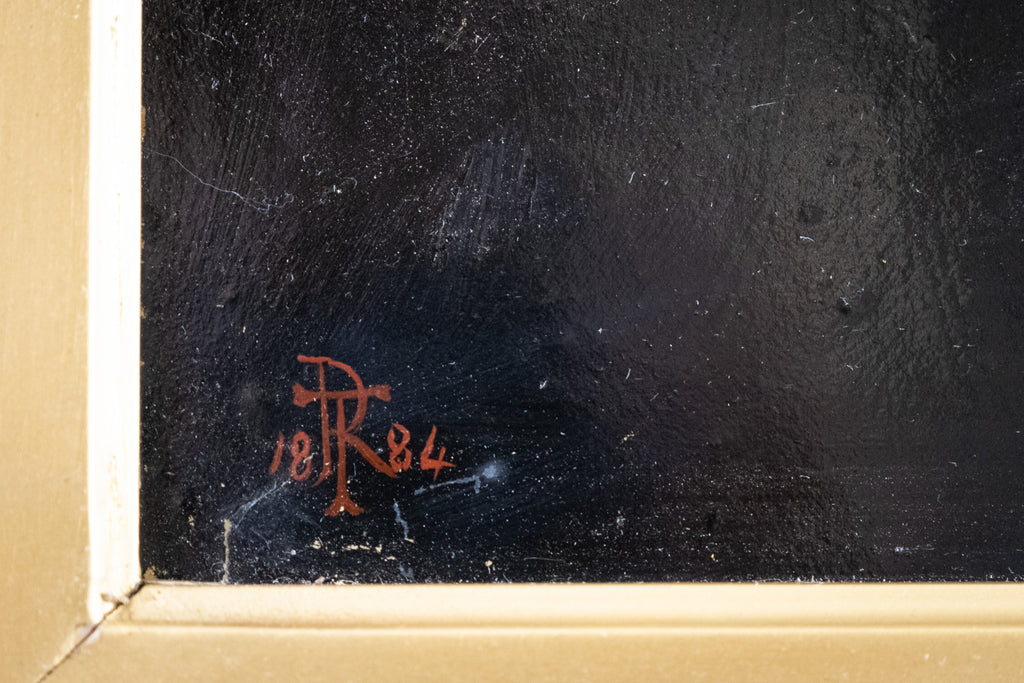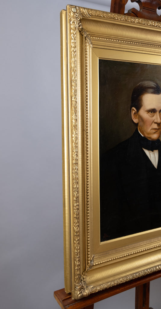A large 19th century English School portrait of a seated gentleman in a black suit, housed in an attractive and substantial gilt frame. The work is monogrammed 'RT' and dated 1884 to the lower left corner. The work has undergone restoration with the restorer's stamp evident verso (Phil J Simmonds & Sons, Essex).