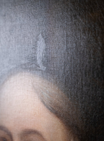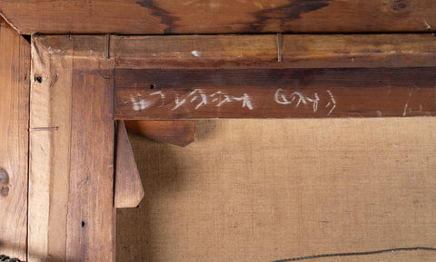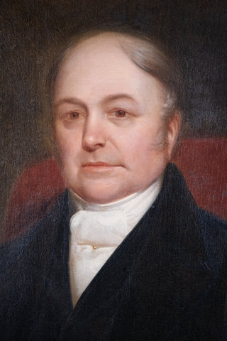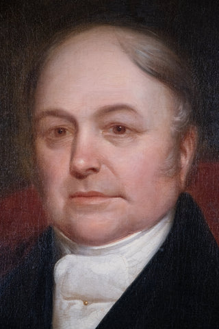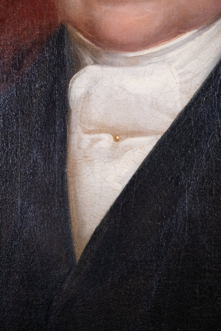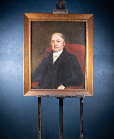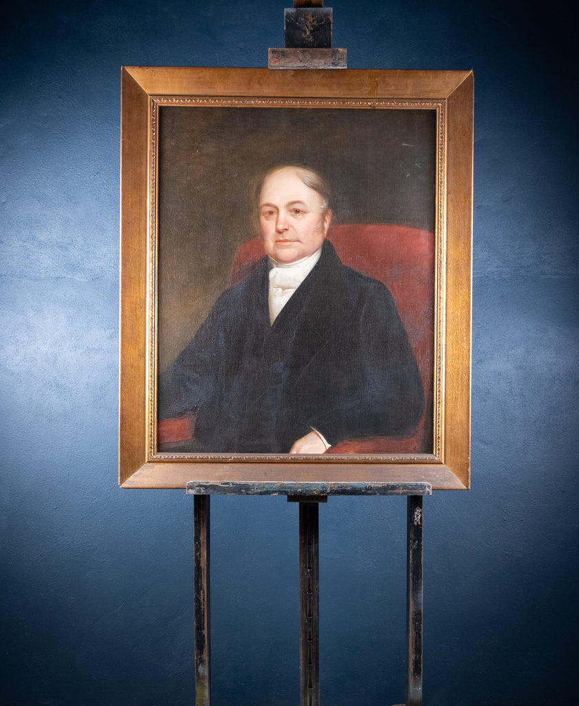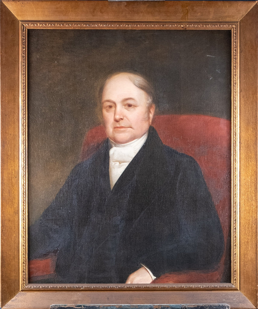 The subject is a well-dressed gentleman of middle age dressed in a black suit, white shirt and seated in a red reading chair. The body is loosely painted, however the face and neck show more attention to detail with the face in particular showing wonderful verve. There is some evidence of historic repair/restoration in areas (please see photographs).