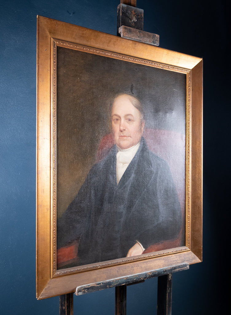 A large mid-19th century portrait of a gentleman in a gilt frame. English School. Oil on canvas. 'Fred Keetch' is inscribed verso with the reference number 'T1350', likely for the Fred Keetch Gallery, Exeter (now of Exmouth), Devon.