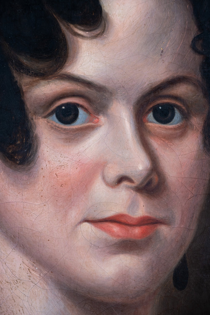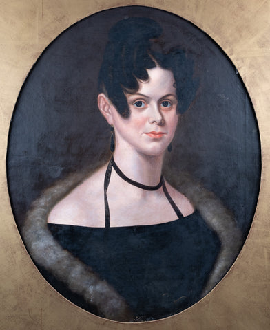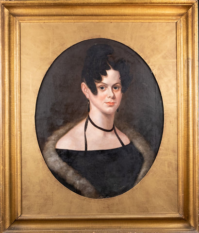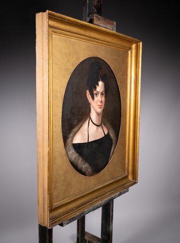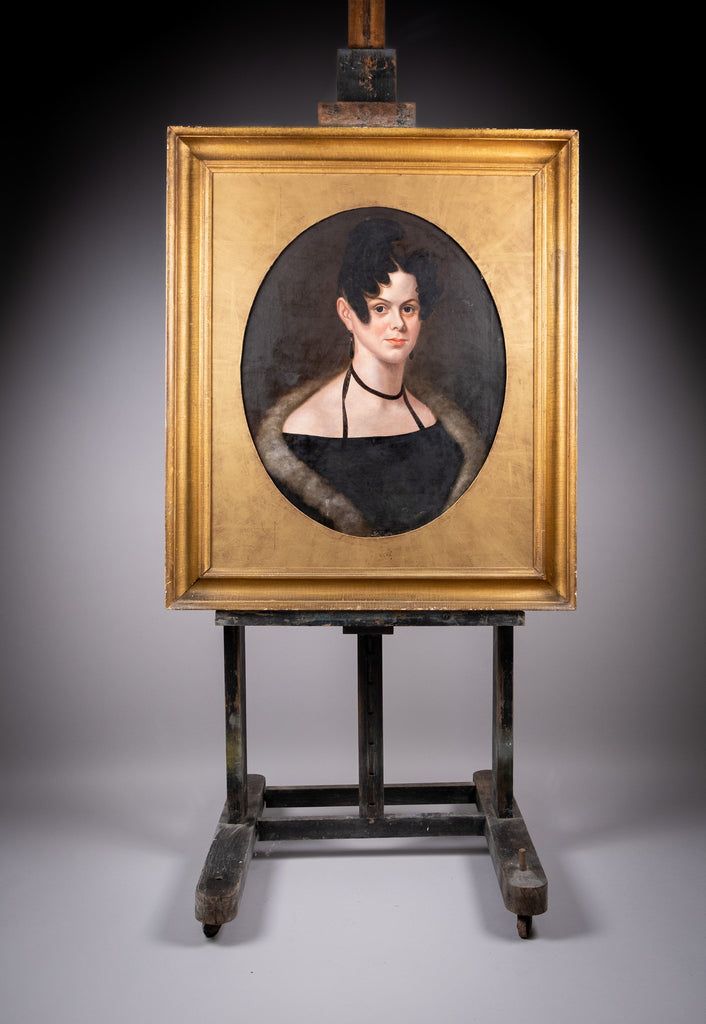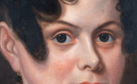 The work is naively painted but the artist has captured a charming expression in the sitter, almost on the cusp of a smirk. There is light craquelure throughout and apparent overpainting in areas. The work is housed in its original gilt wood frame which remains in a very good condition.